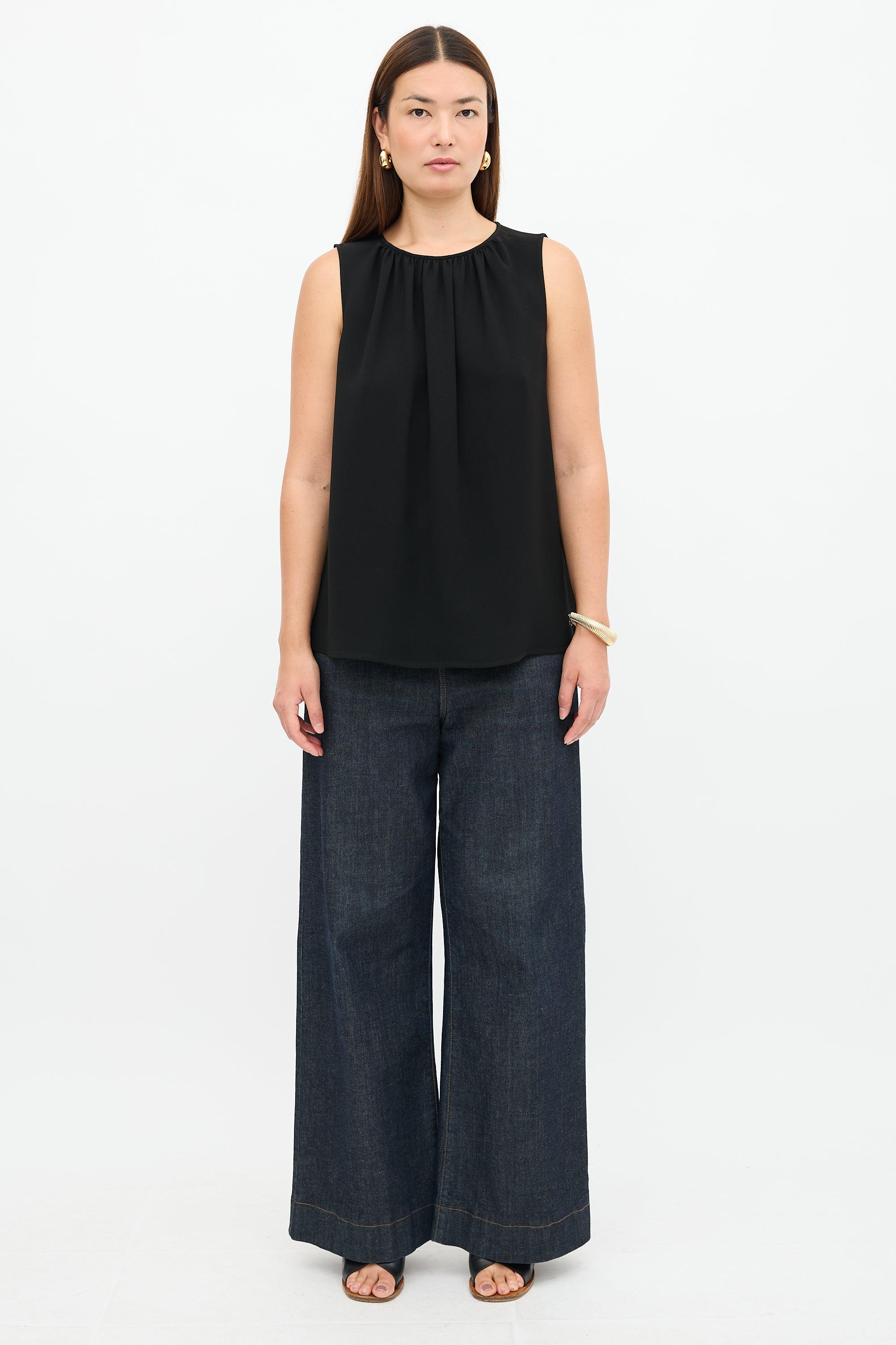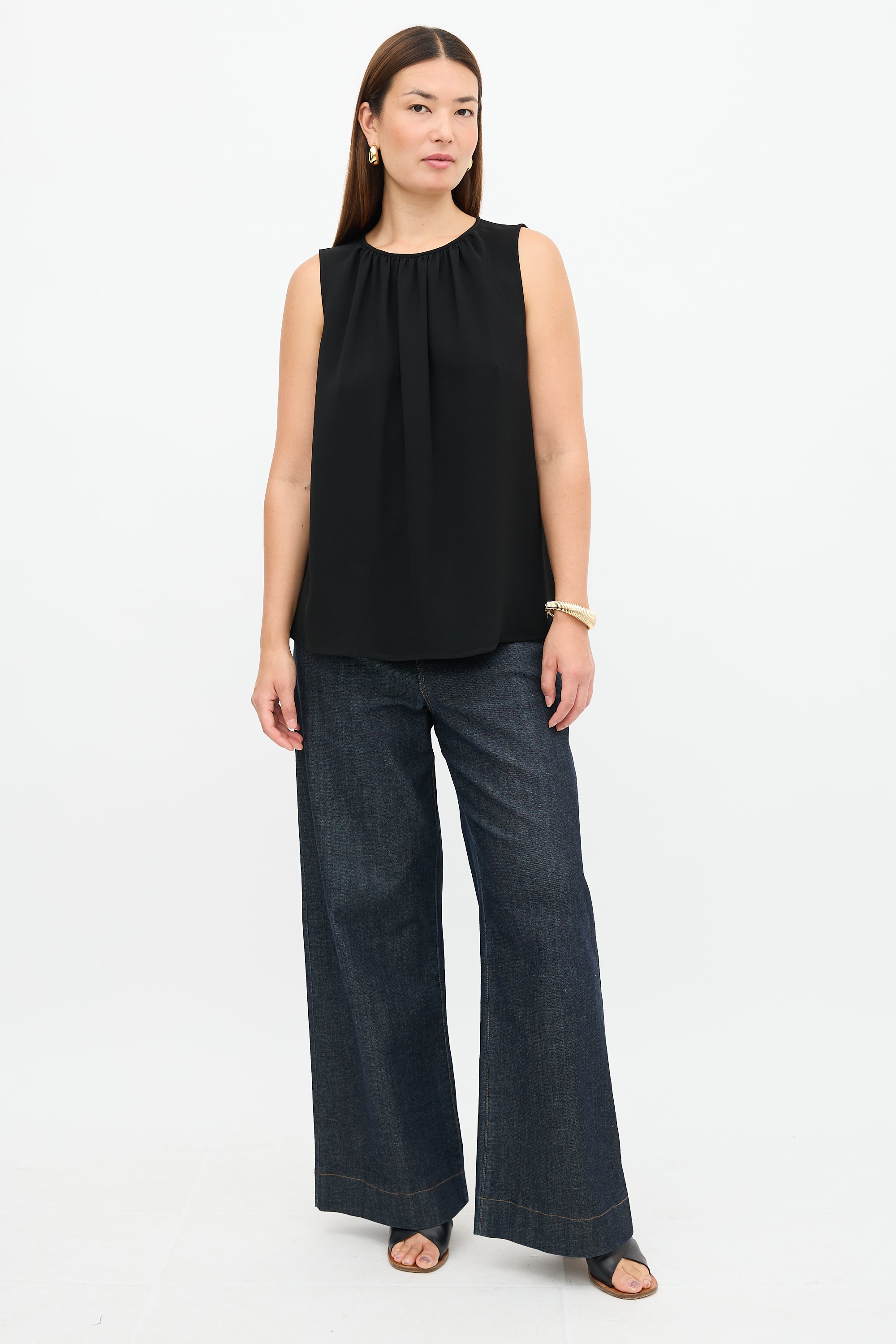 Pre-owned Lafayette 148 black crepe sleeveless blouse featuring gathered neckline, back keyhole with top button closure, and side vents.