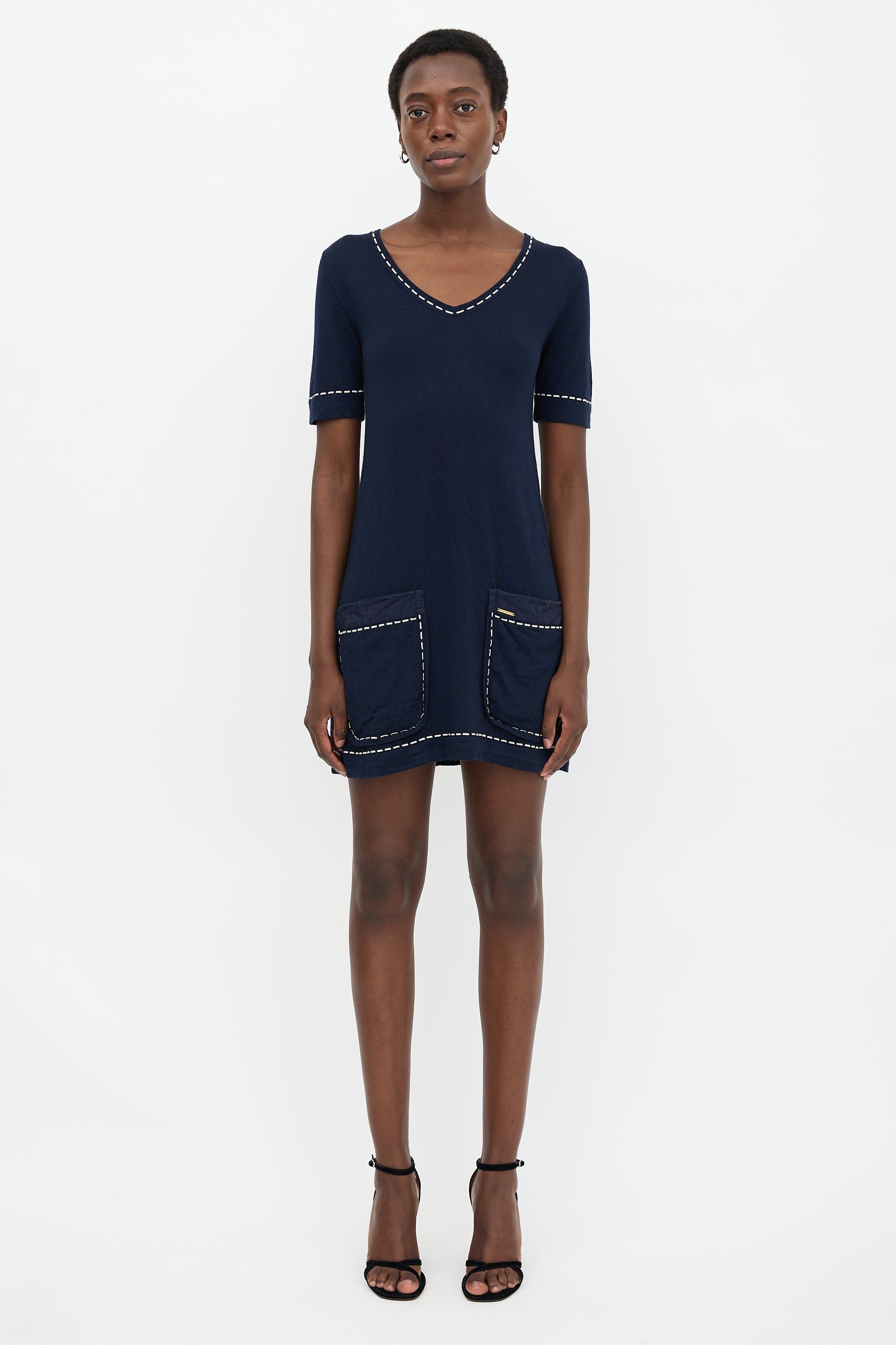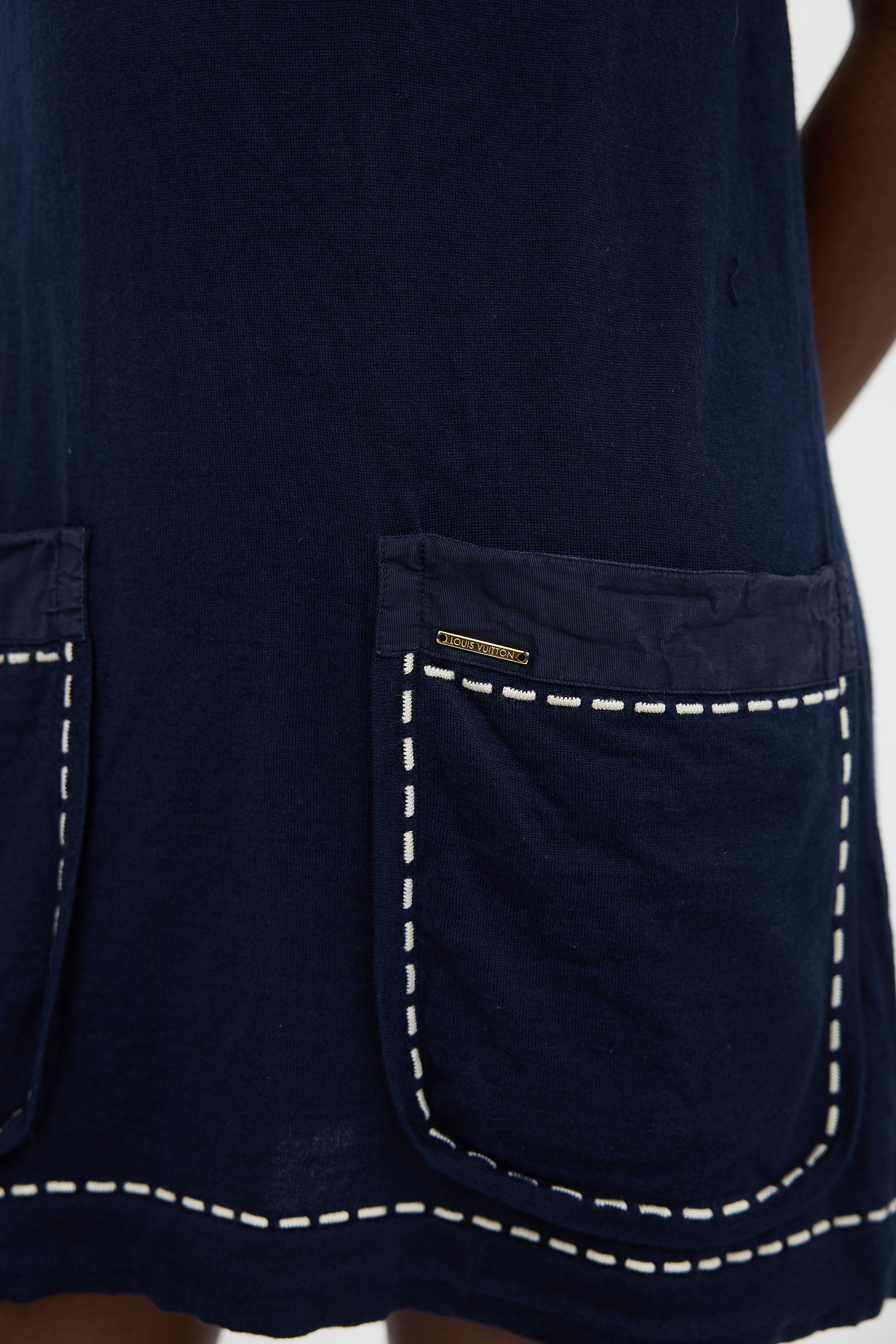 Pre-owned Louis Vuitton navy cashmere, silk, and wool knit dress featuring white dash intarsia trim, V-neckline, patch pockets, and gold tone logo embellishment at left pocket.