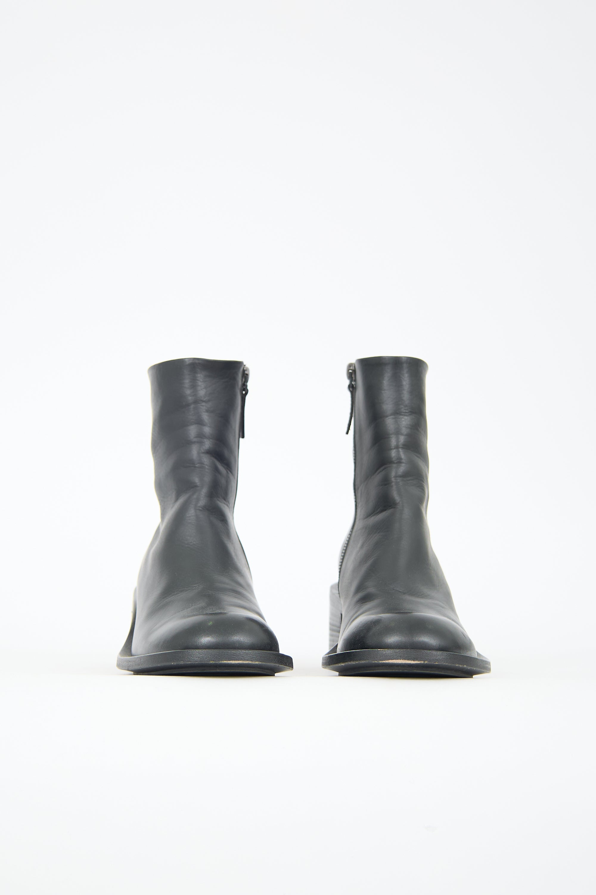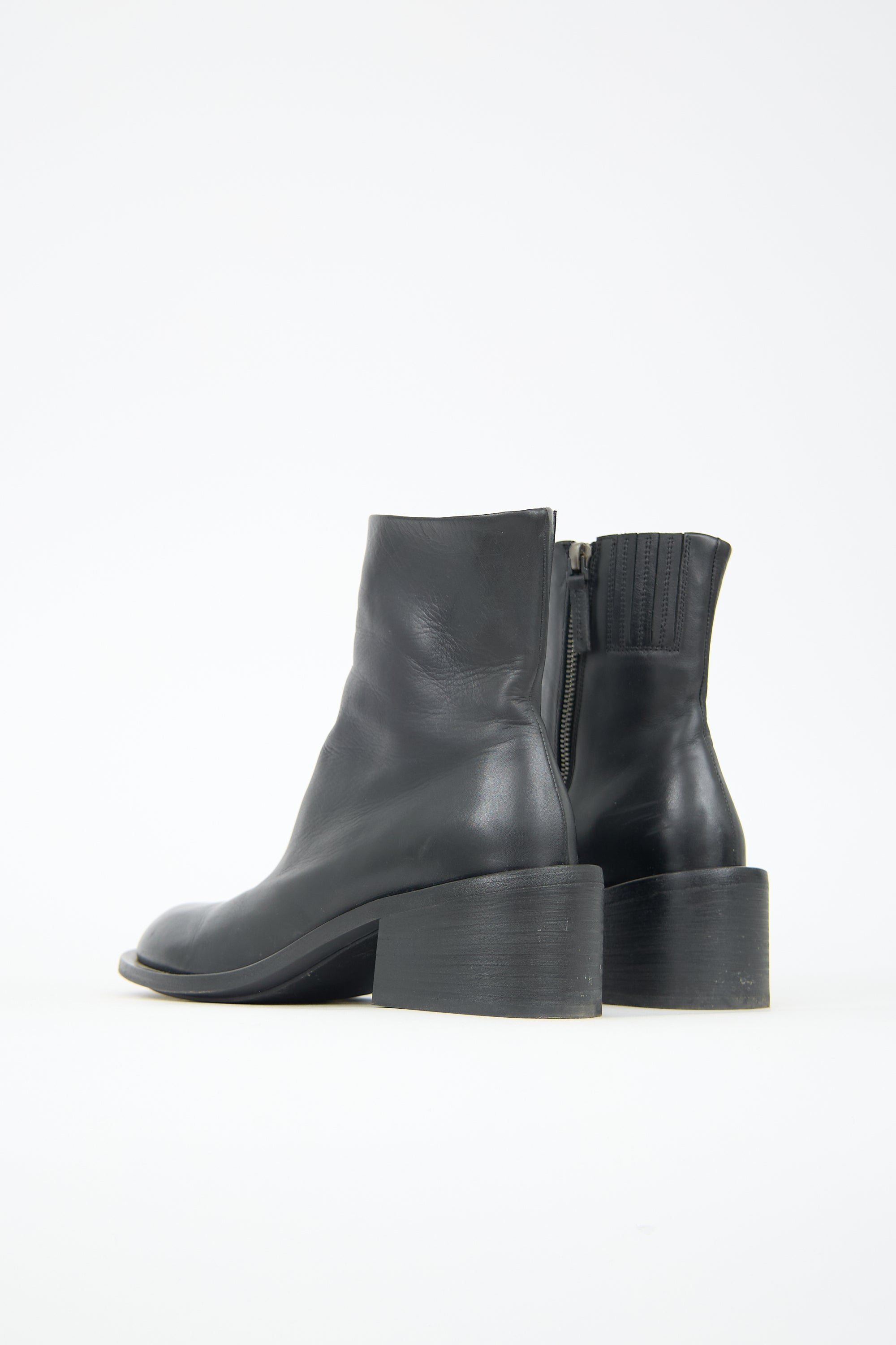 Pre-owned Marsèll black leather ankle boots featuring rounded toe, covered elastic panel at inner collar, inner side zip closure, and tonal wooden sole with block heel.