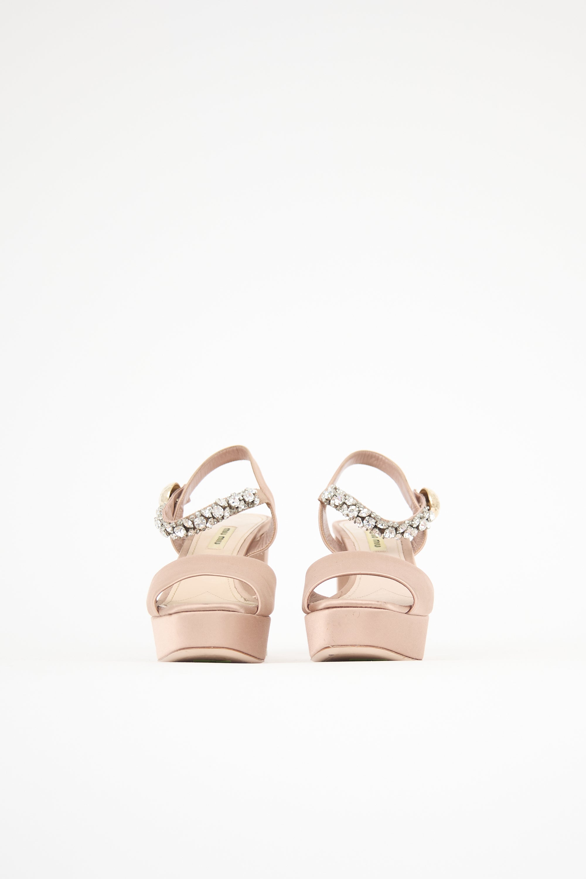 Pre-owned Miu Miu pink satin platform sandals featuring an open rounded toe, strap across vamp, elasticized ankle strap with crystal embellishments, and a covered platform and block heel.