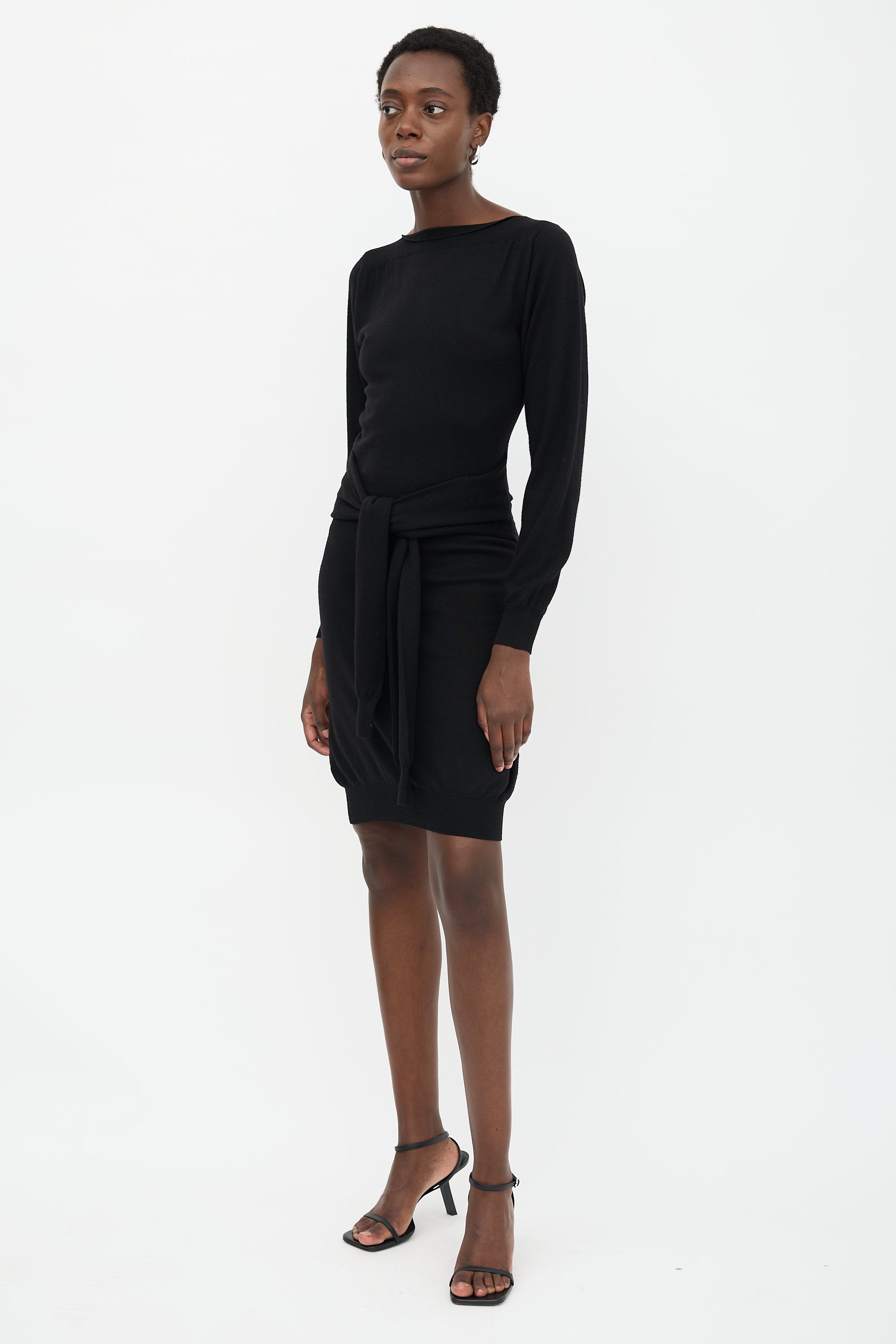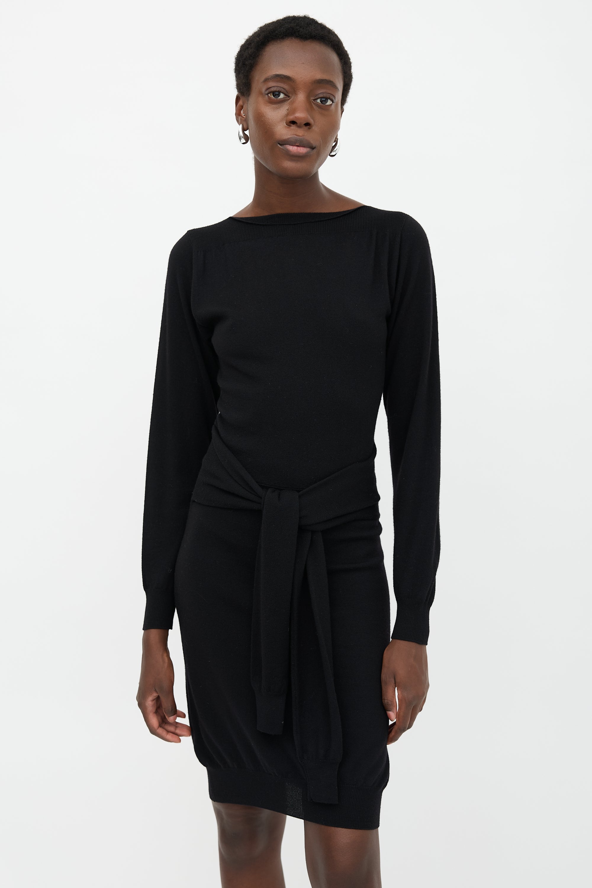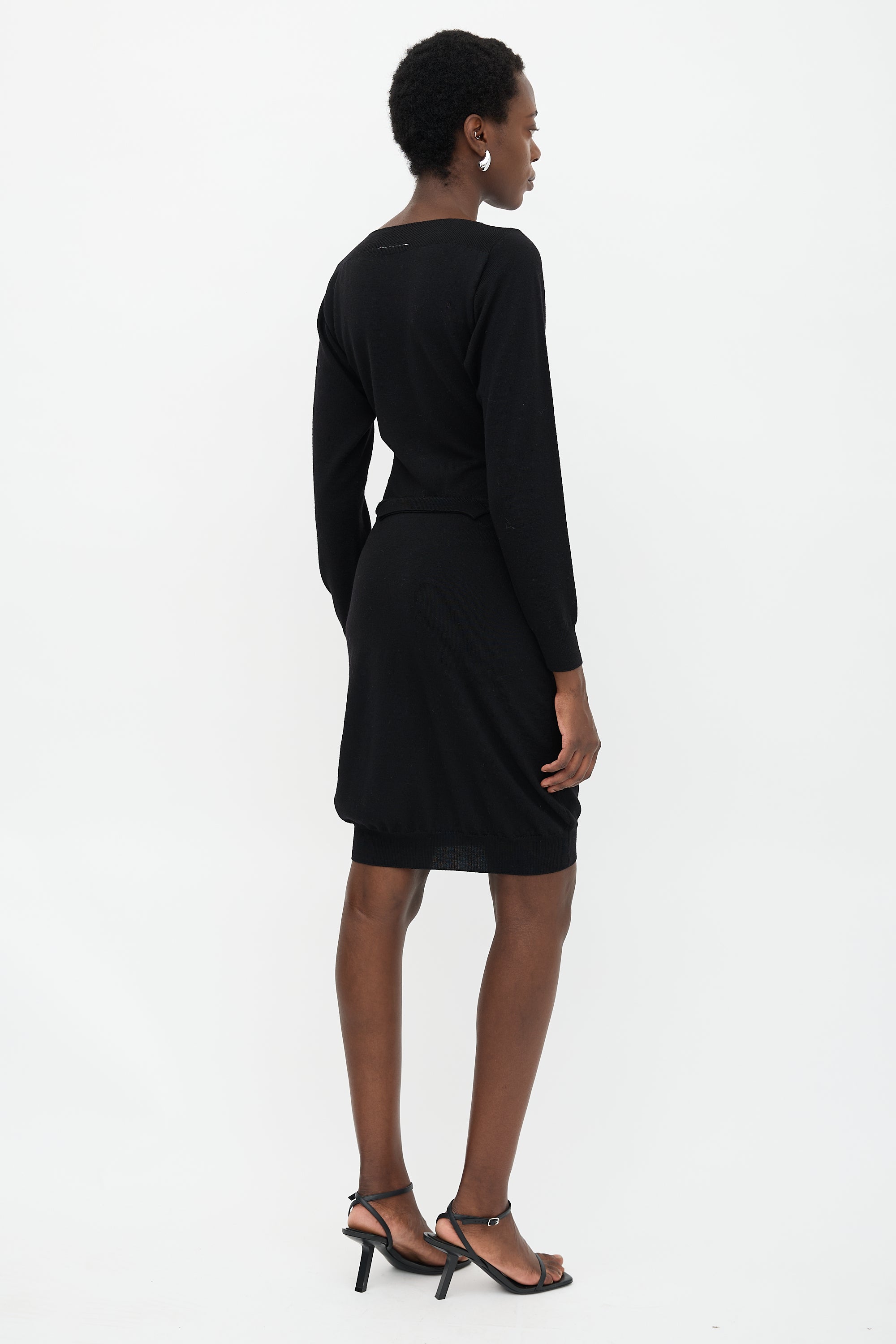 Pre-owned MM6 Maison Margiela black wool knit dress featuring a ribbed bateau neckline, T-shirt detailing at back waist with sleeve belt ties, and signature white stitching line at back collar.