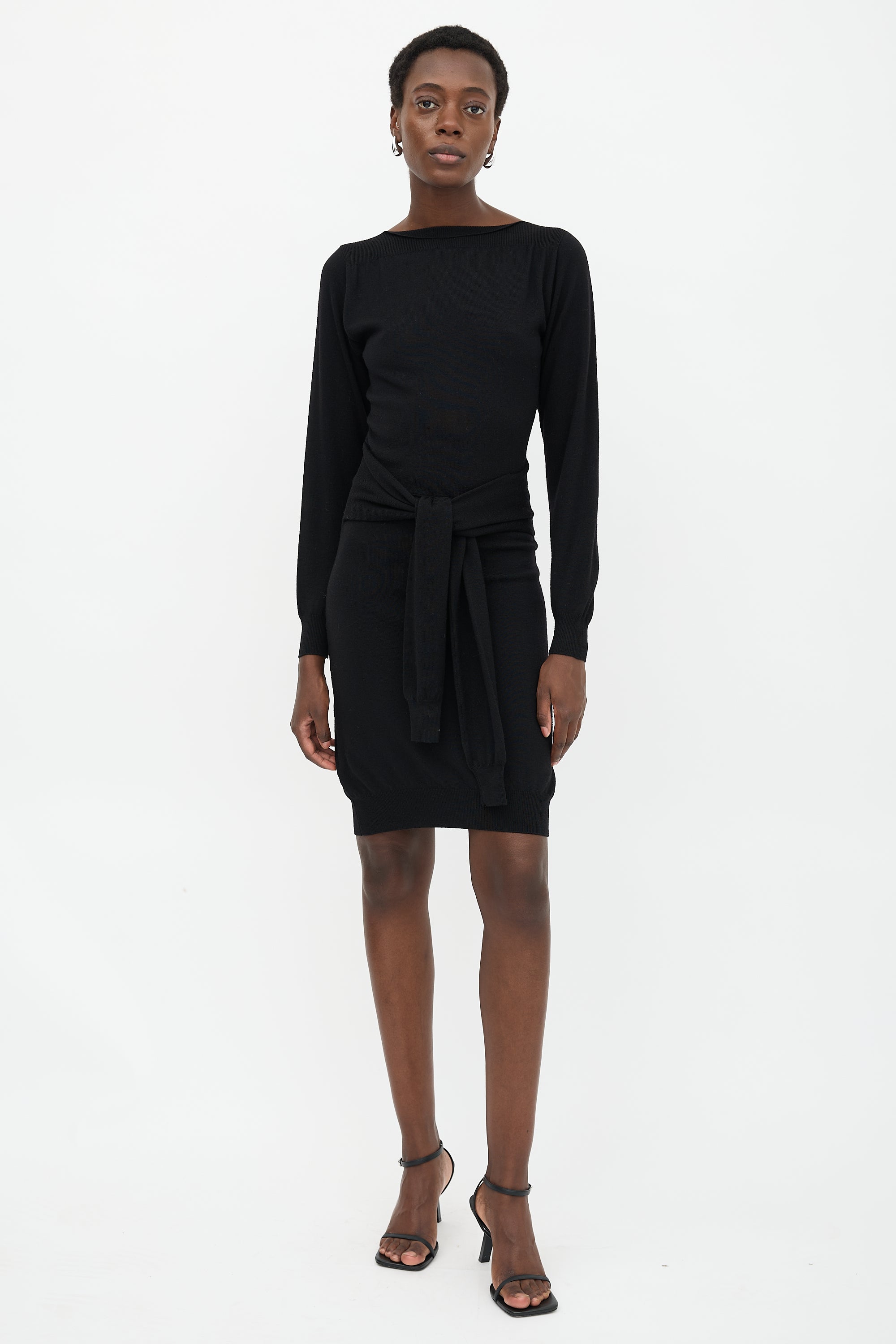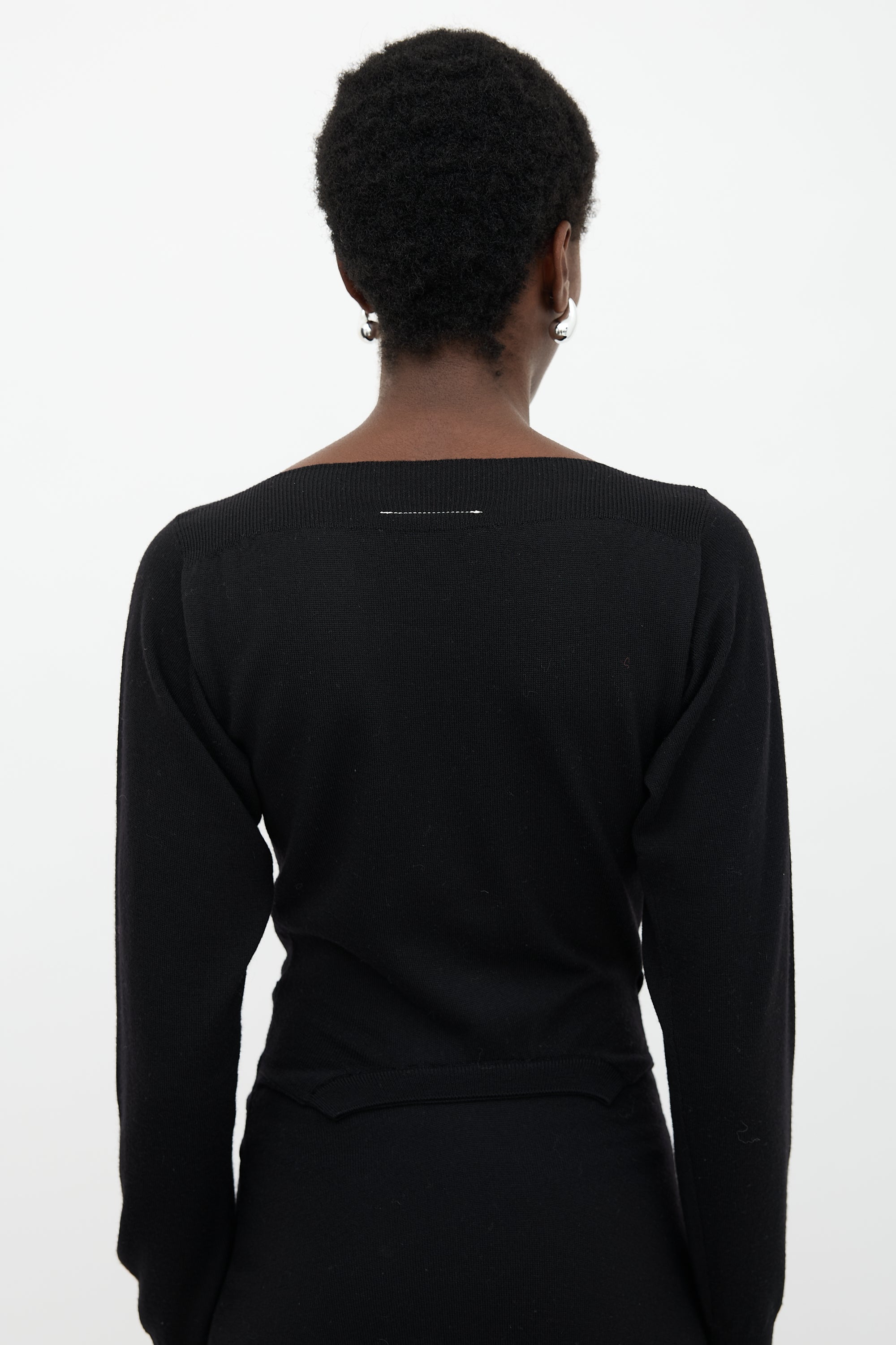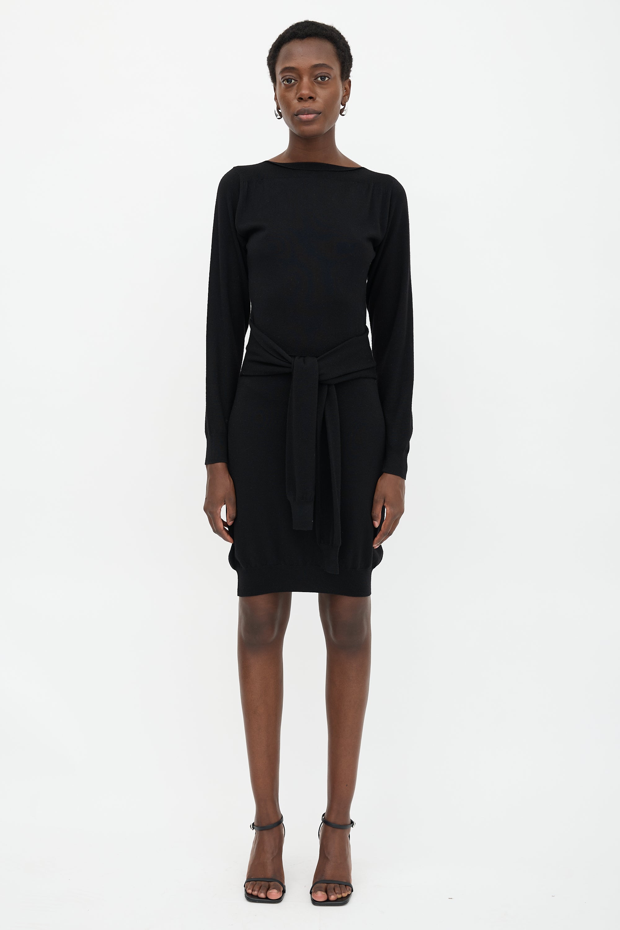 Pre-owned MM6 Maison Margiela black wool knit dress featuring a ribbed bateau neckline, T-shirt detailing at back waist with sleeve belt ties, and signature white stitching line at back collar.