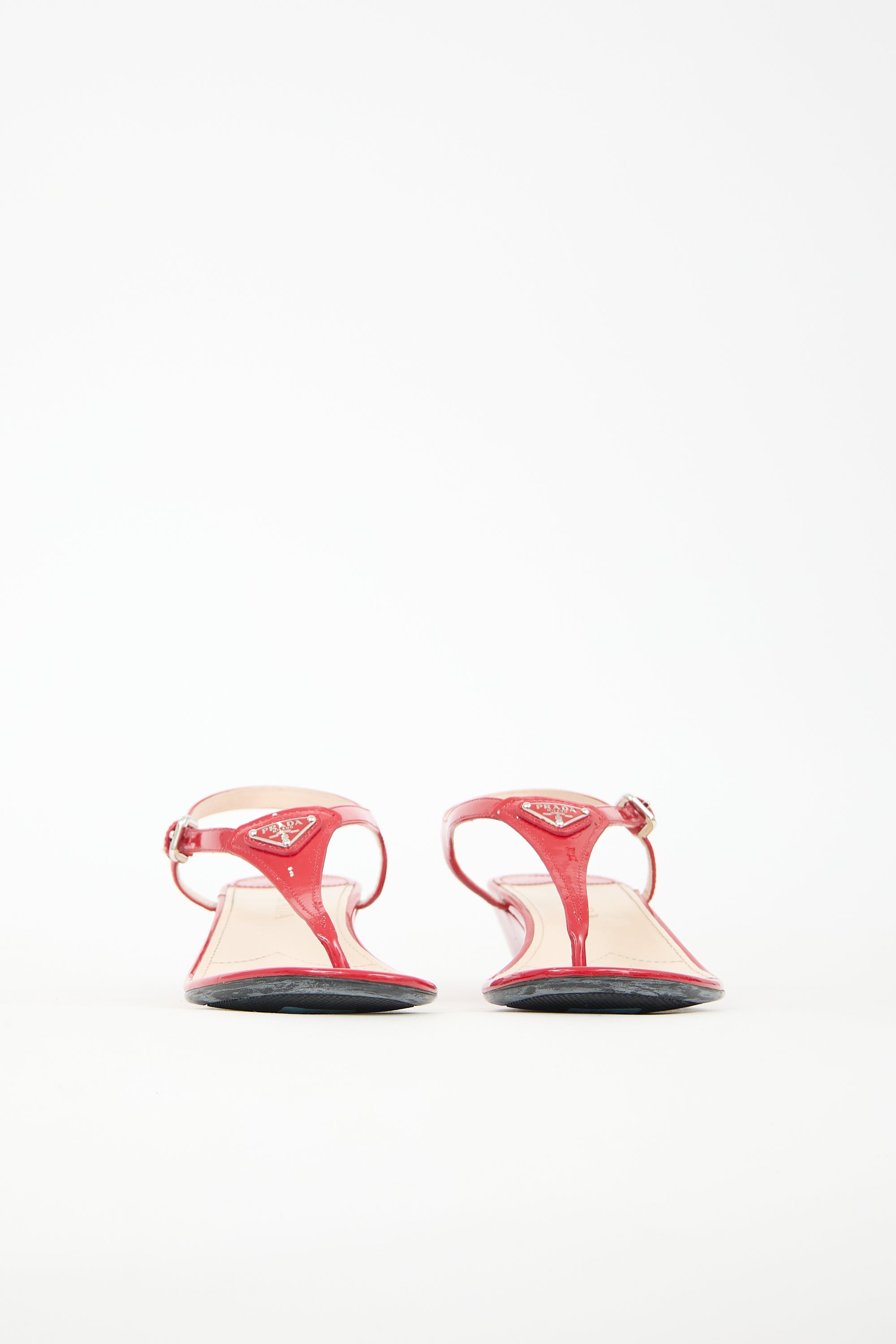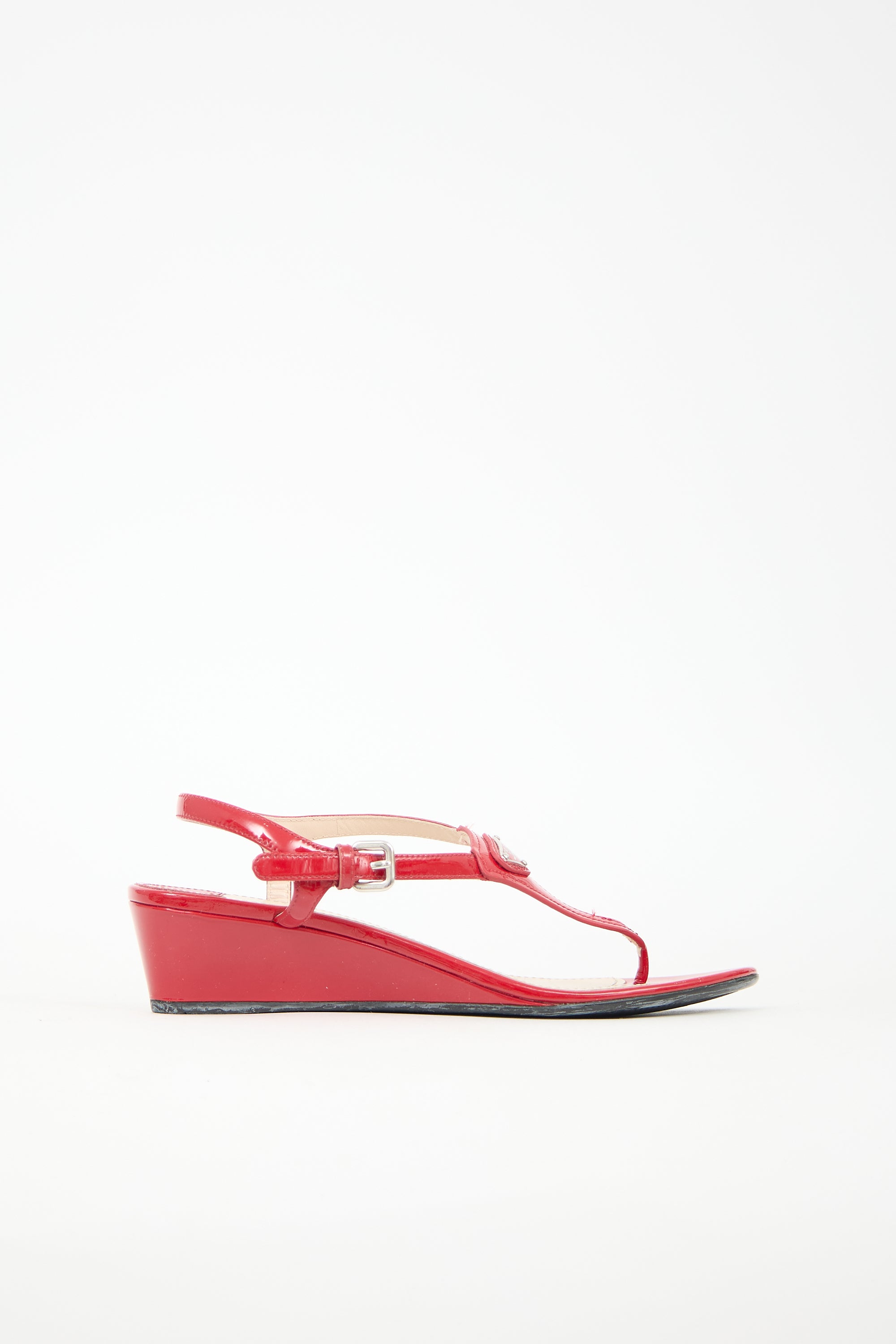 Pre-owned Prada red patent leather sandals featuring rounded toe, thong strap, signature triangle logo plaque at instep, adjustable ankle, and covered wedge heel.