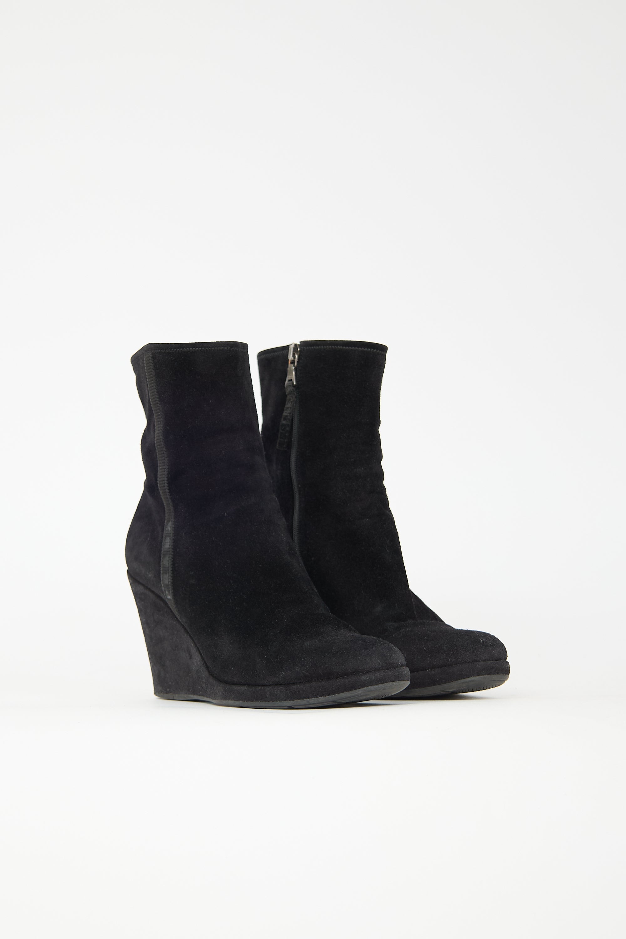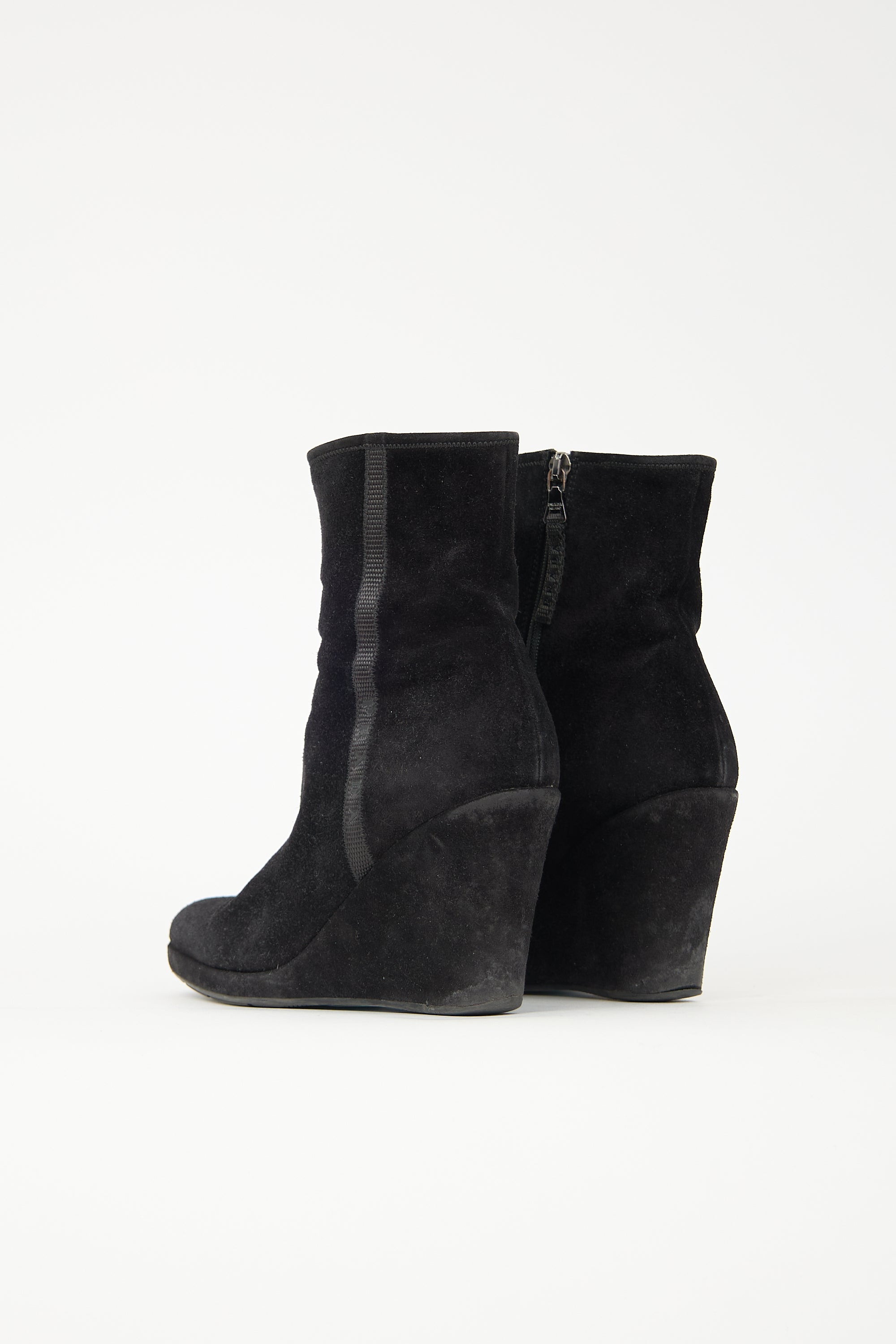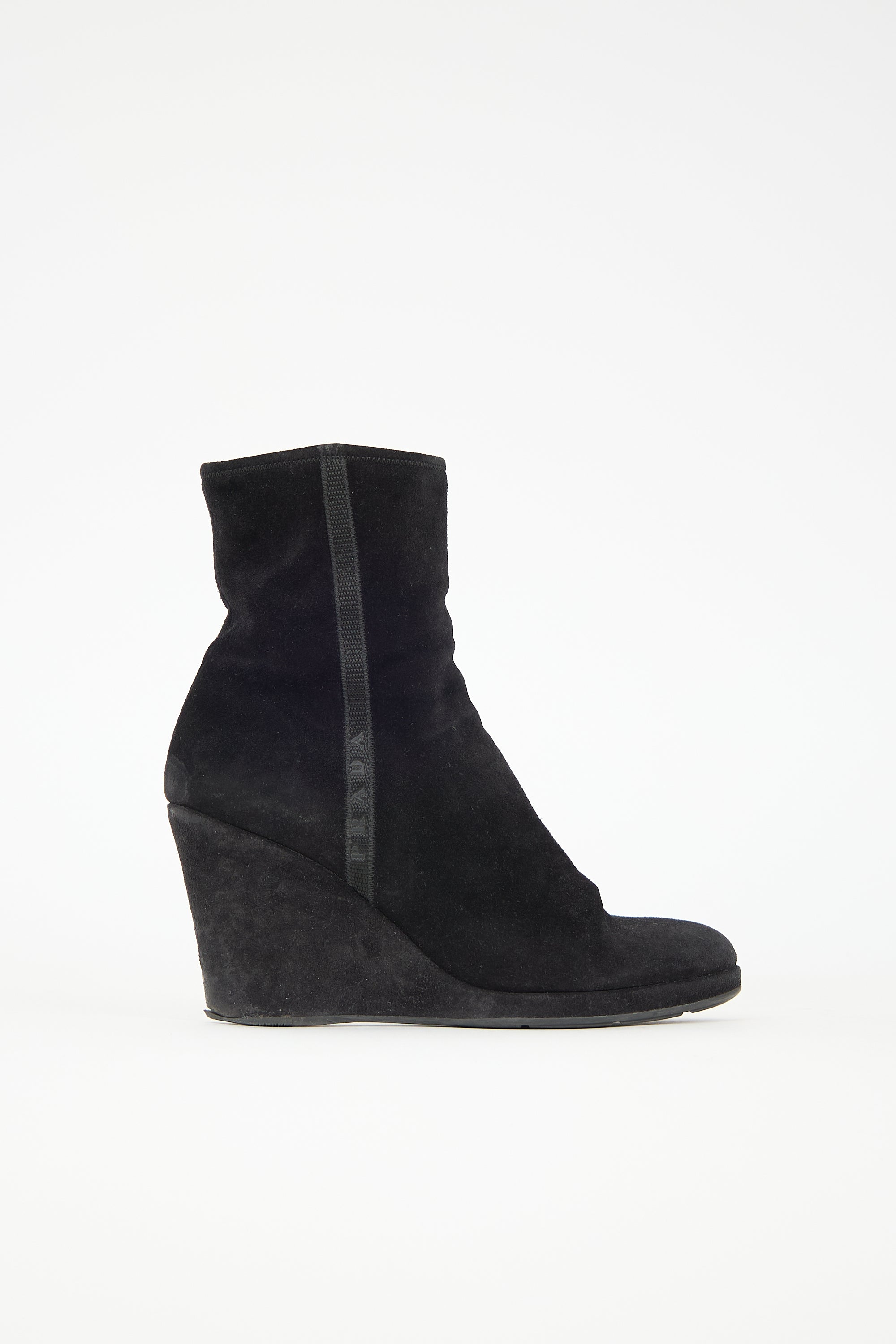 Pre-owned Prada Sport black suede boots featuring square toe, tonal webbed logo trim at outer side, inner side zip closure, and covered wedge heel. Comes with original dust bags.