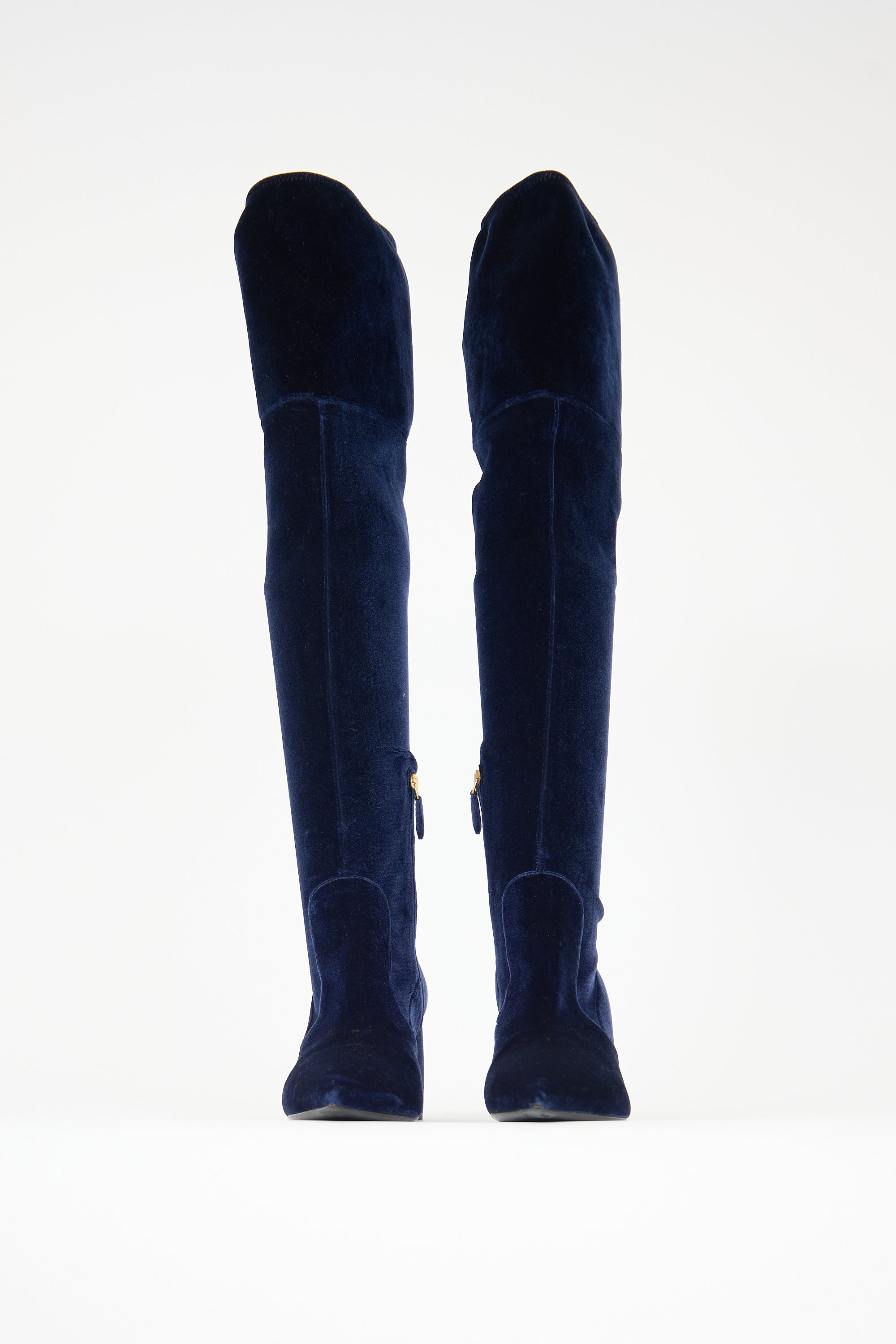 Pre-owned Prada navy blue velvet thigh high boots featuring a pointed toe, inner zip closure, pull on entry with elasticized collar, and a covered block heel. Comes with original dust bags.