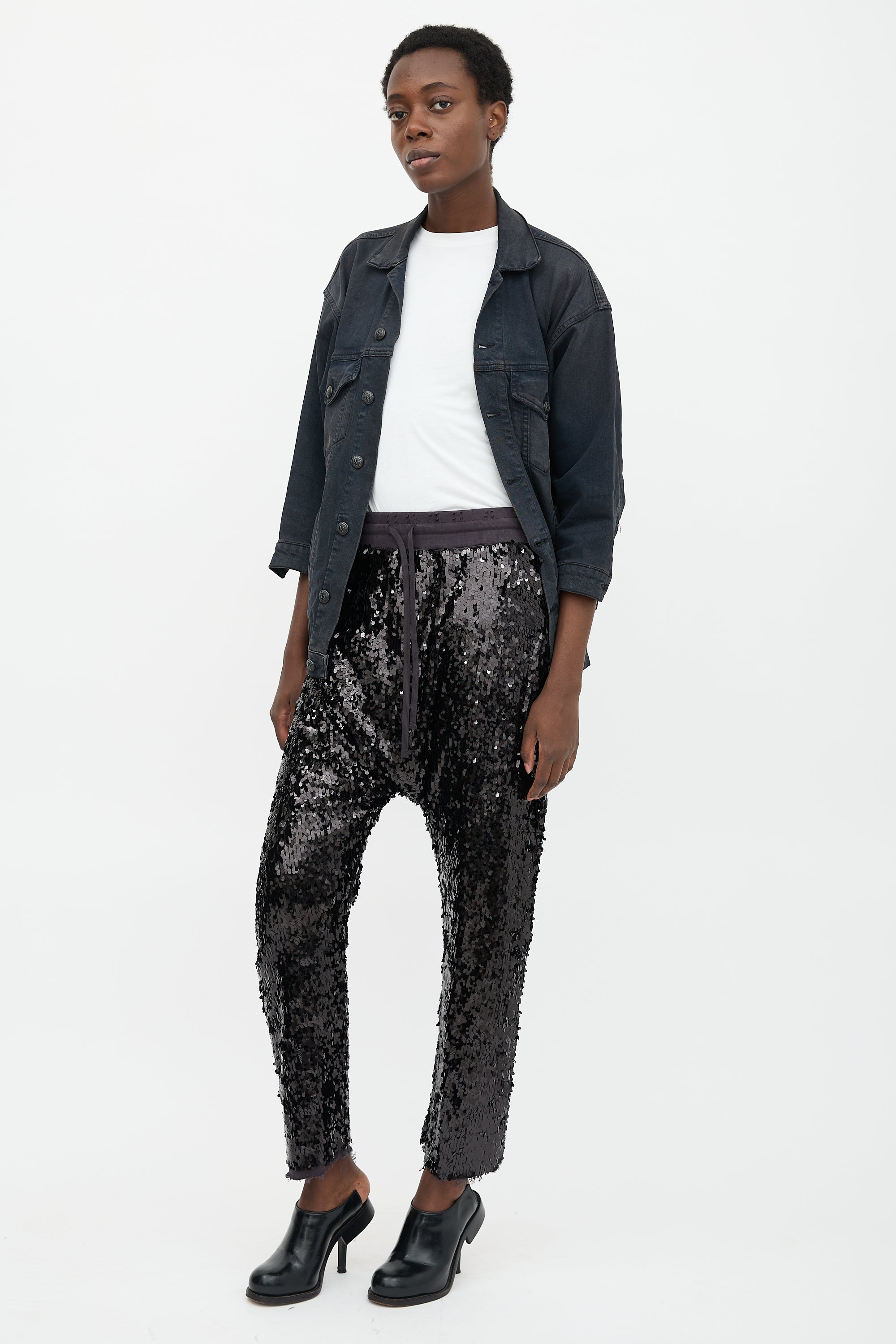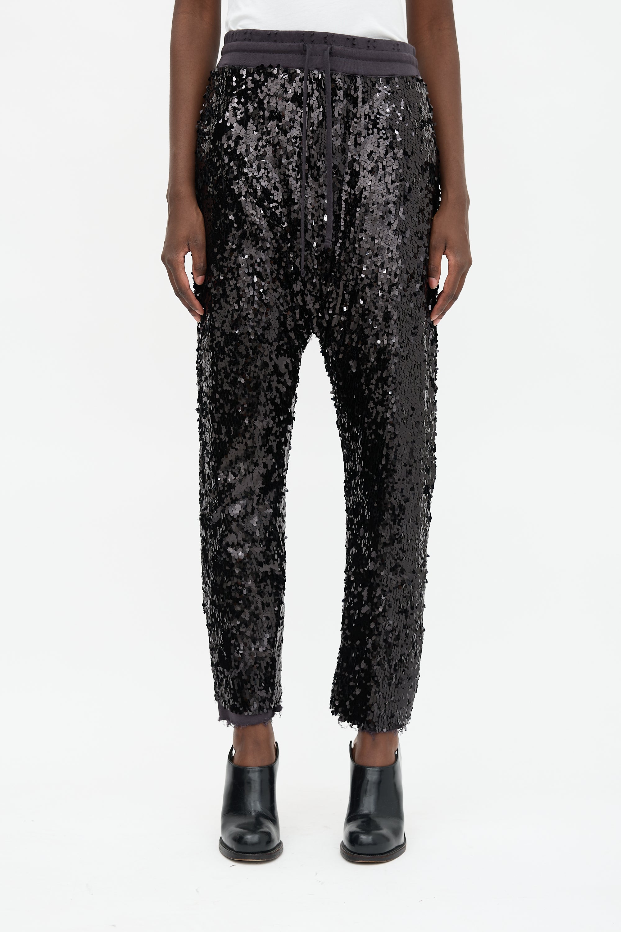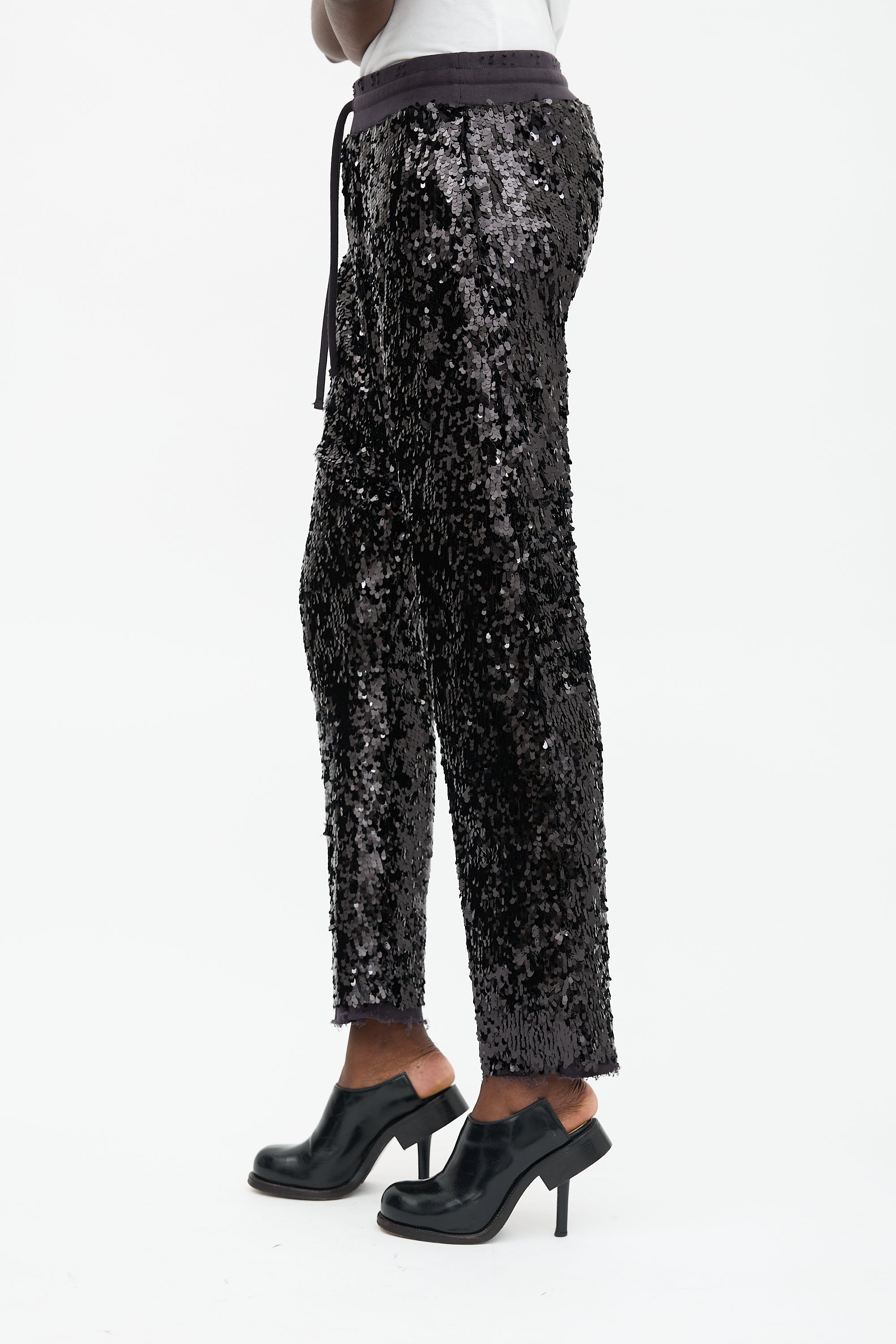 Pre-owned R13 black sequin Field sweatpants featuring intentional distressing, high rise, dropped seat, drawstring waistband, tapered leg, and raw hems.