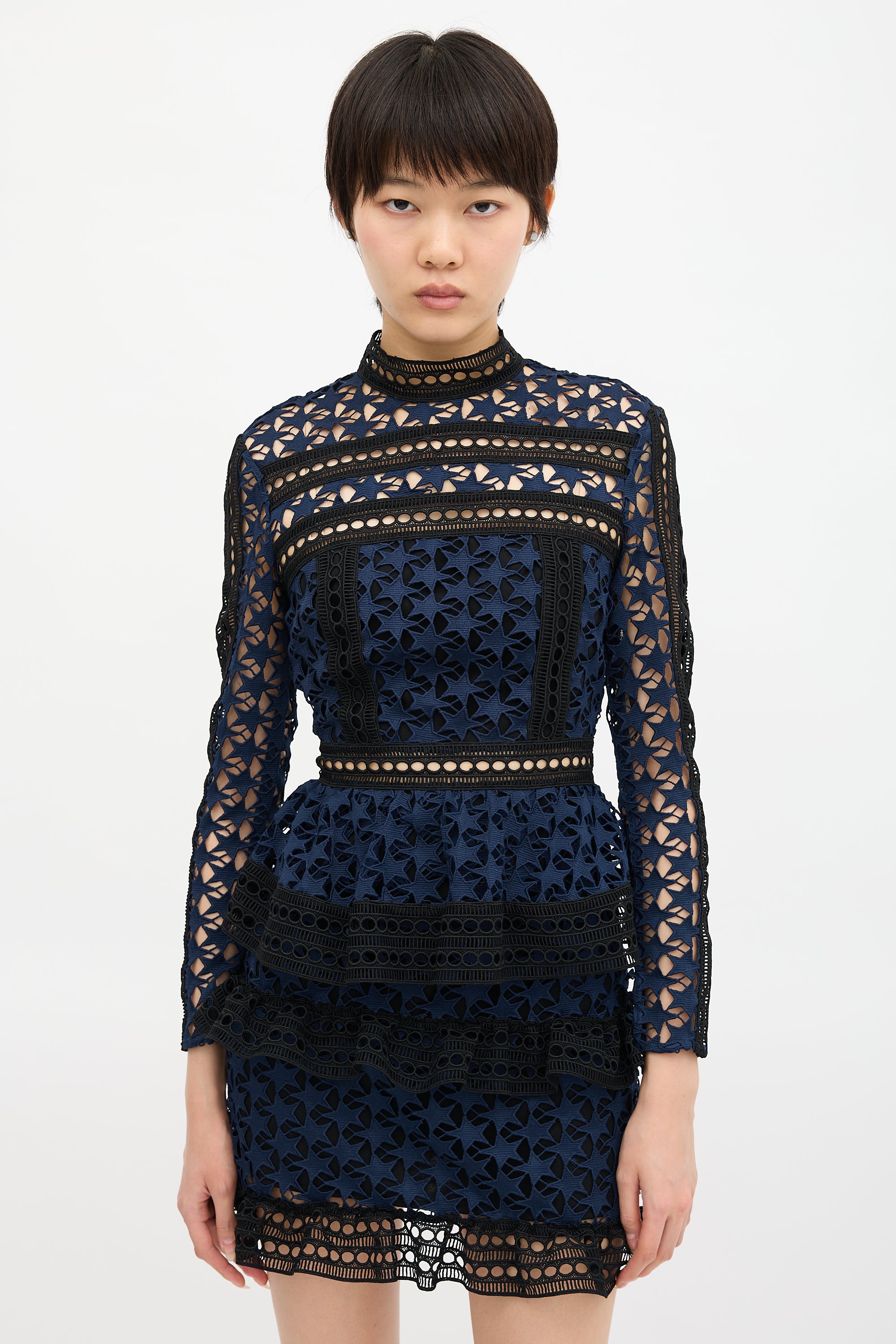 Pre-owned Self-Portrait black and navy mini dress featuring a star motif guipure lace design, eyelet trim, stand collar, back zip, and ruffled tiered skirt. Partially lined.