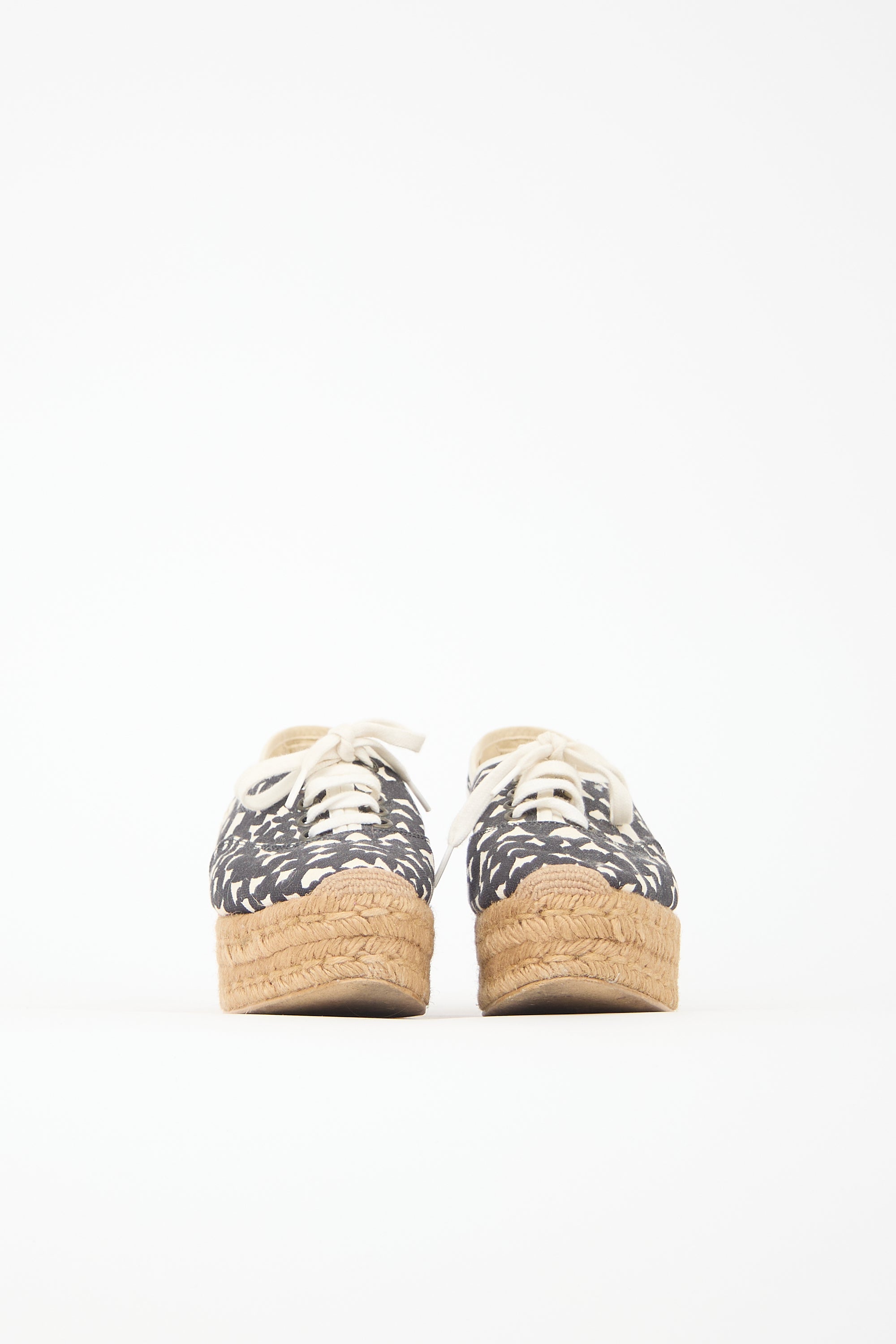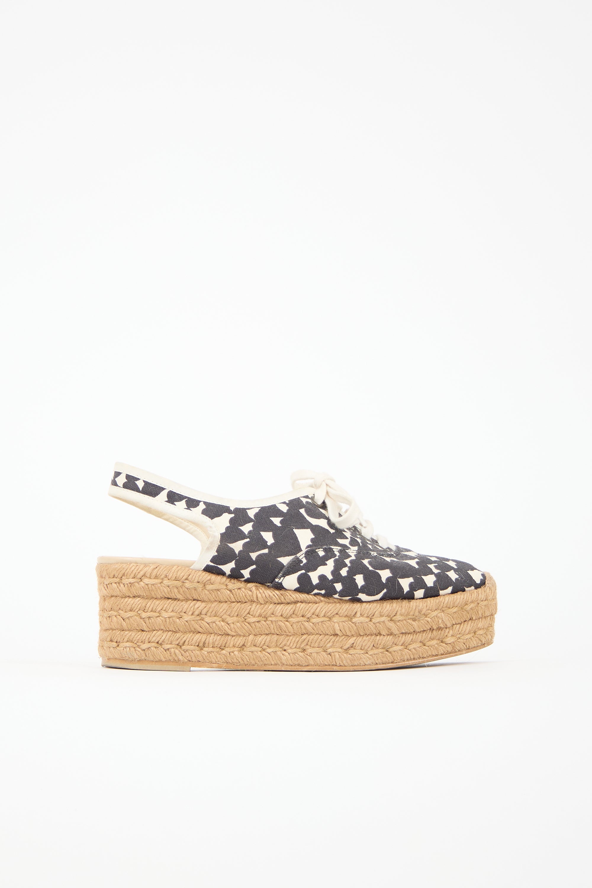 Pre-owned Stella McCartney espadrille sandals featuring rounded toe, black and cream canvas upper with heart print, lace up vamp, slingback strap, and brown braided platform.