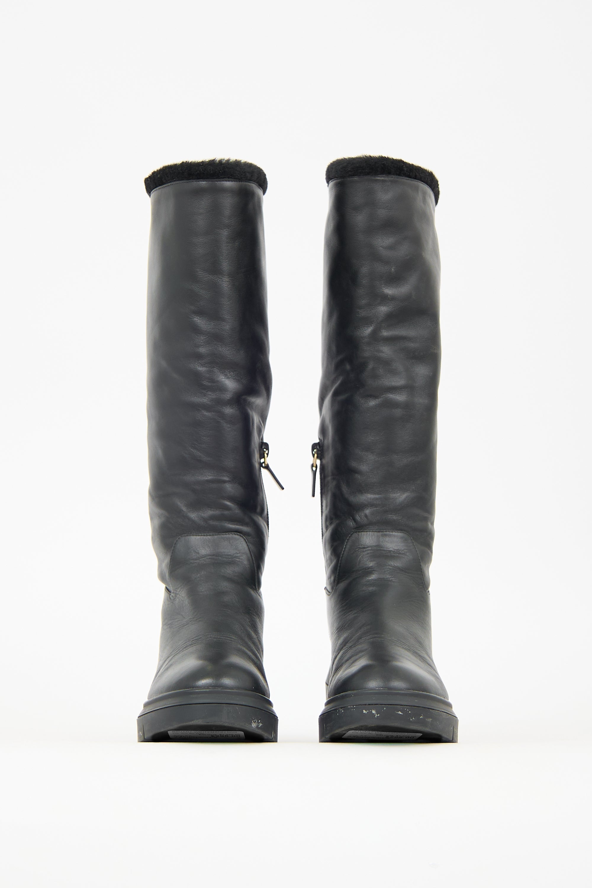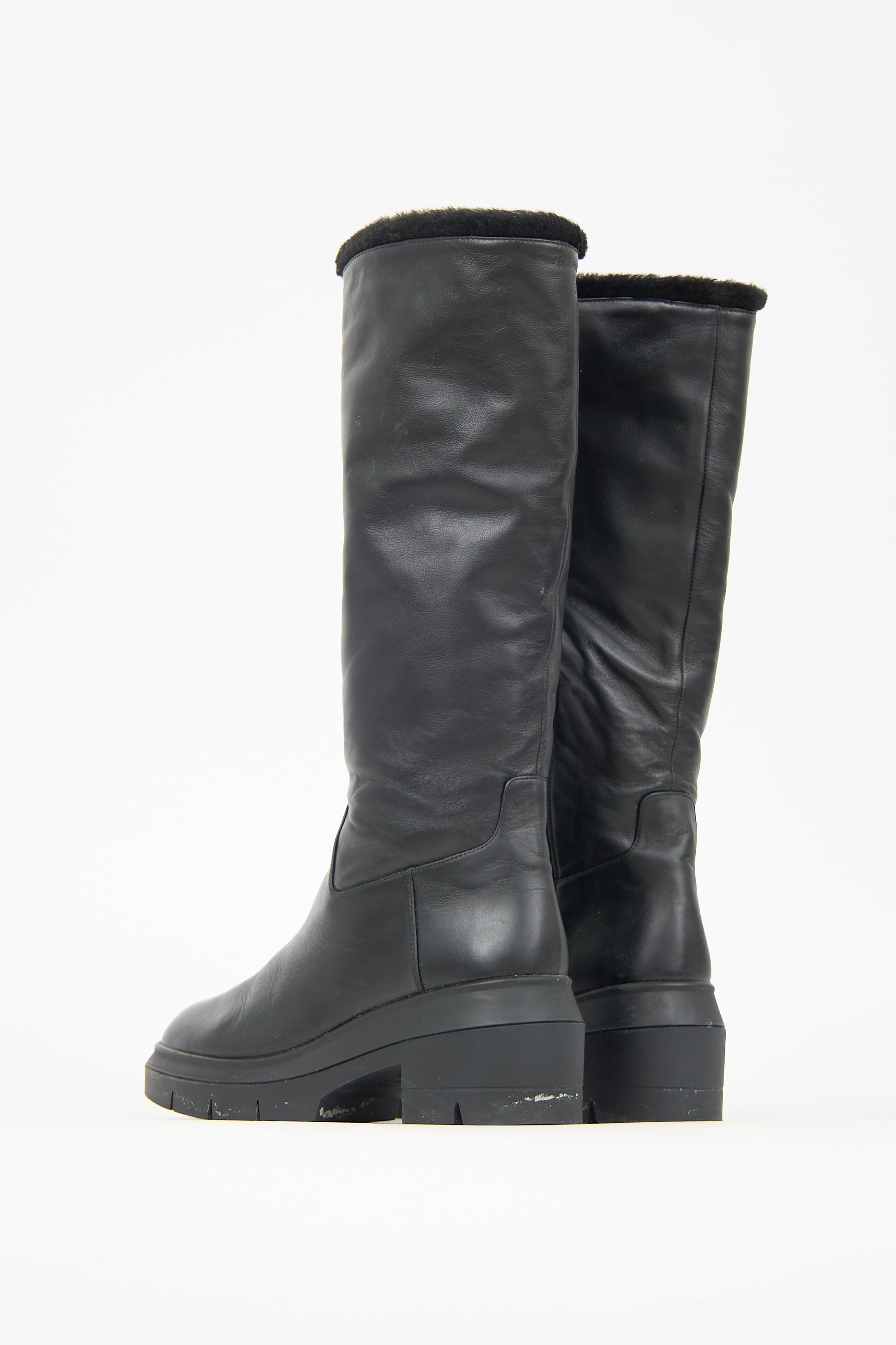 Pre-owned Stuart Weitzman black leather Noho boots featuring rounded toe, inner side zip closure, rubber sole with block heel, and faux fur interior. Comes with original dust bag.
