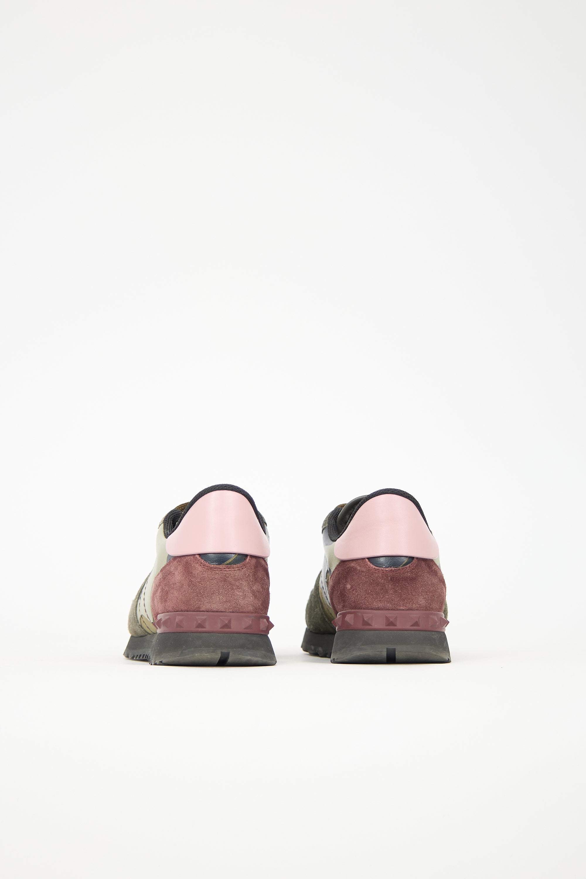 Pre-owned Valentino green Rockrunner sneakers featuring rounded toe, mixed mesh and suede upper with camo print, lace up front, pink heel counter, and burgundy rubber Rockstud trim at back.