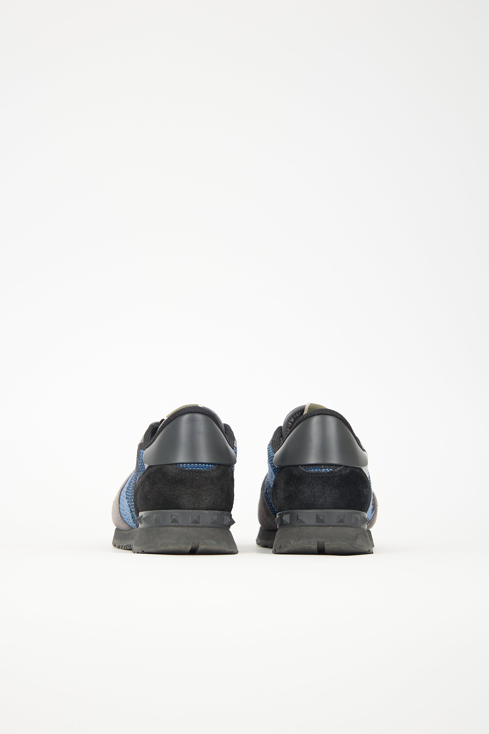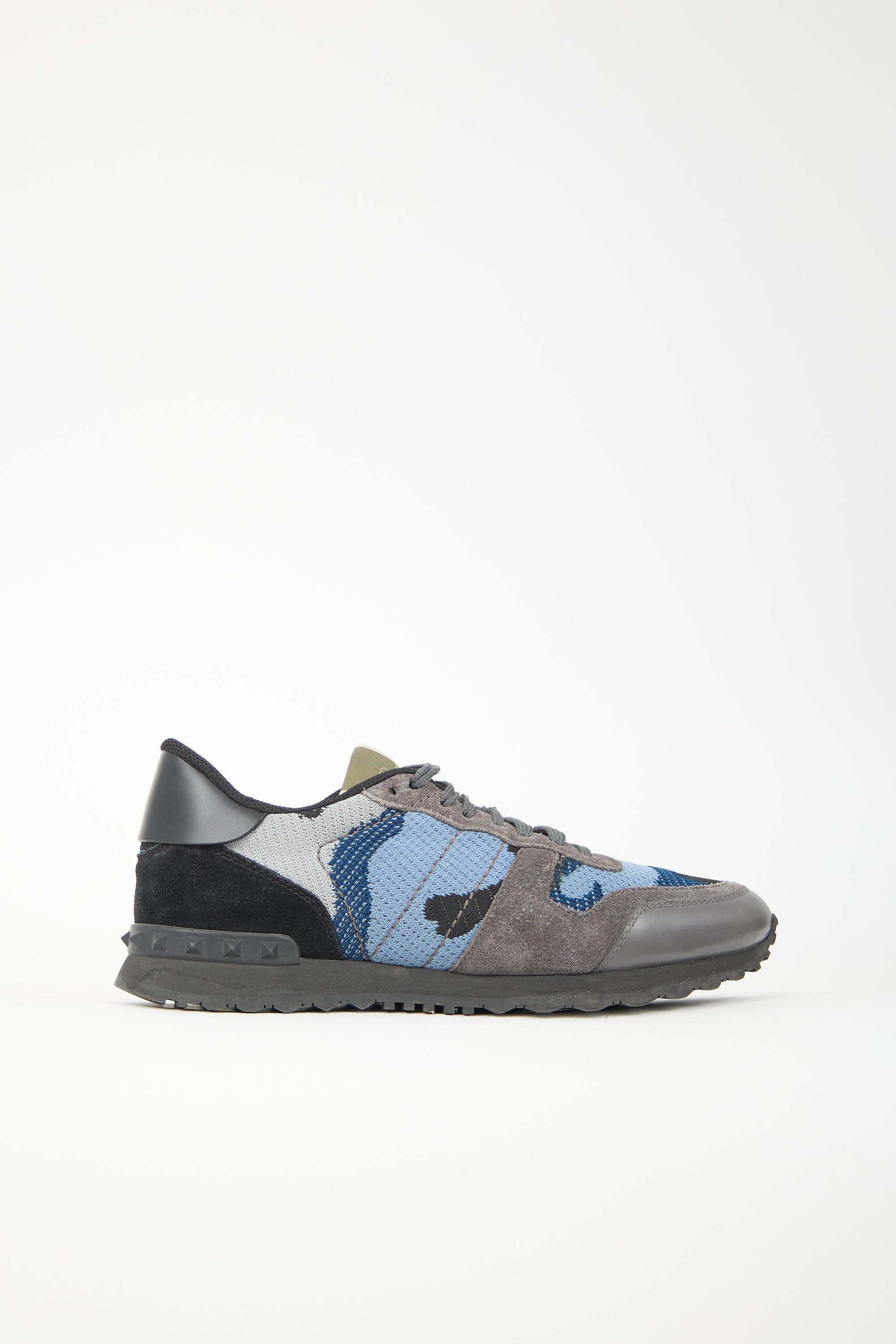 Pre-owned Valentino blue and grey Rockrunner sneakers featuring rounded toe, mixed mesh and suede upper with camo print, lace up front, and rubber Rockstud trim at back.