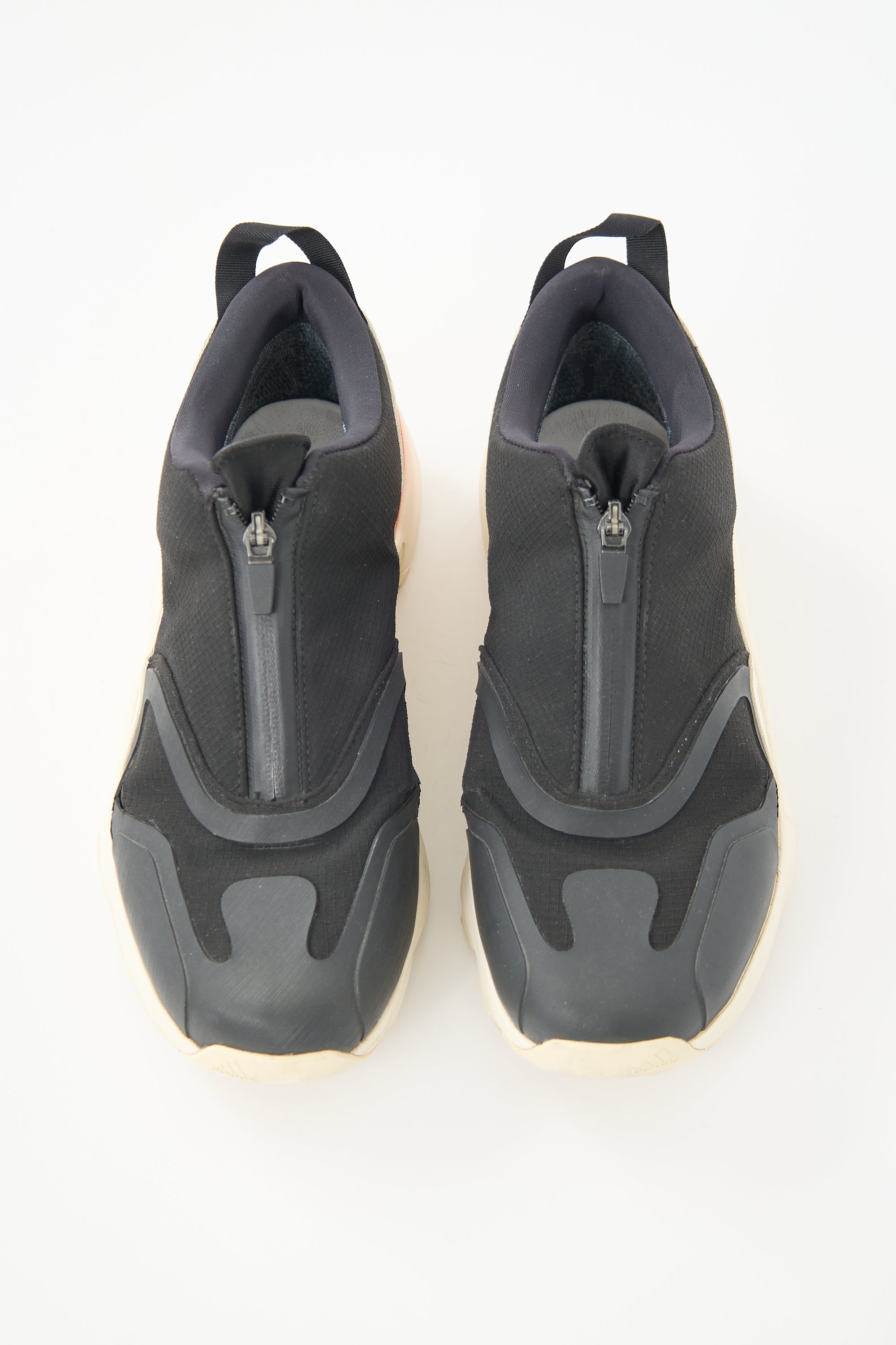 Pre-owned Y-3 black Terrex Swift R-3 Gore-Tex sneakers featuring rounded toe, zip front, pull tab at back, orange detail at back, and ridged rubber sole.