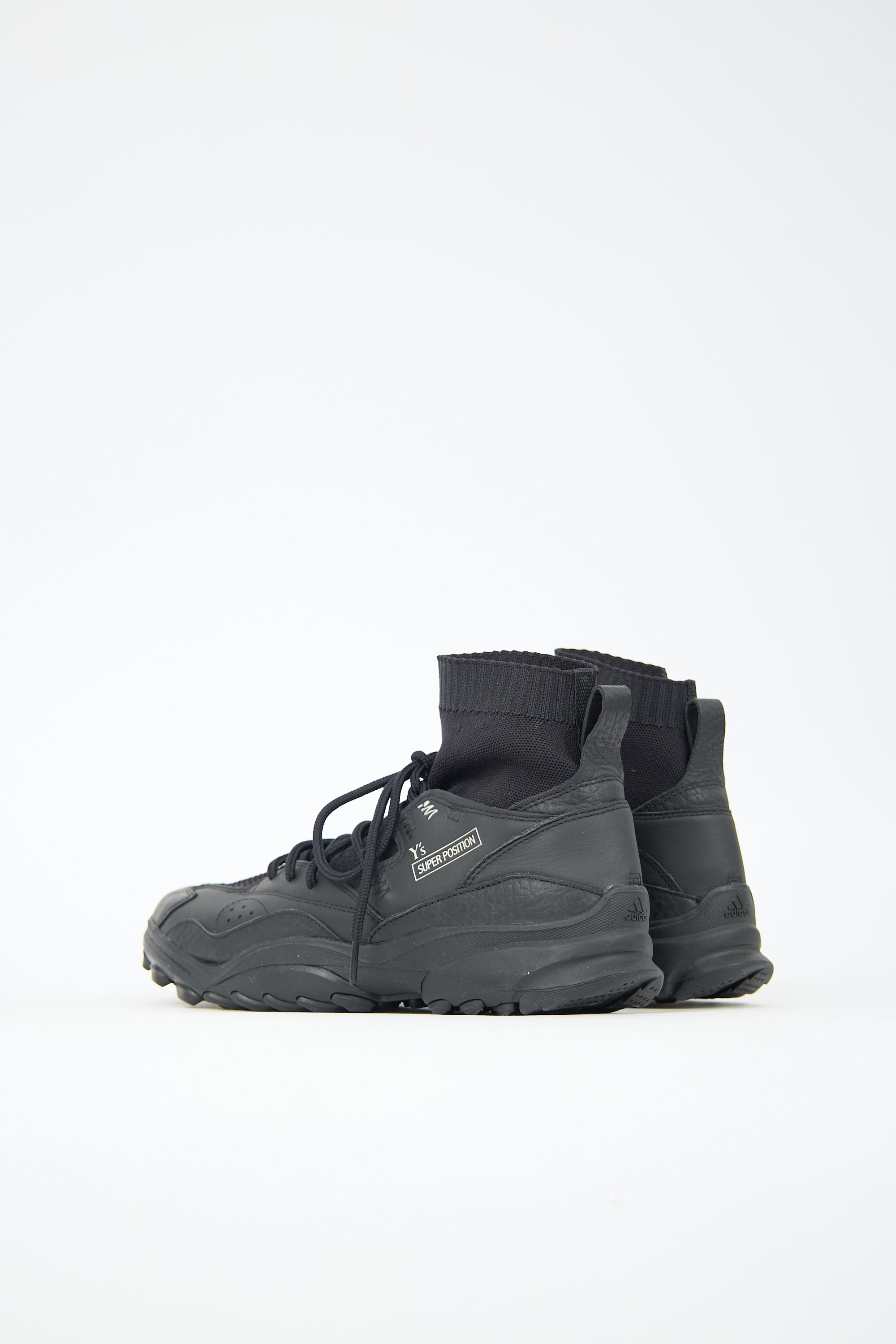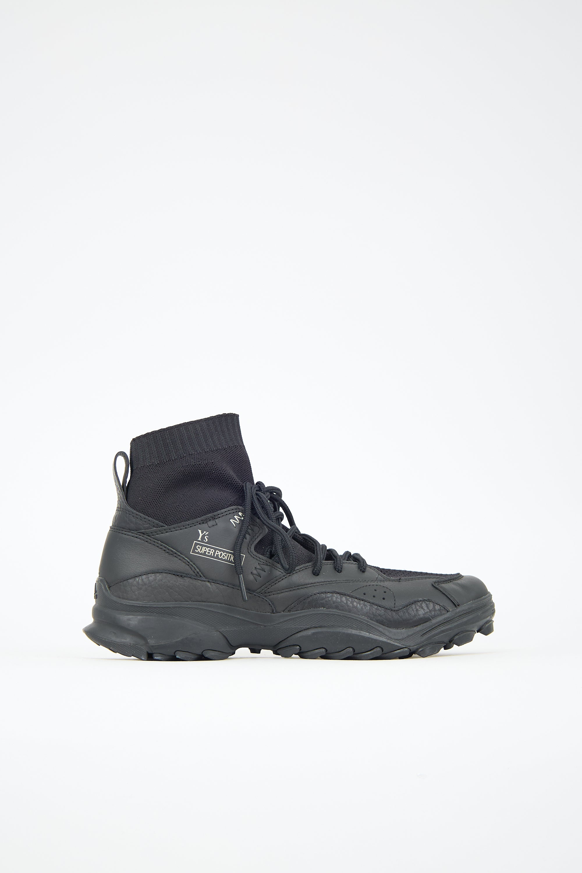 Pre-owned Yohji Yamamoto Y's X Adidas black Seeulater GSG9 sneakers featuring rounded toe, leather and knit sock upper, lace up in step, ribbed topline, pull tab at counter, printed lettering at outer side, and treaded rubber sole.