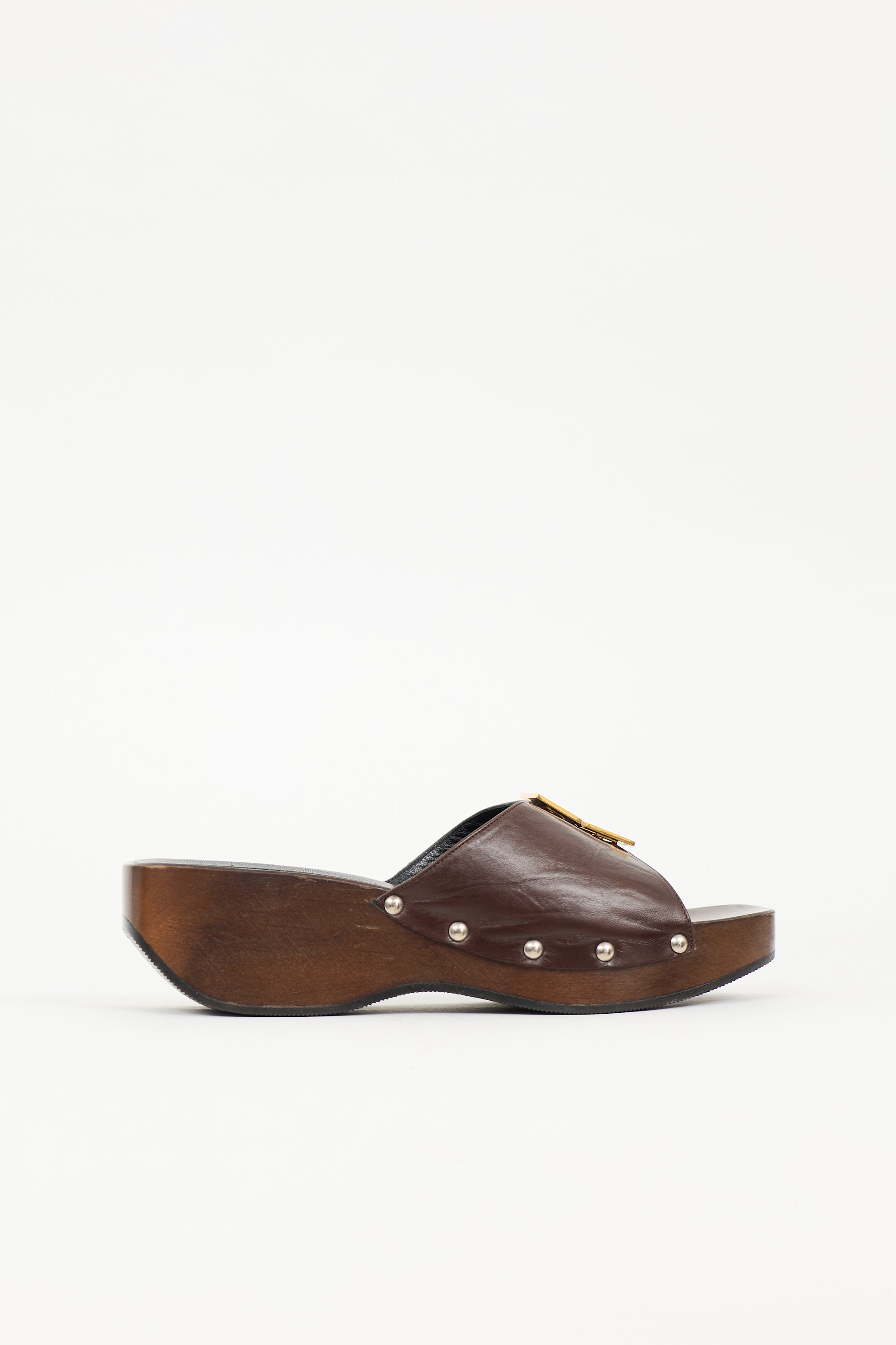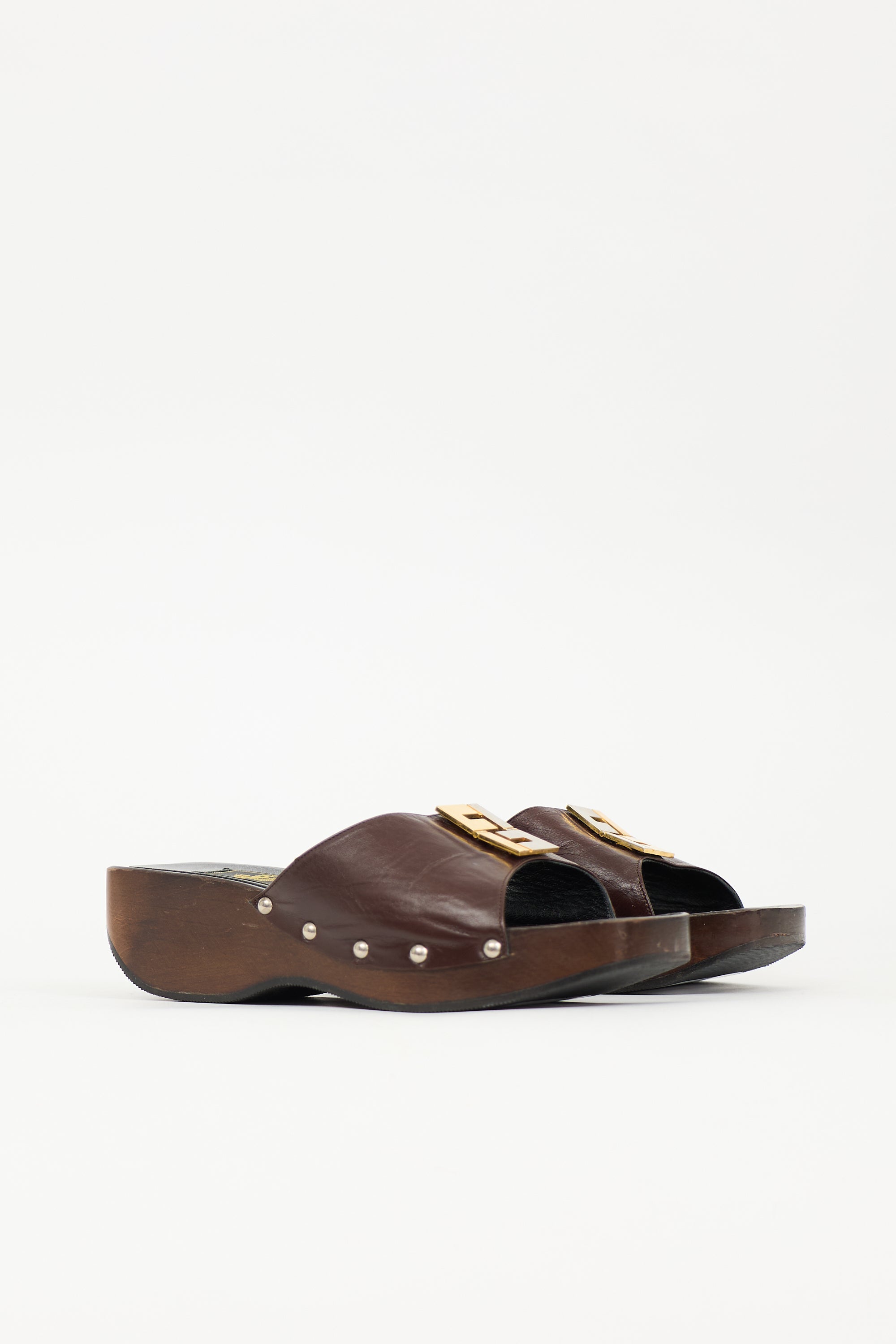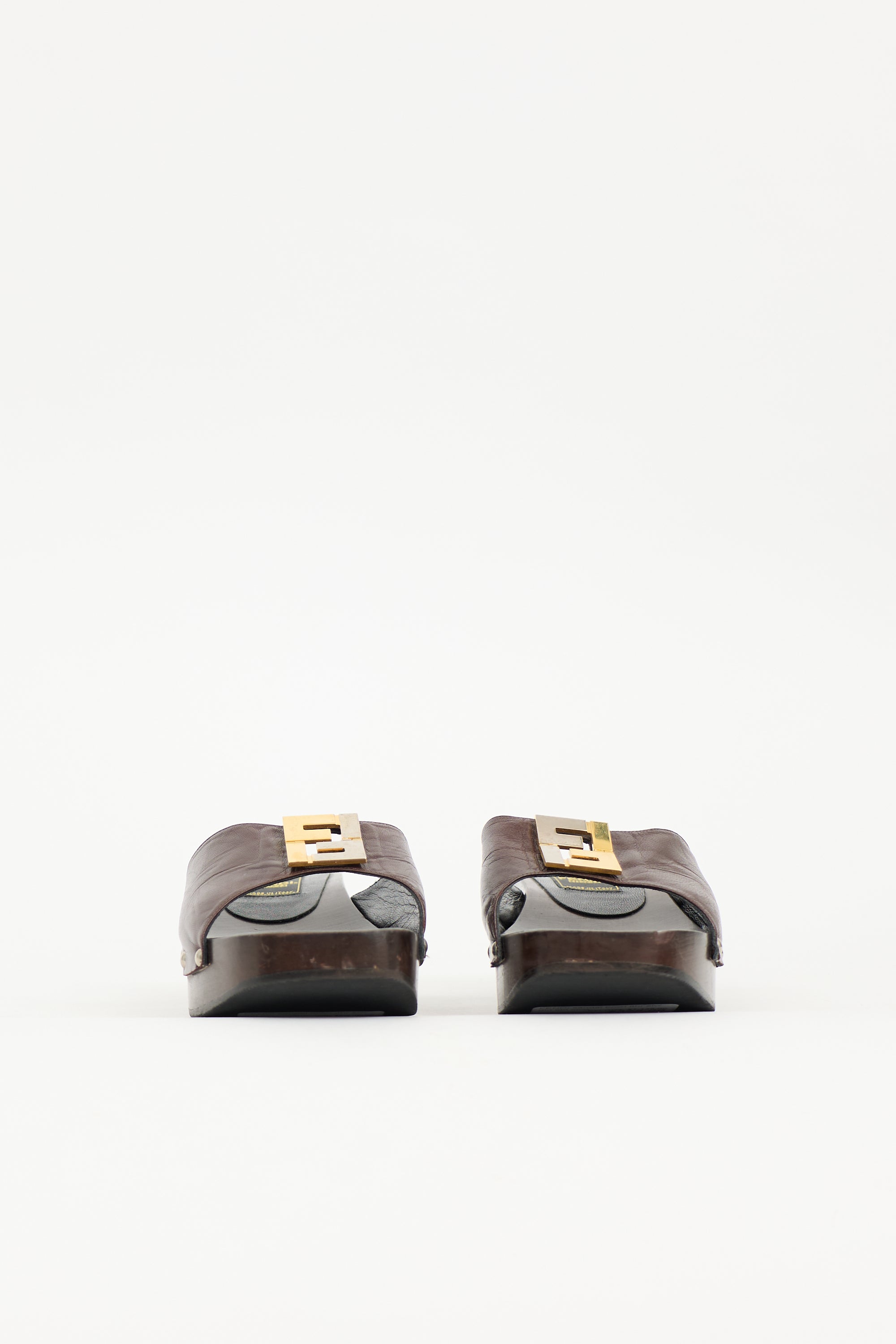 Pre-owned Fendi vintage brown leather and wood sandals featuring open square toe, leather vamp strap with two tone FF logo, and wedge heel.