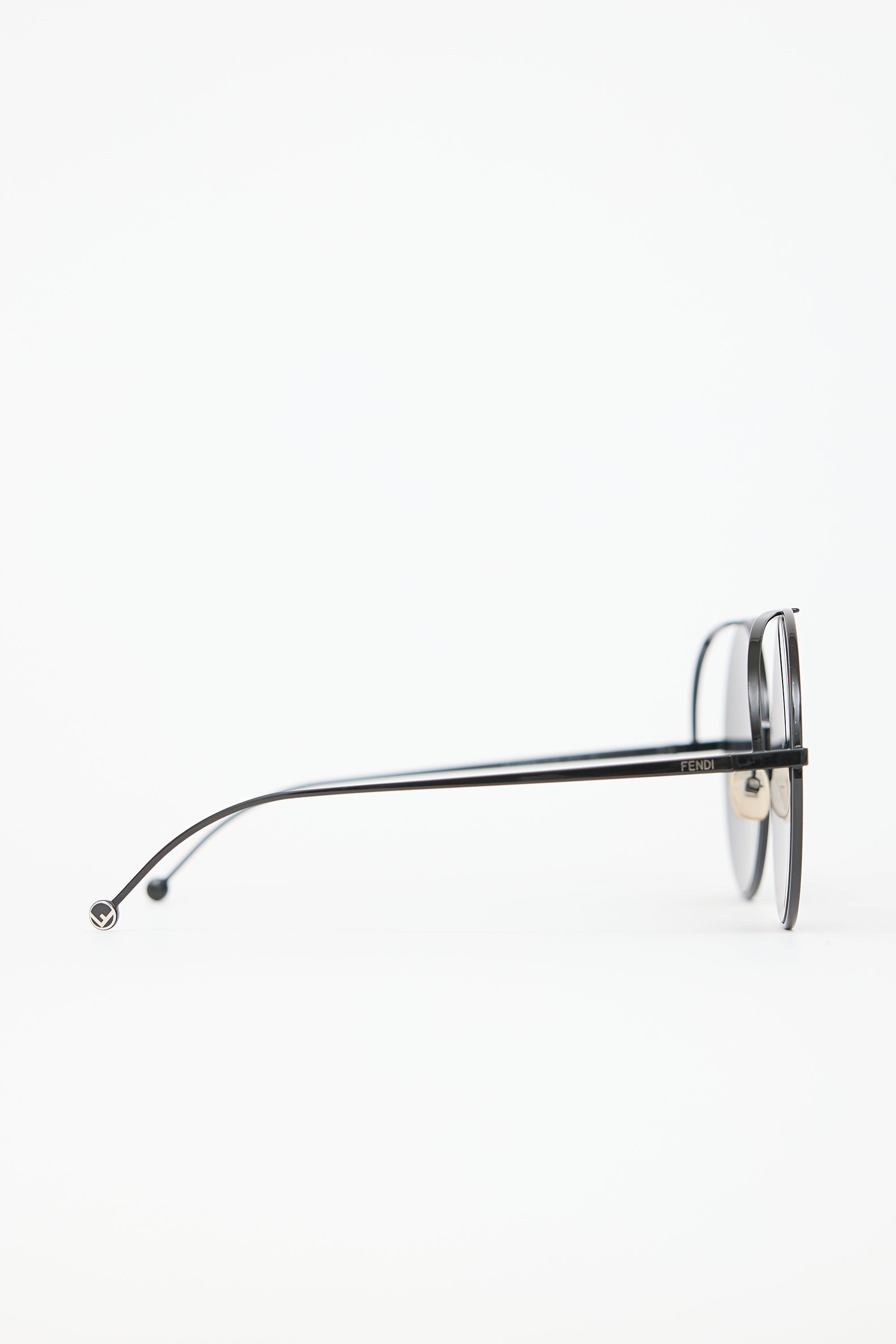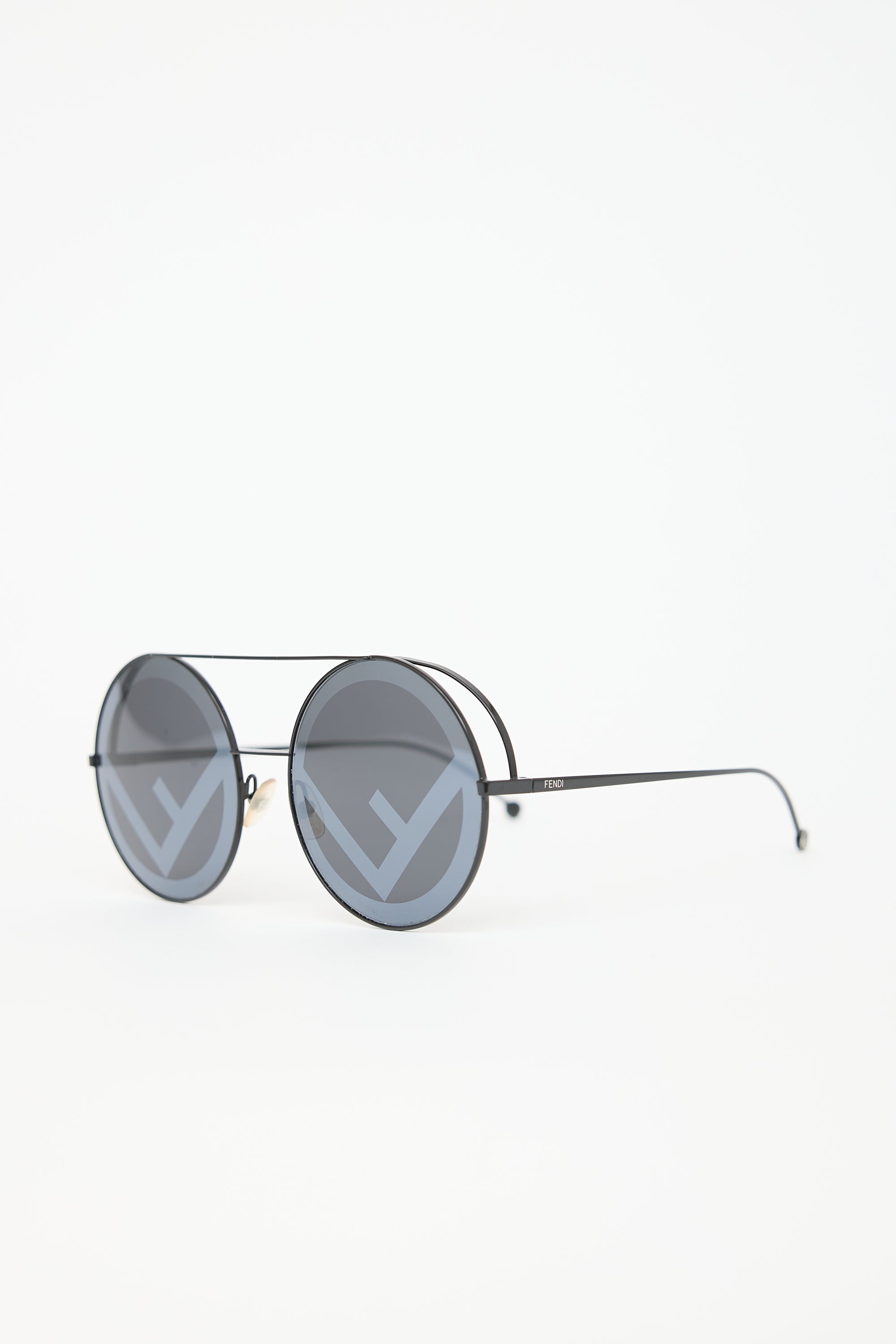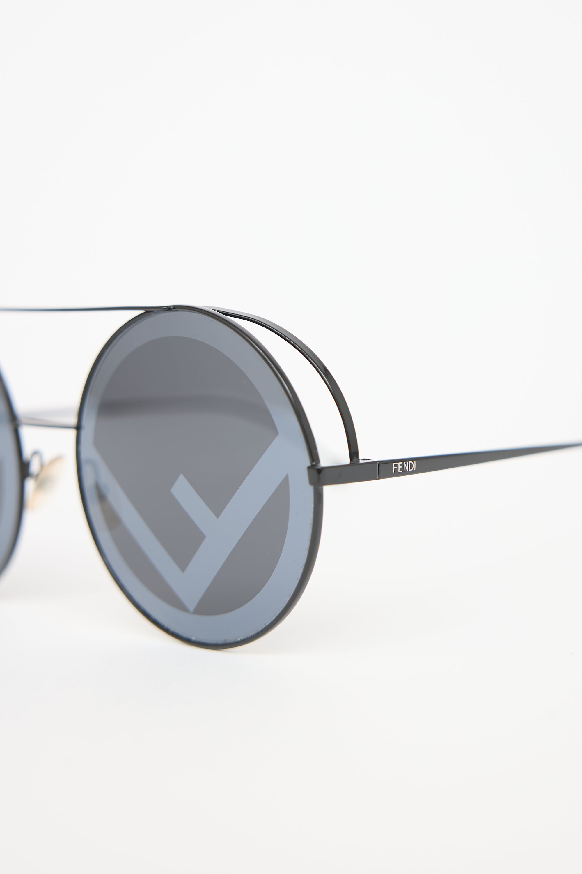 Pre-owned Fendi FF0285/S sunglasses featuring grey tinted lenses with mirrored logo finish, black wire circle frame, silver tone logo at temples, and circle F accent at arm tips. Comes with original case, wipe cloth, care guide, and certificate of authenticity card.