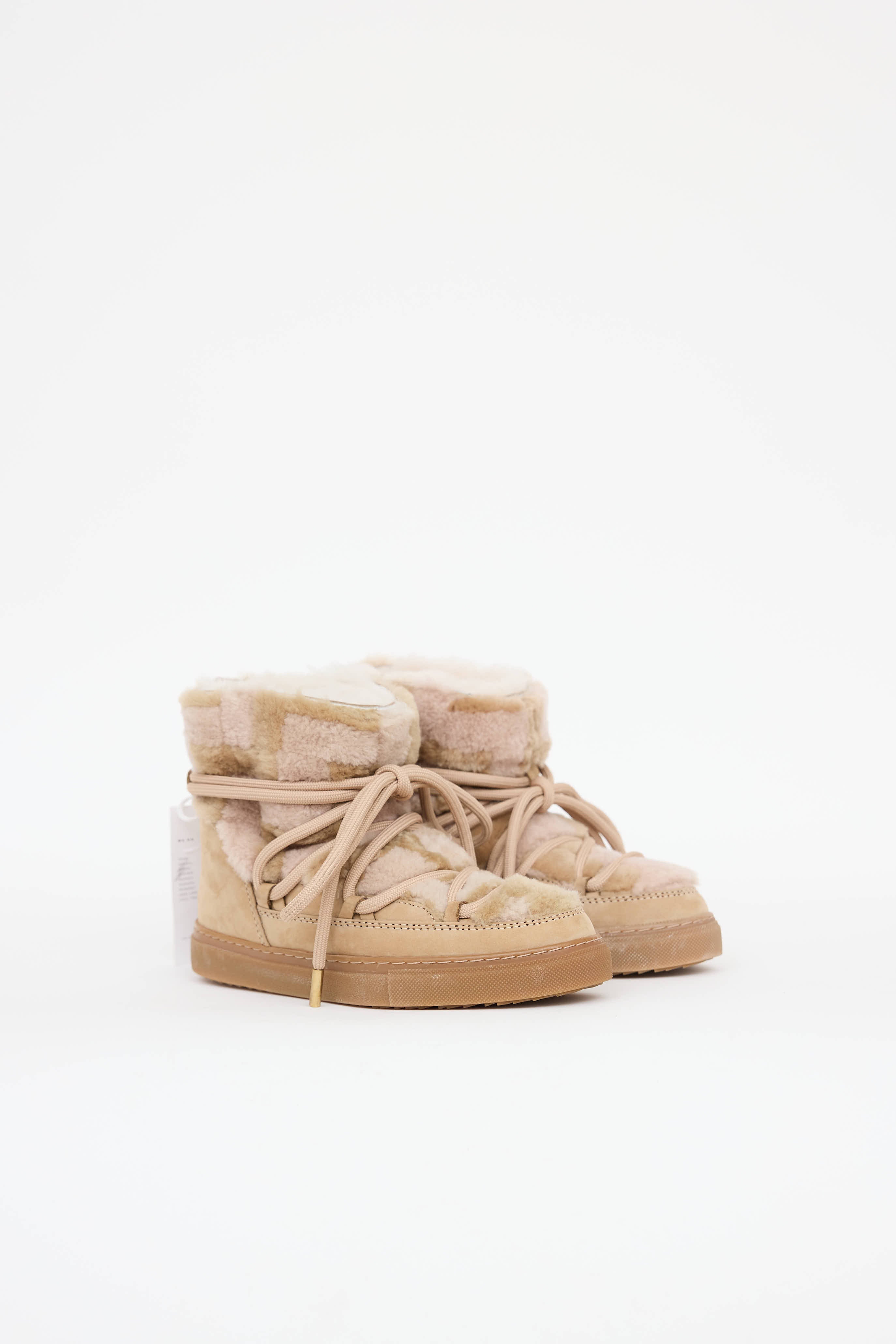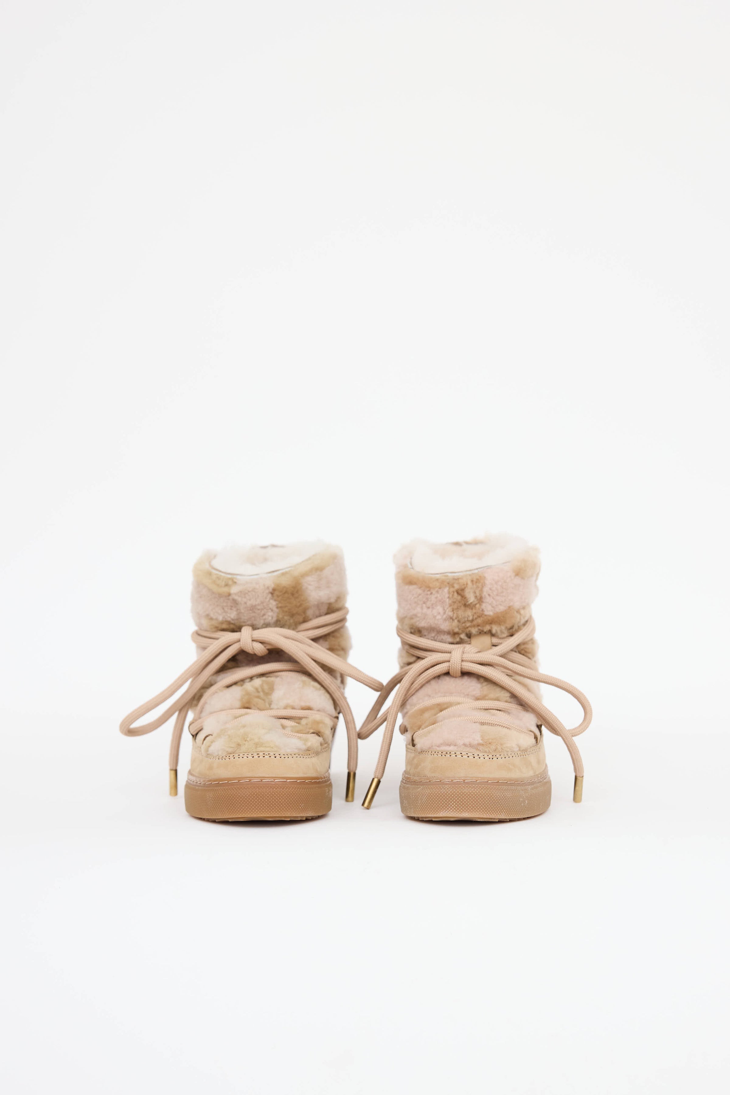 Pre-owned Inuikii beige and multicolour ZigZag boots featuring a rounded toe, slip on entry, cord lace up at vamp, multicolour shearling and suede upper, tonal stitched logo text at counter and shearling lined.