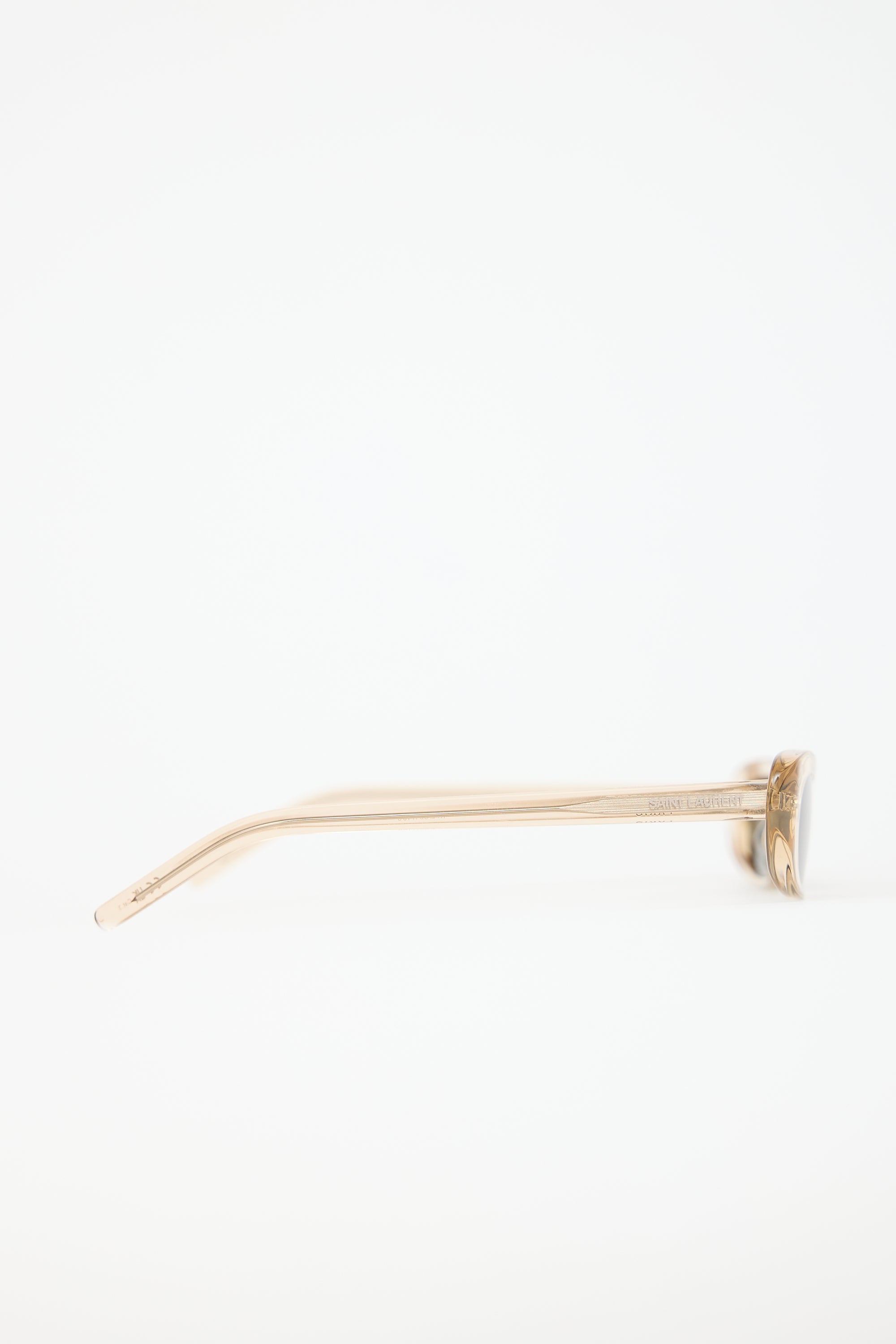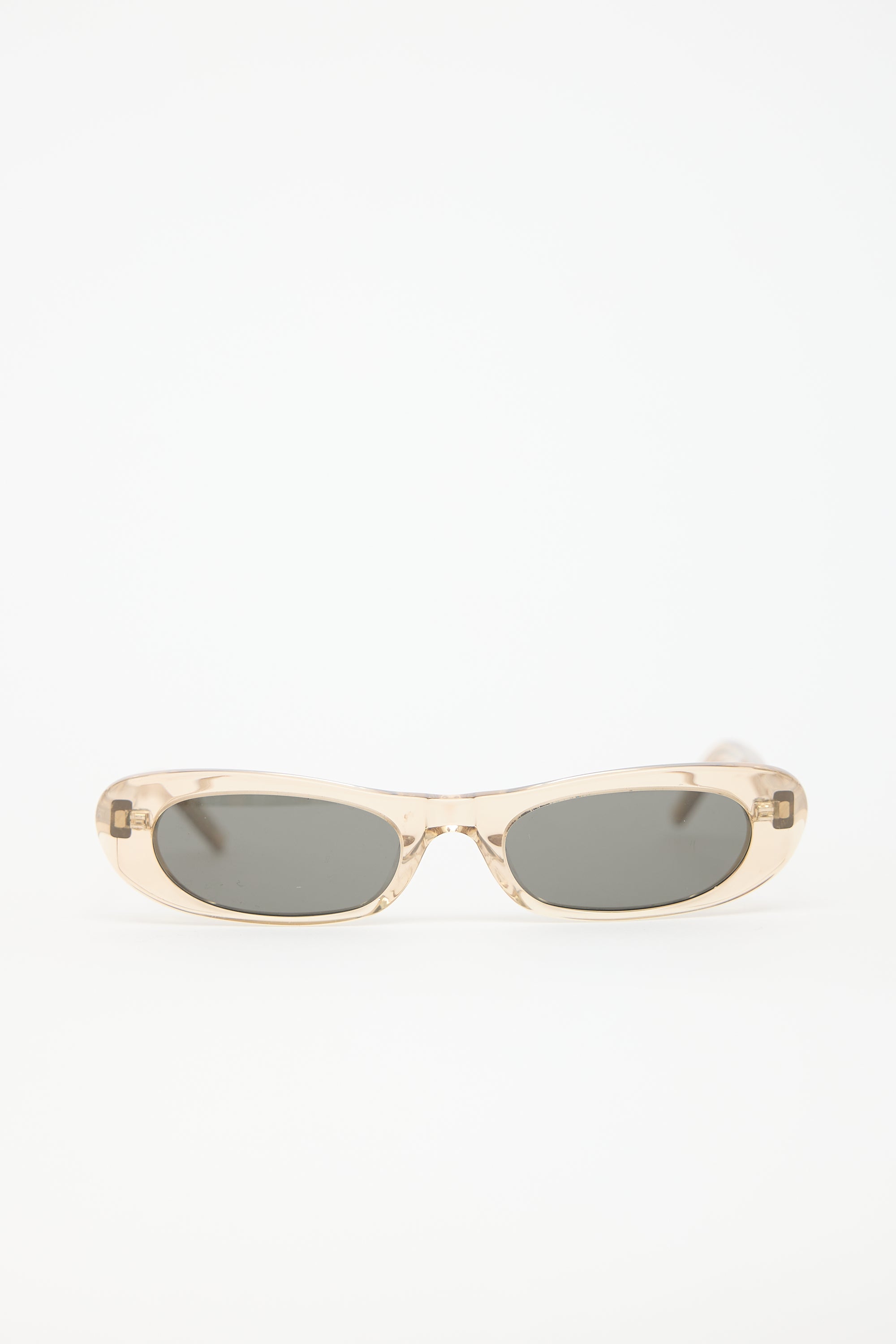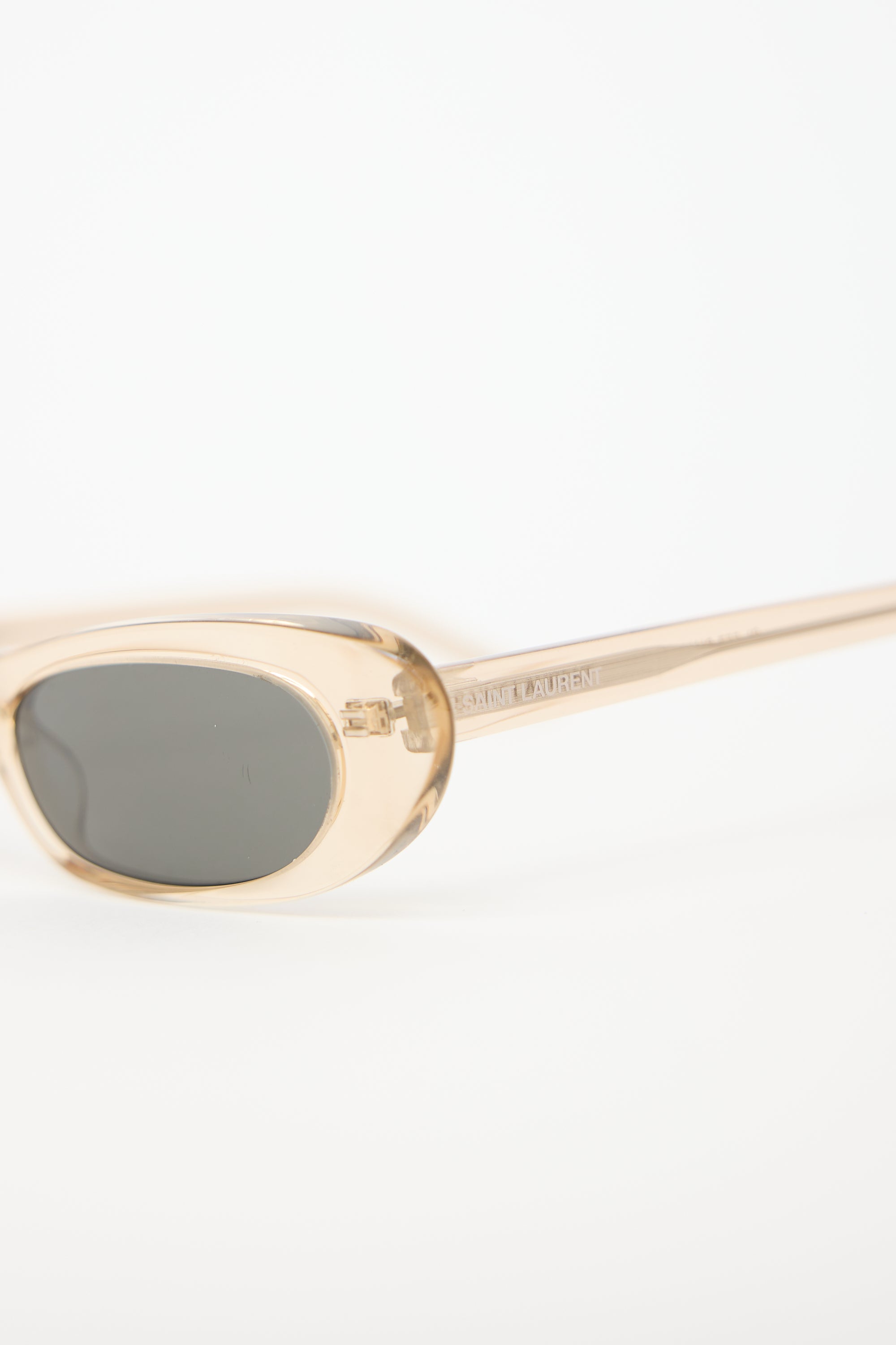 Pre-owned Saint Laurent SL557 Shade sunglasses featuring grey tinted lenses, translucent beige acetate tapered frame, and etched logo at temples. Comes with original case and care guide.