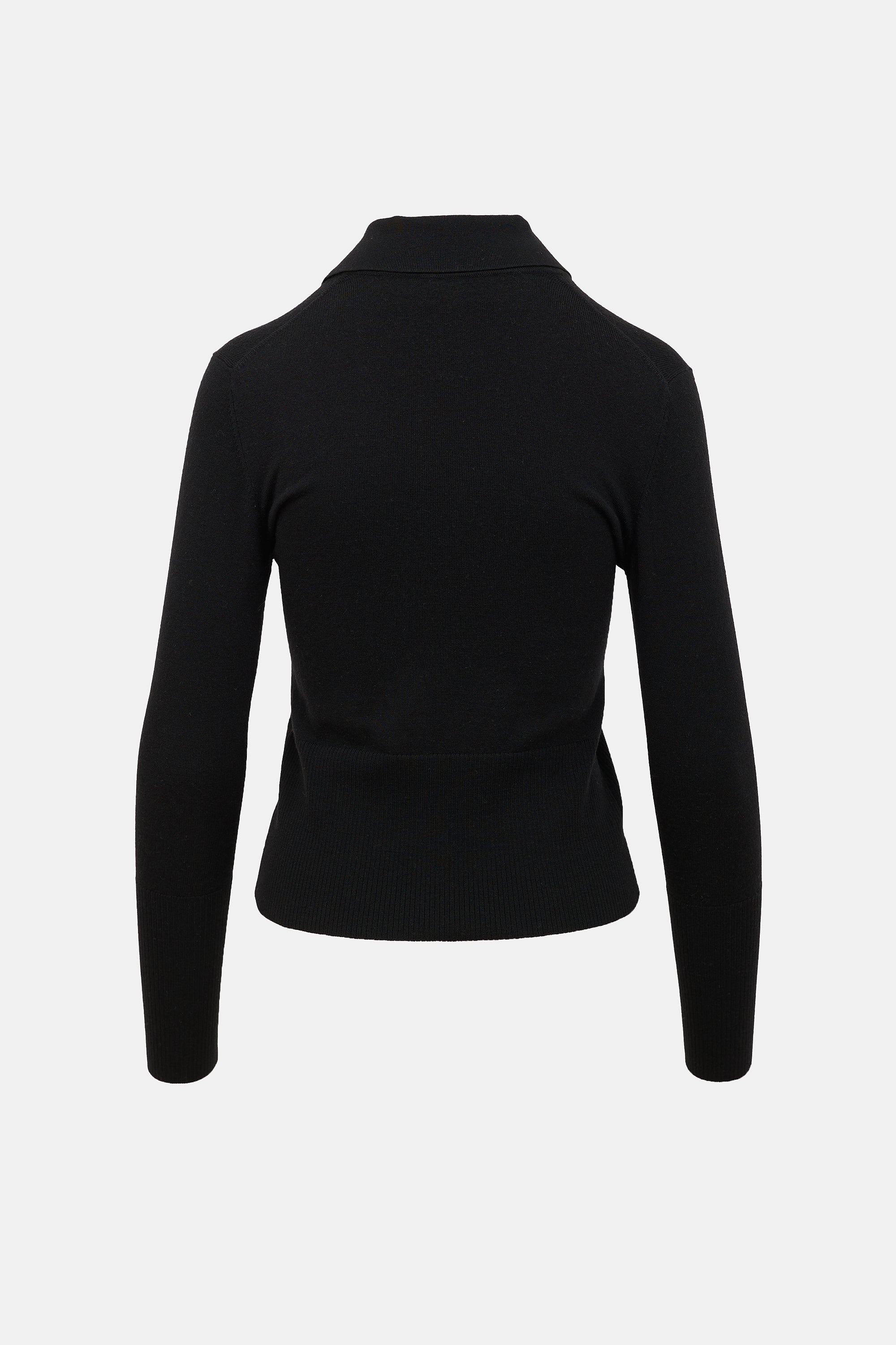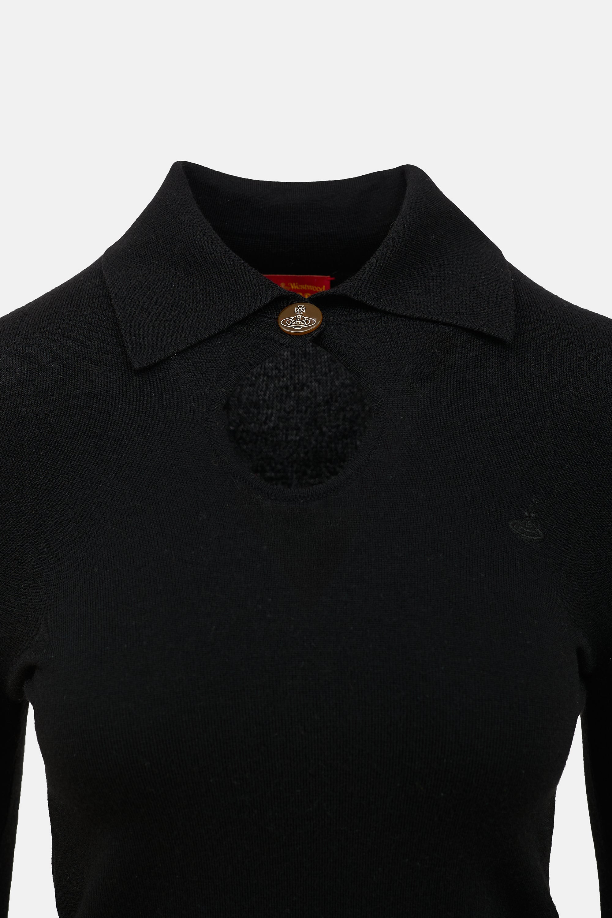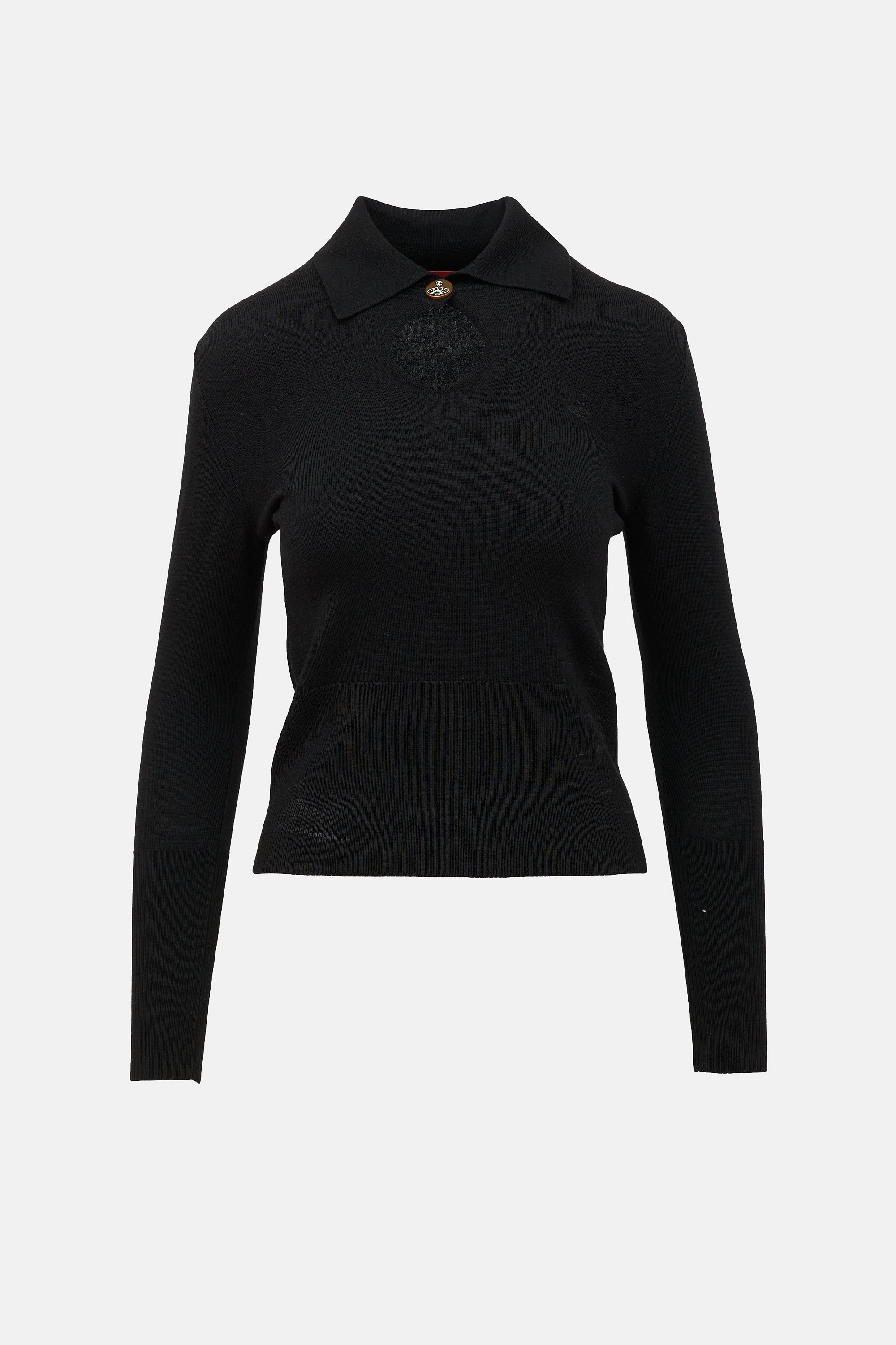 Pre-owned Vivienne Westwood black polo sweater featuring classic collar, V-neckline with button closure, elongated ribbed hem and cuffs, and tonal embroidered Orb at chest.