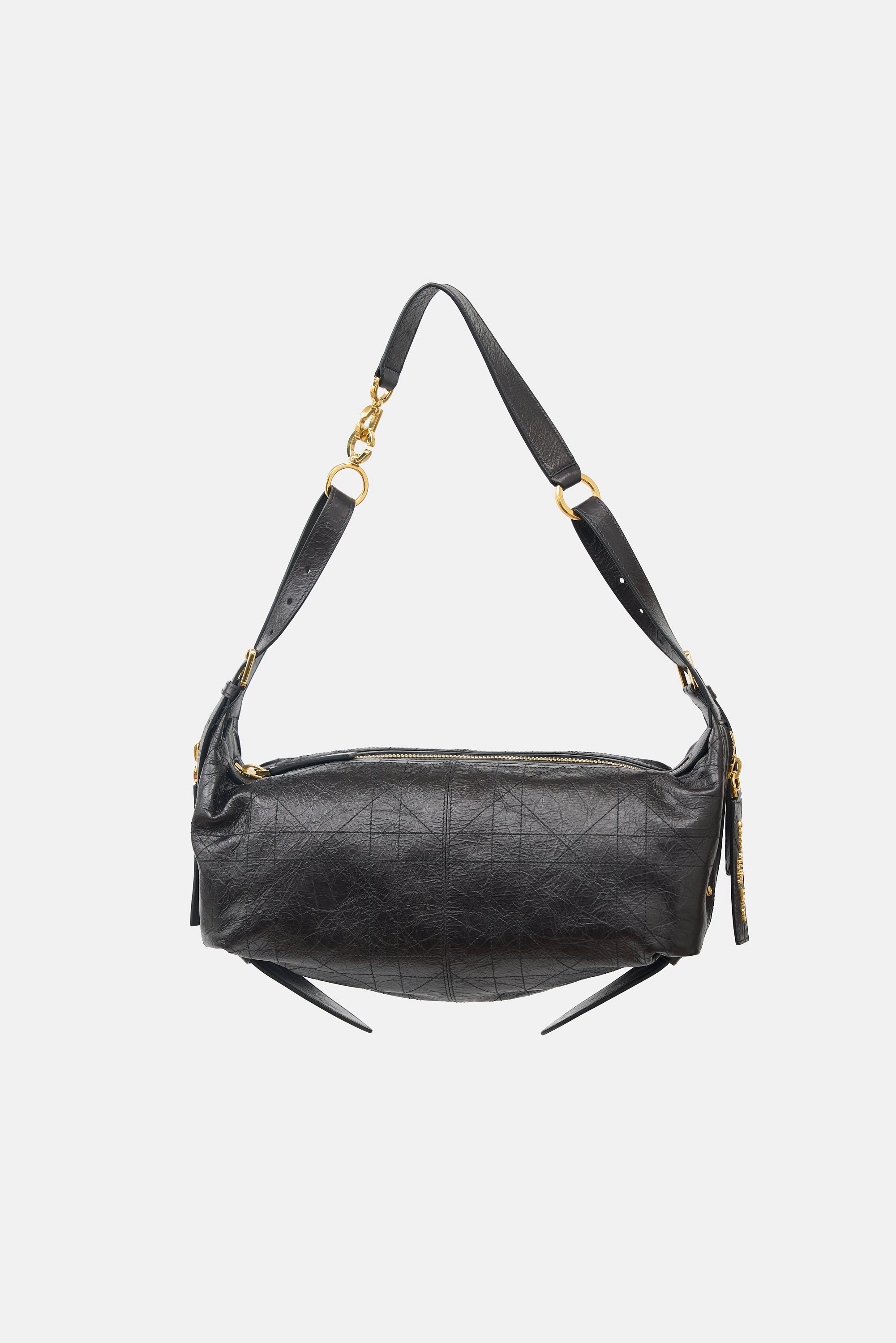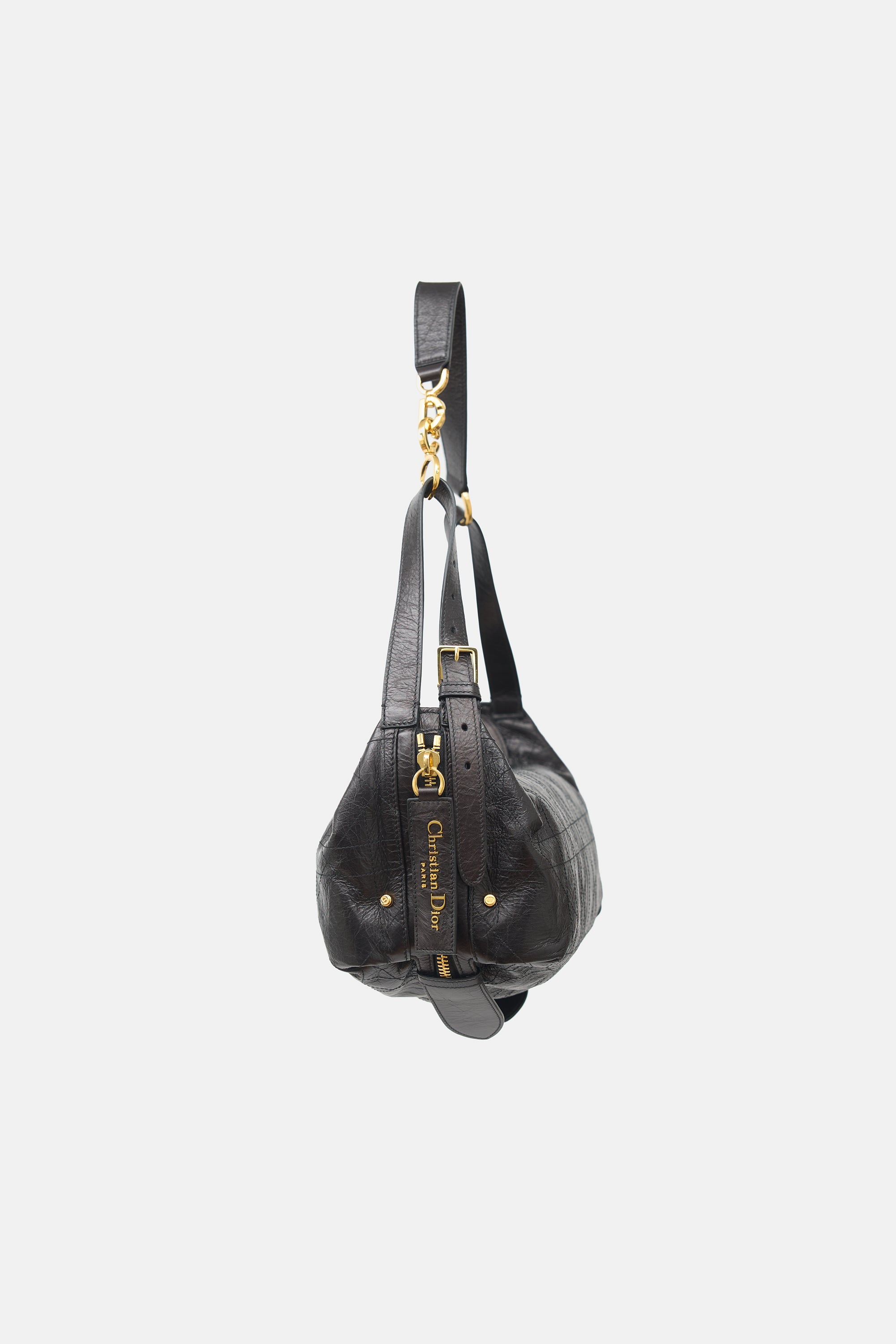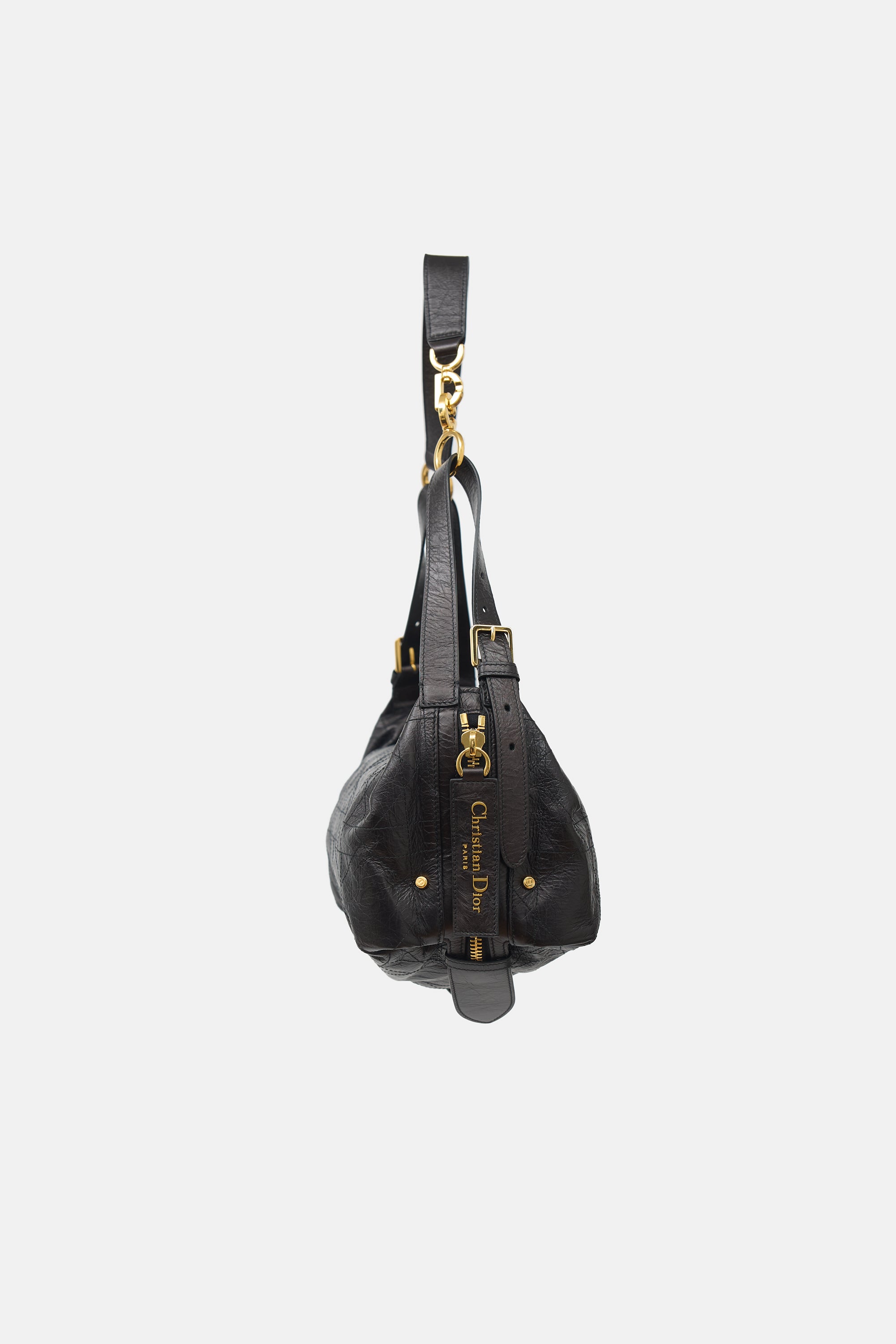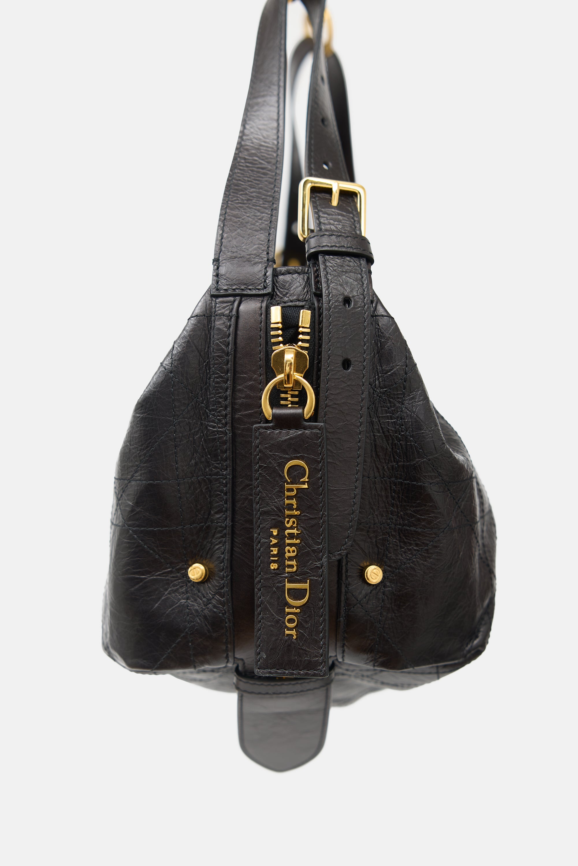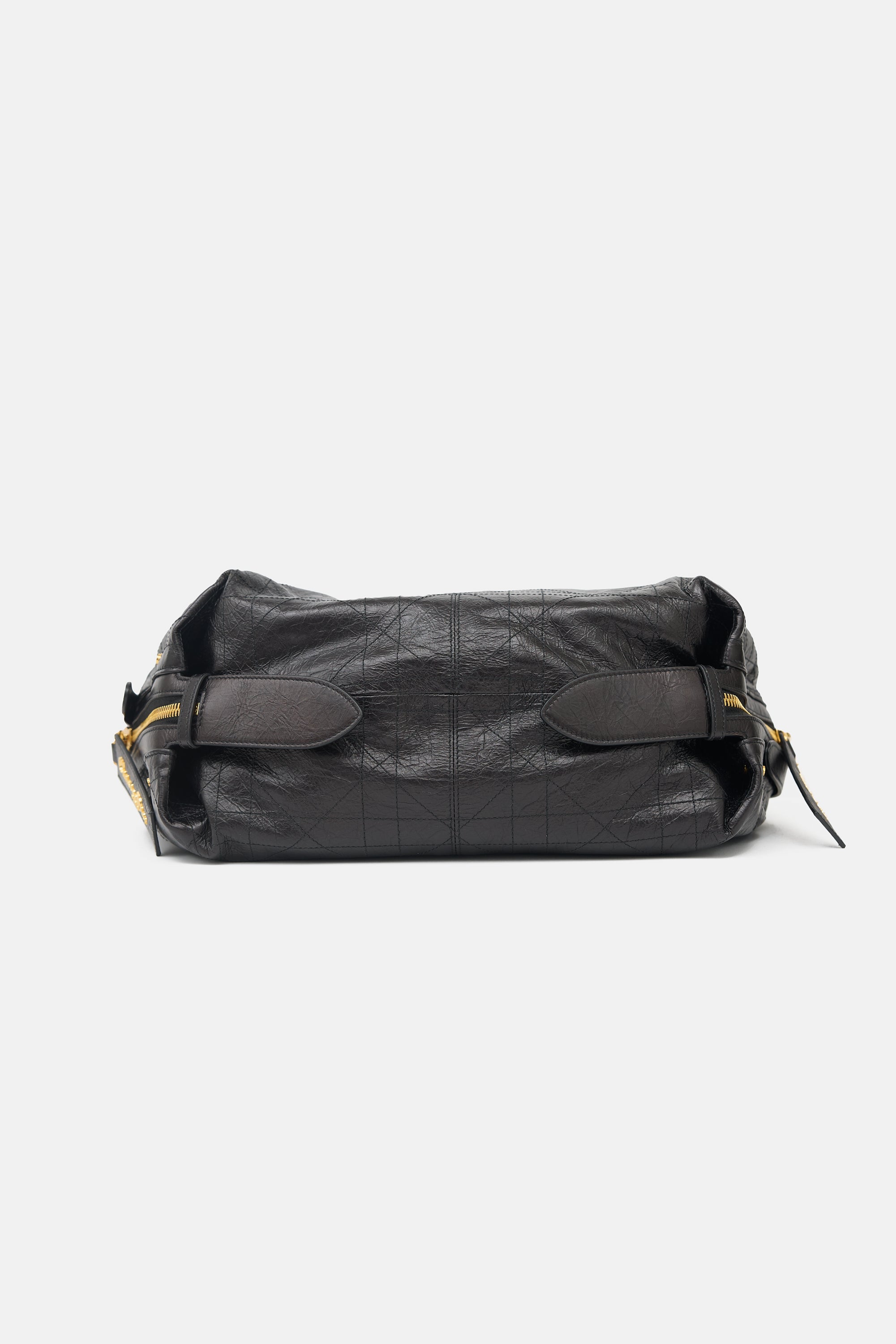 Pre-owned Christian Dior black crinkled leather D-Journey bag featuring a signature Cannage stitched exterior, gold tone hardware, adjustable shoulder strap with CD hardware, side zip pockets with logo pulls, top zip closure, and one main compartment with one zip pocket. Comes with original dust bag.