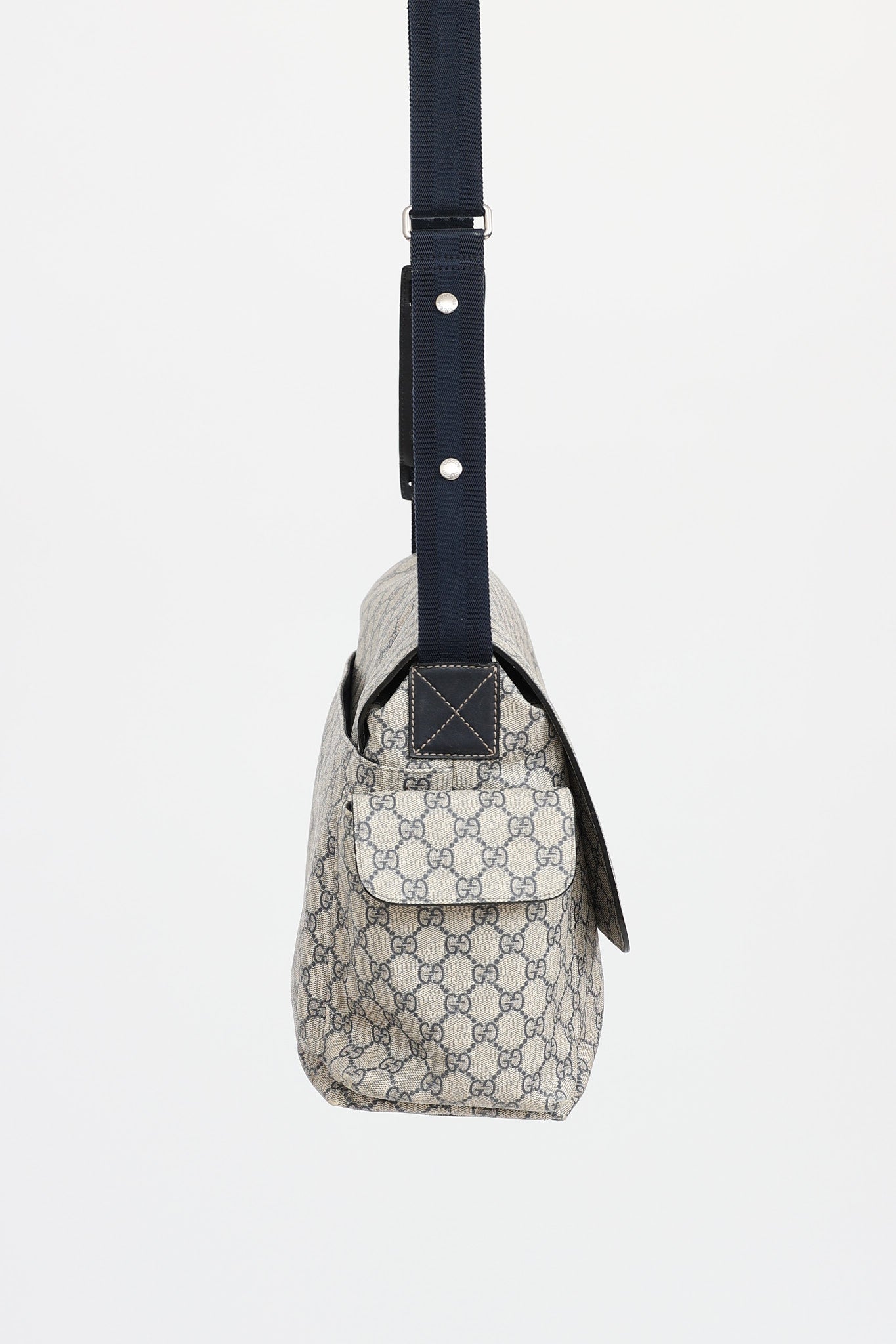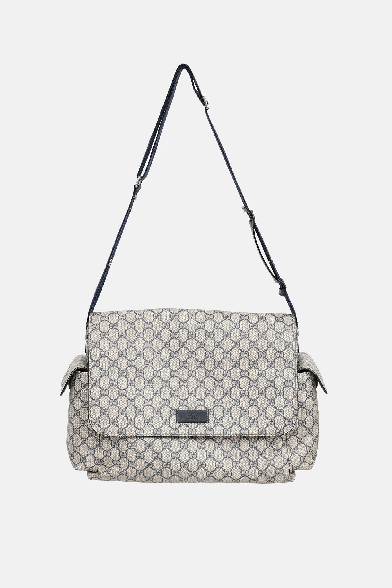 Pre-owned Gucci navy GG Supreme diaper bag featuring GG monogram motif, navy webbed adjustable strap with leather comfort pad, two side pockets with magnetic closure, flap with magnetic closure and logo embossed leather tag at front, velcro slip pocket at back, one main interior pocket with three slip pockets, and brown reusable changing mat. Includes original dust bag.