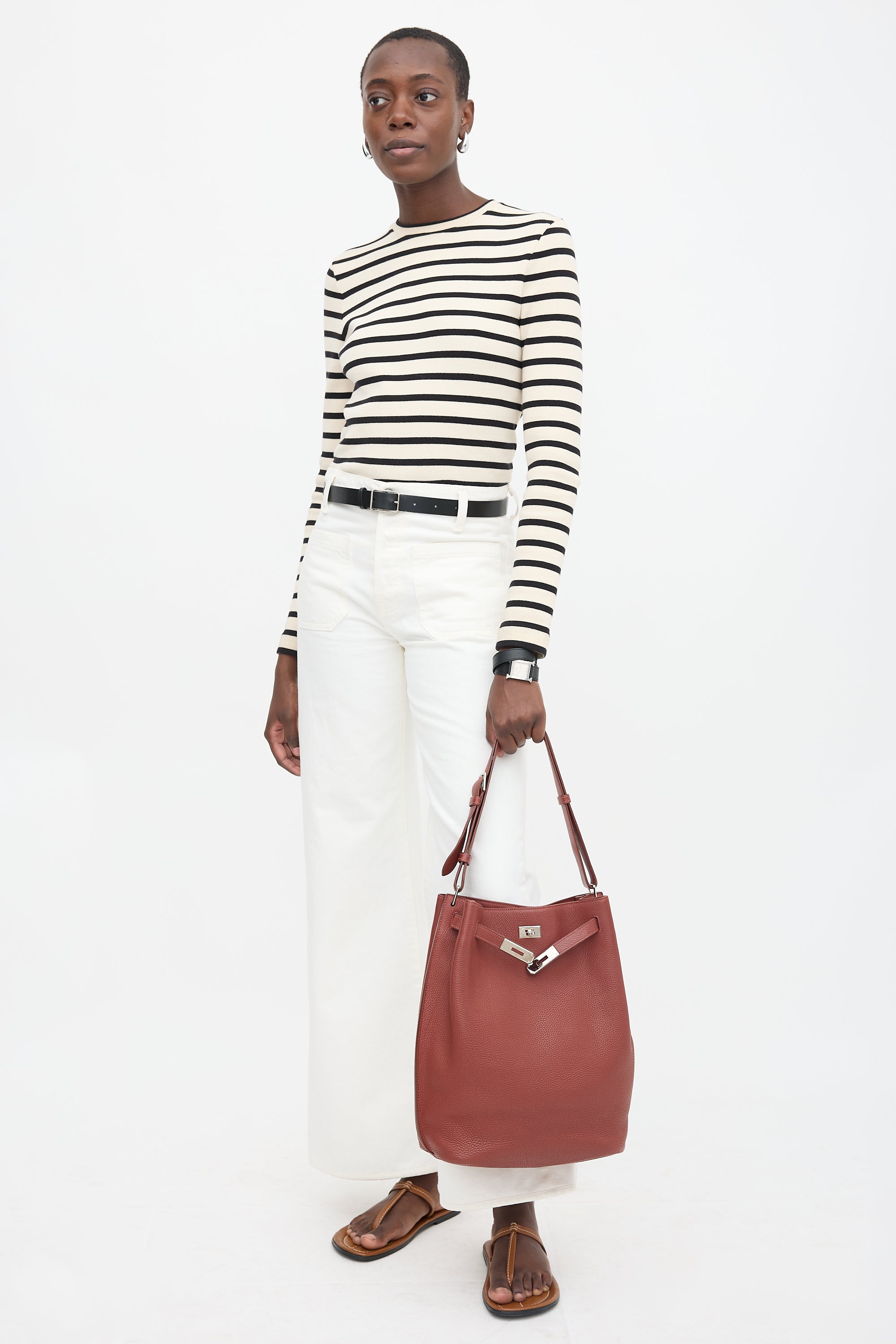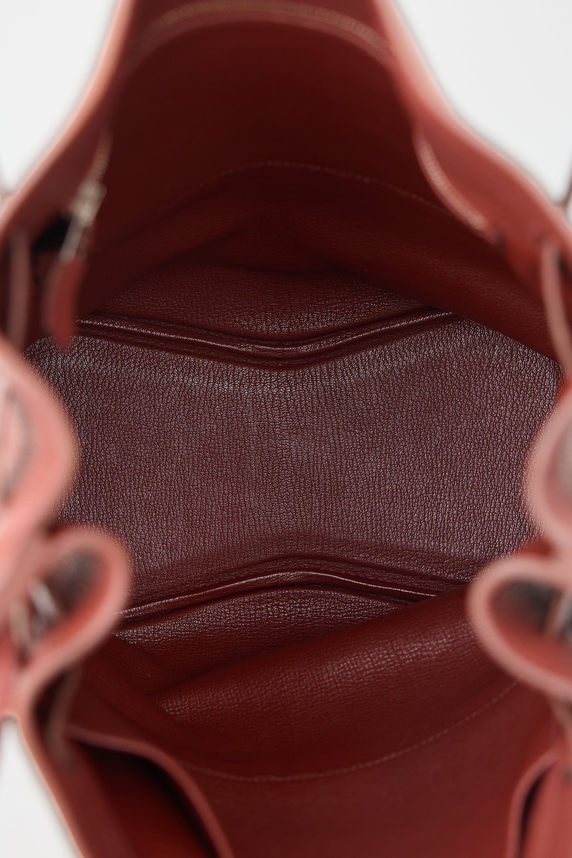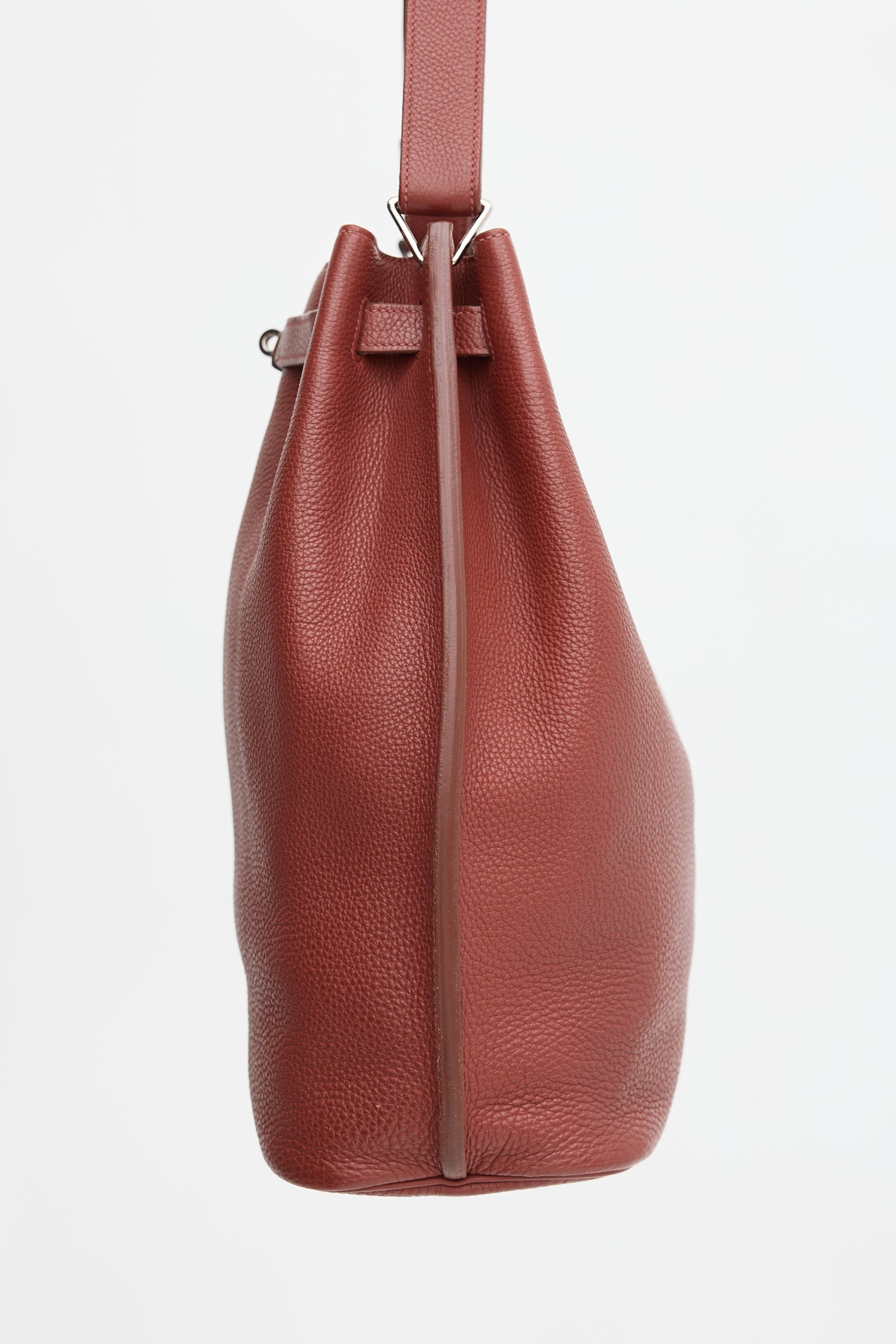Pre-owned Hermès 2010 Togo leather So Kelly 26 shoulder bag in Rubis featuring Palladium hardware, adjustable top handle, sangles with etched logo plaque, touret closure, and one lined main compartment with one zip pocket and one slip pocket. Comes with original dust bag.