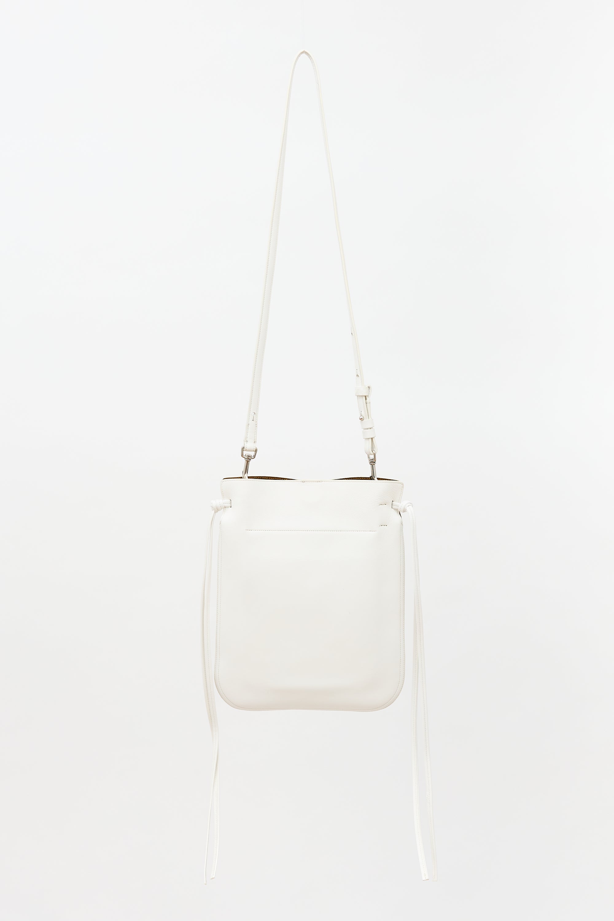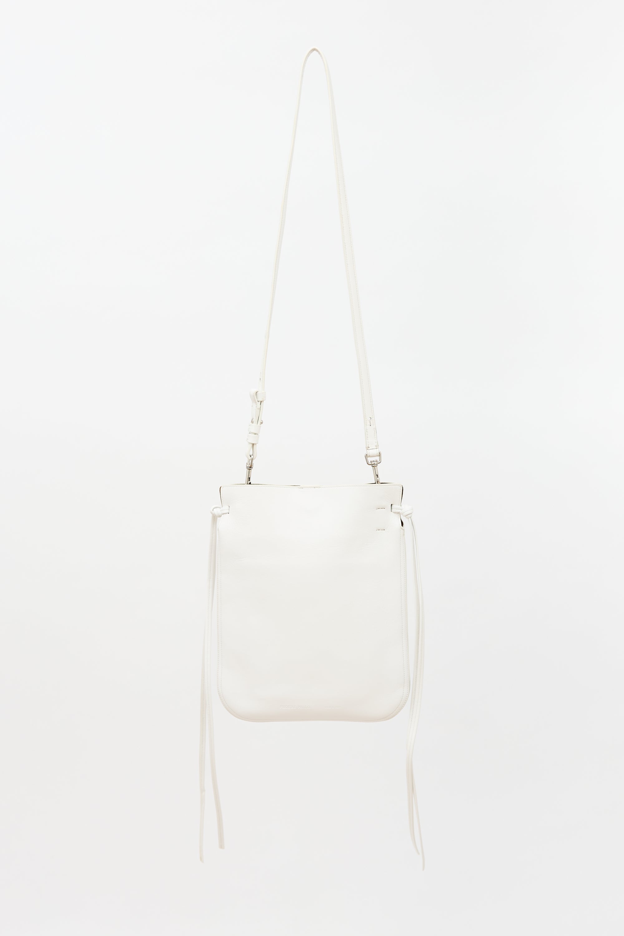 Pre-owned Phoebe Philo white leather Gig Pouch bag featuring silver tone hardware, detachable and adjustable shoulder strap, tie detail at sides, open top with magnetic closure, and one main compartment with one slip pocket.