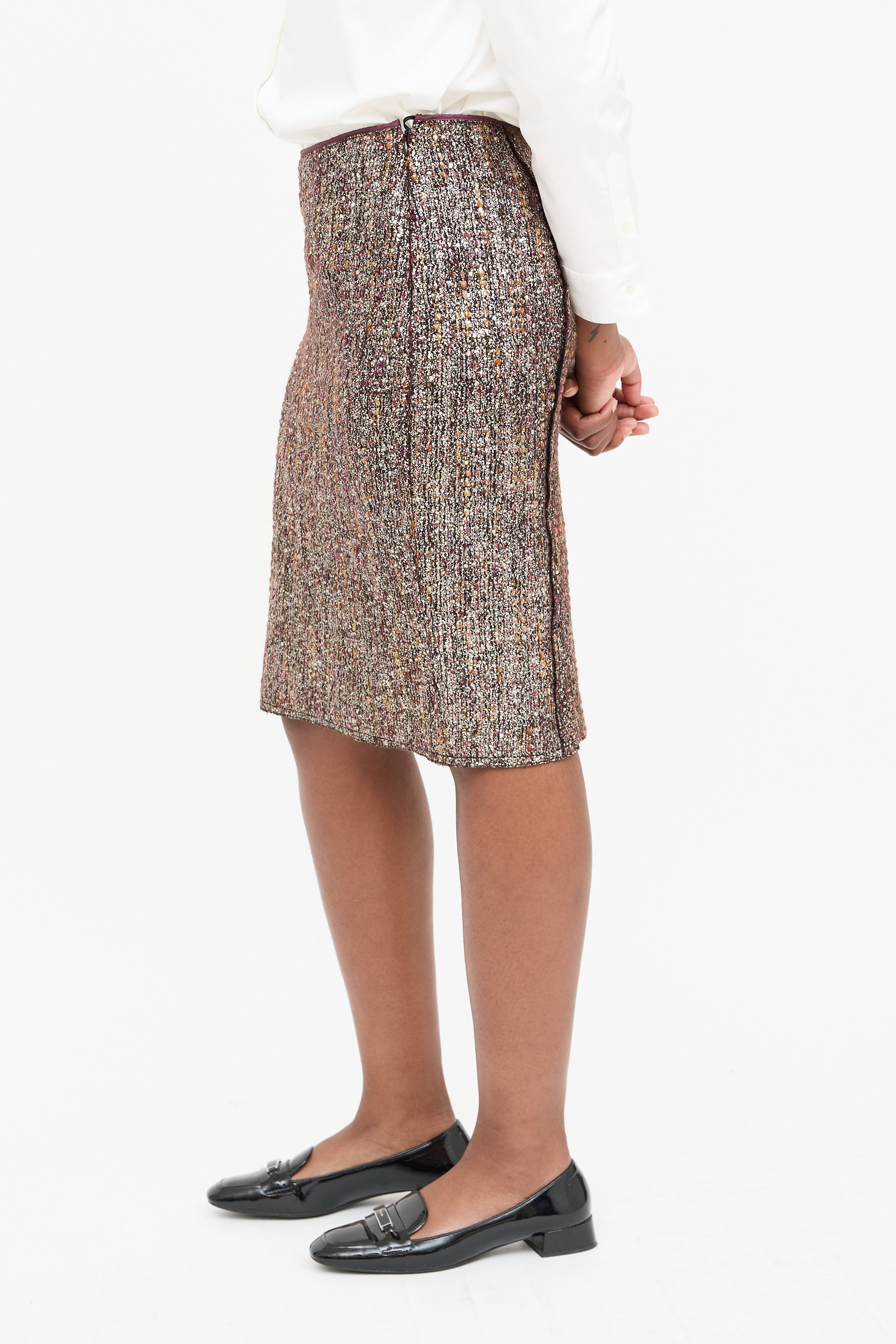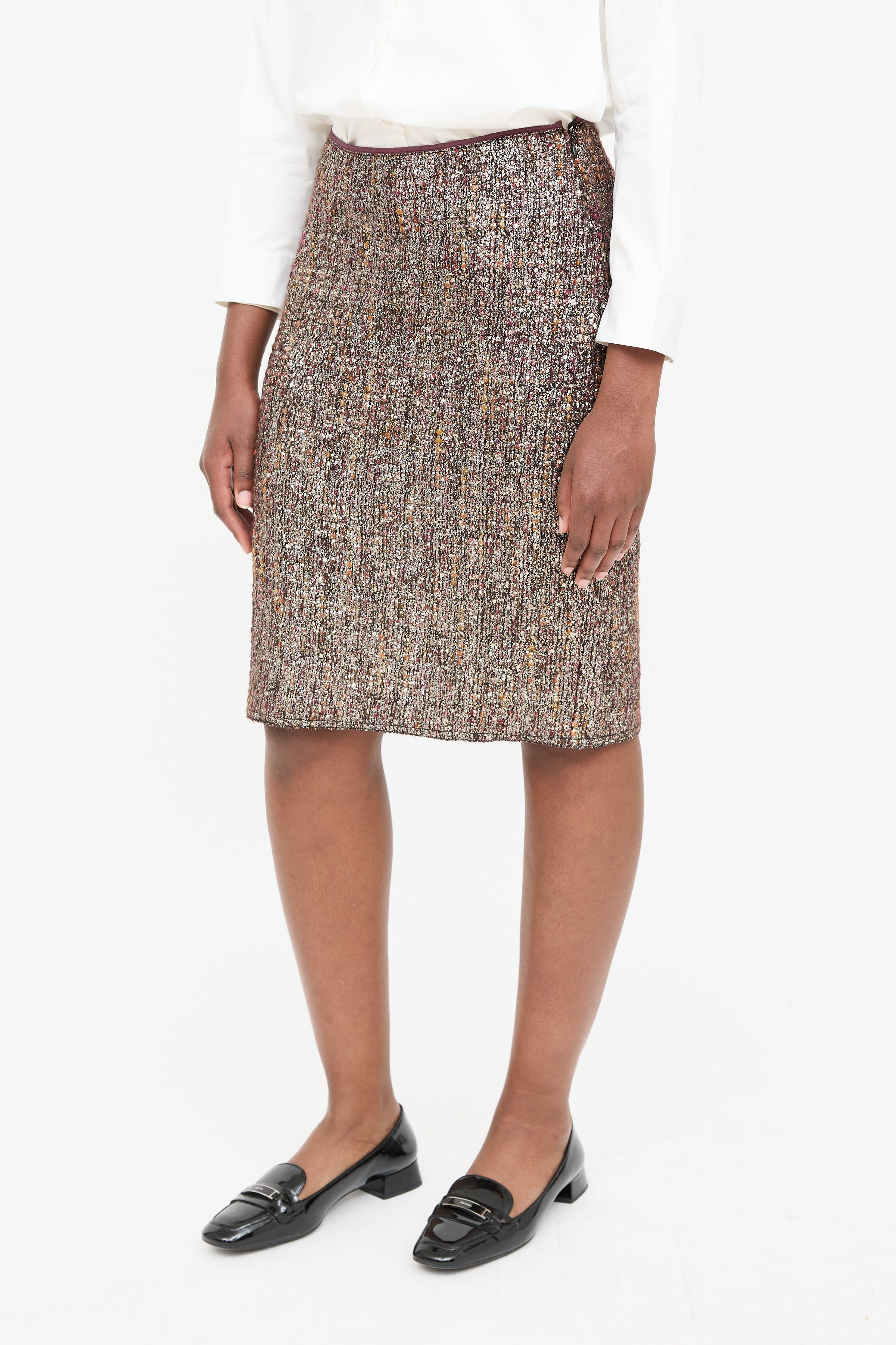 Pre-owned Prada purple wool skirt featuring a multicolour metallic tweed weave throughout, webbed trim at waist, and zip at side with hook and eye closure. Lined.