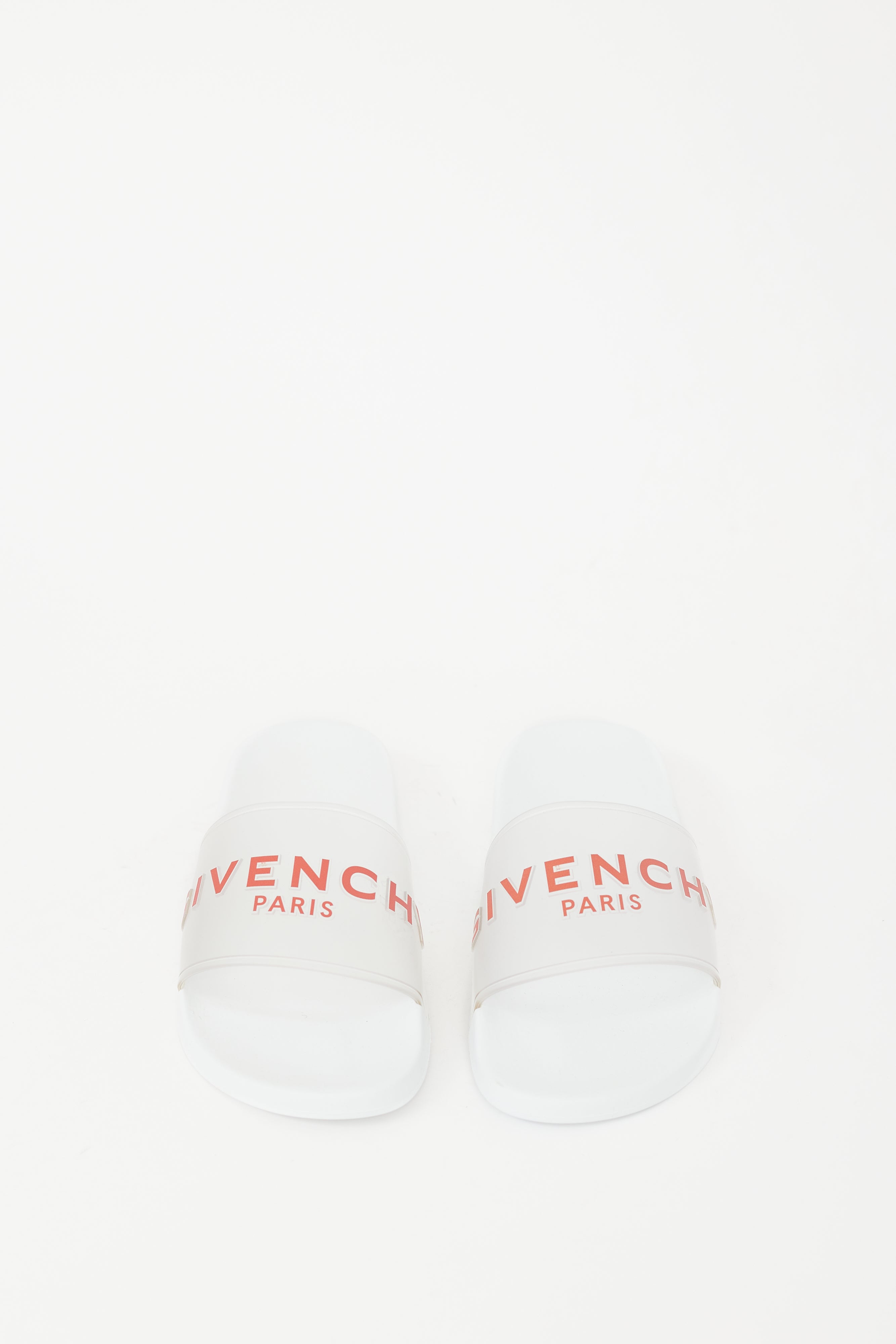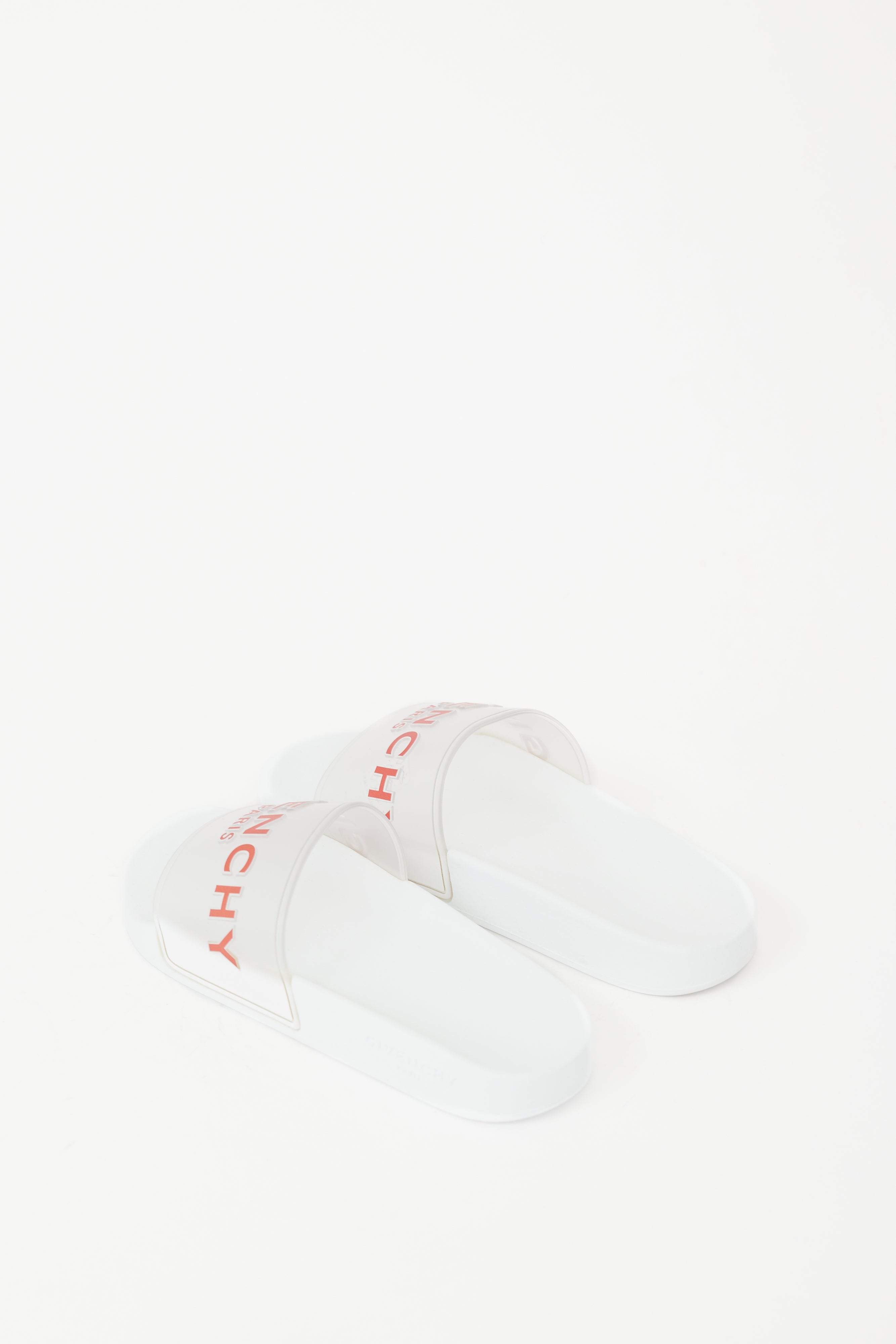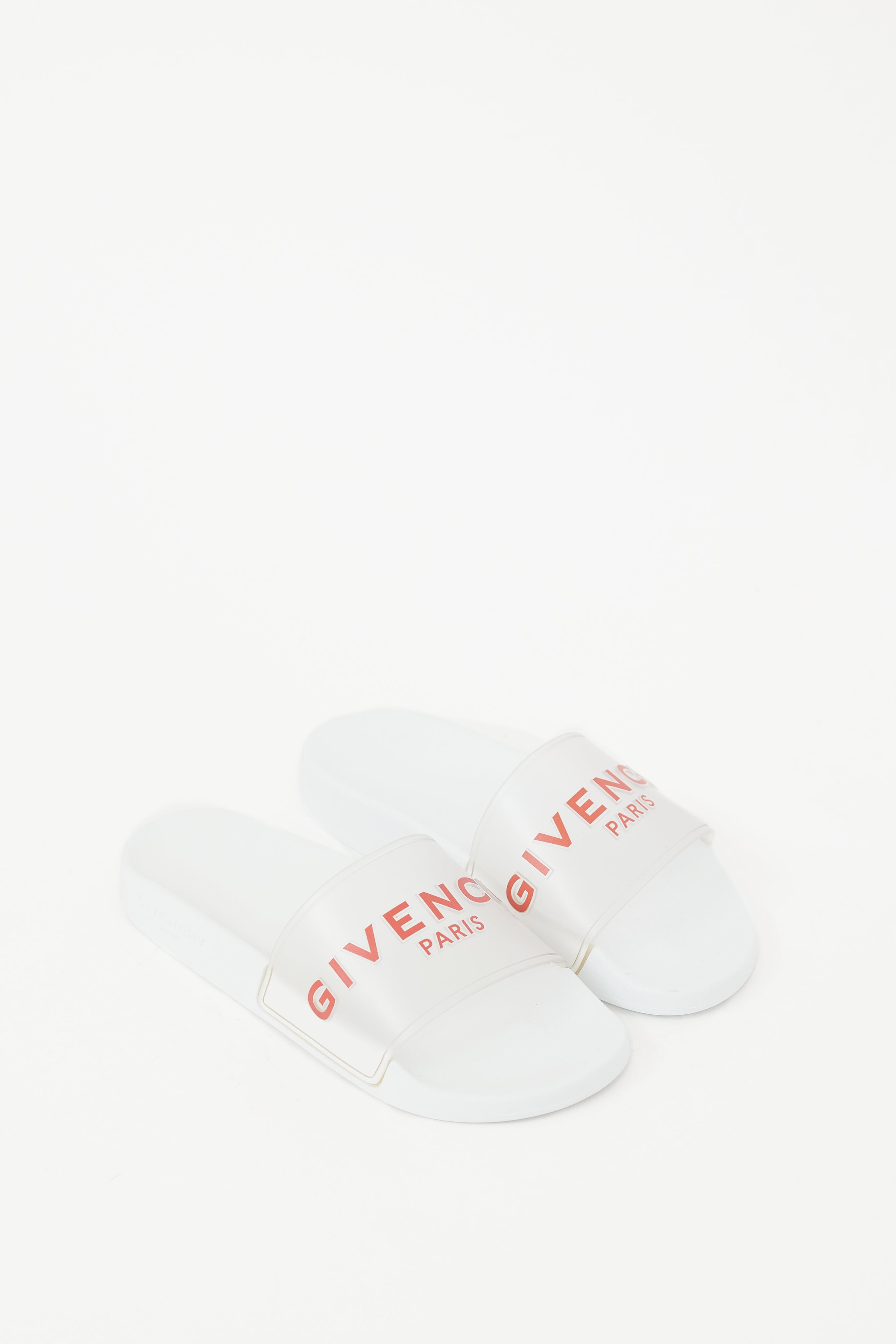 Pre-owned Givenchy white rubber slides featuring PVC red logo, embossed logo on side and slip on entry. Shoes come with original dustbags.