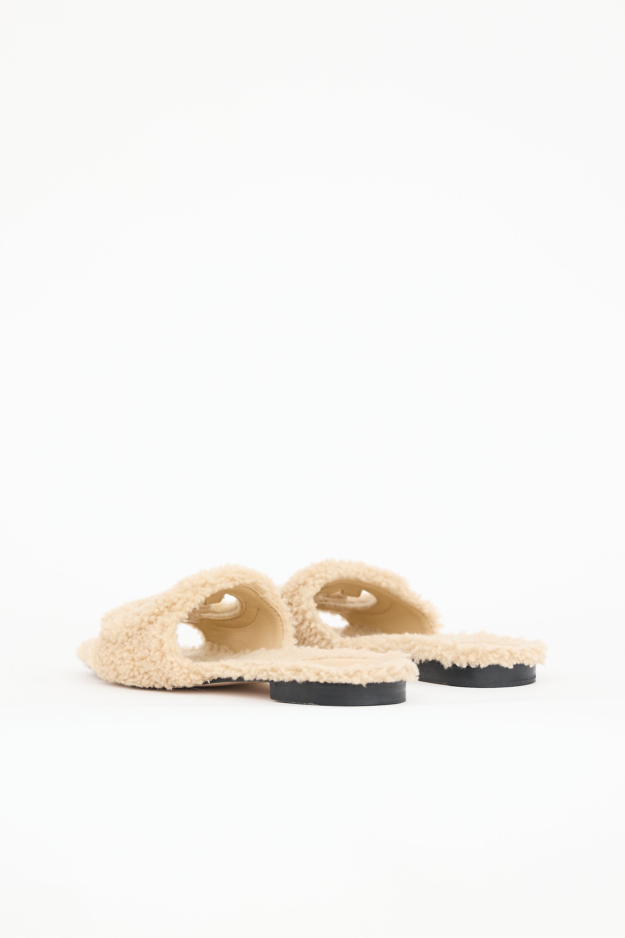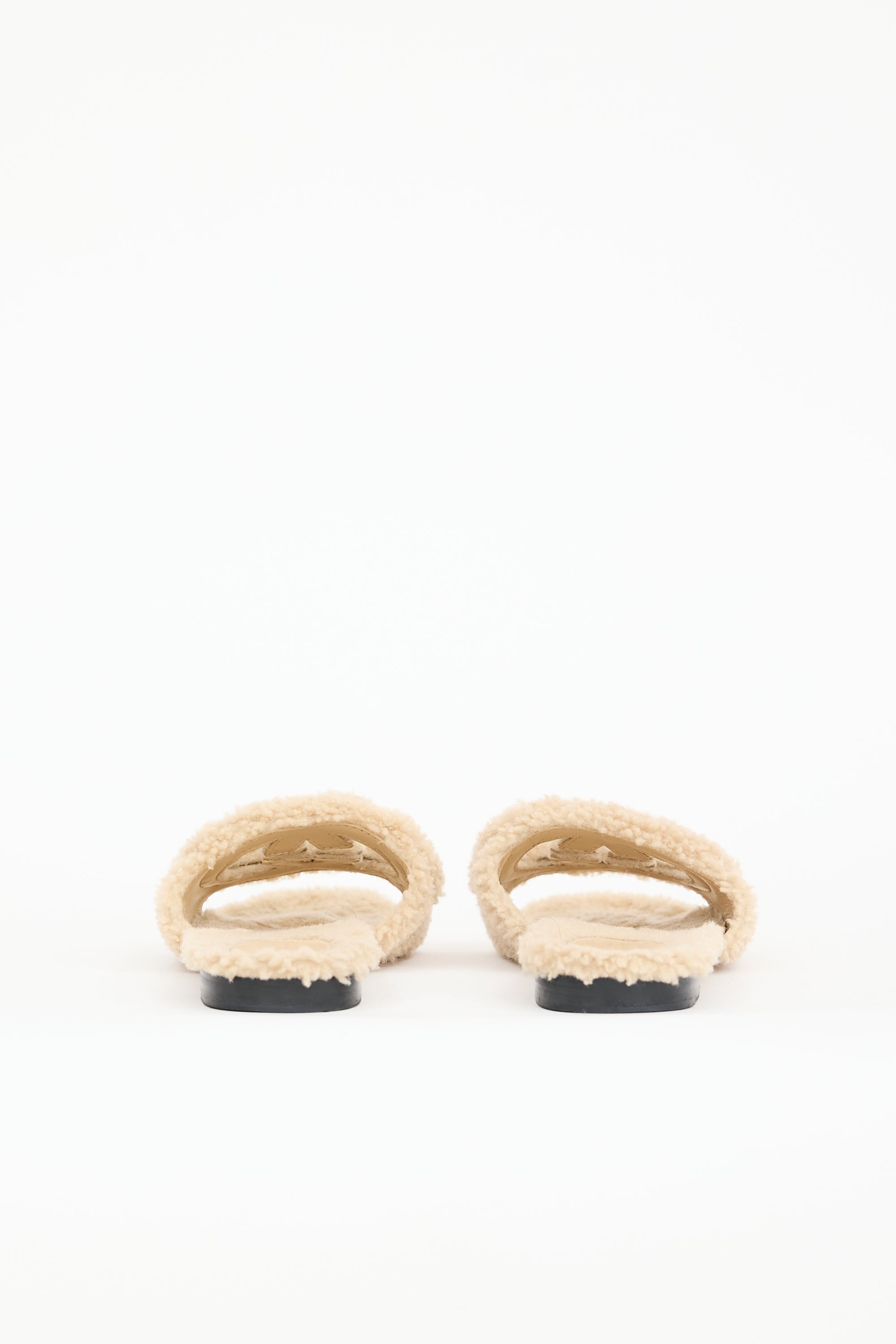 Pre-owned Gucci beige shearling slides featuring tapered square toe, interlocking GG logo at vamp, and slip on entry.