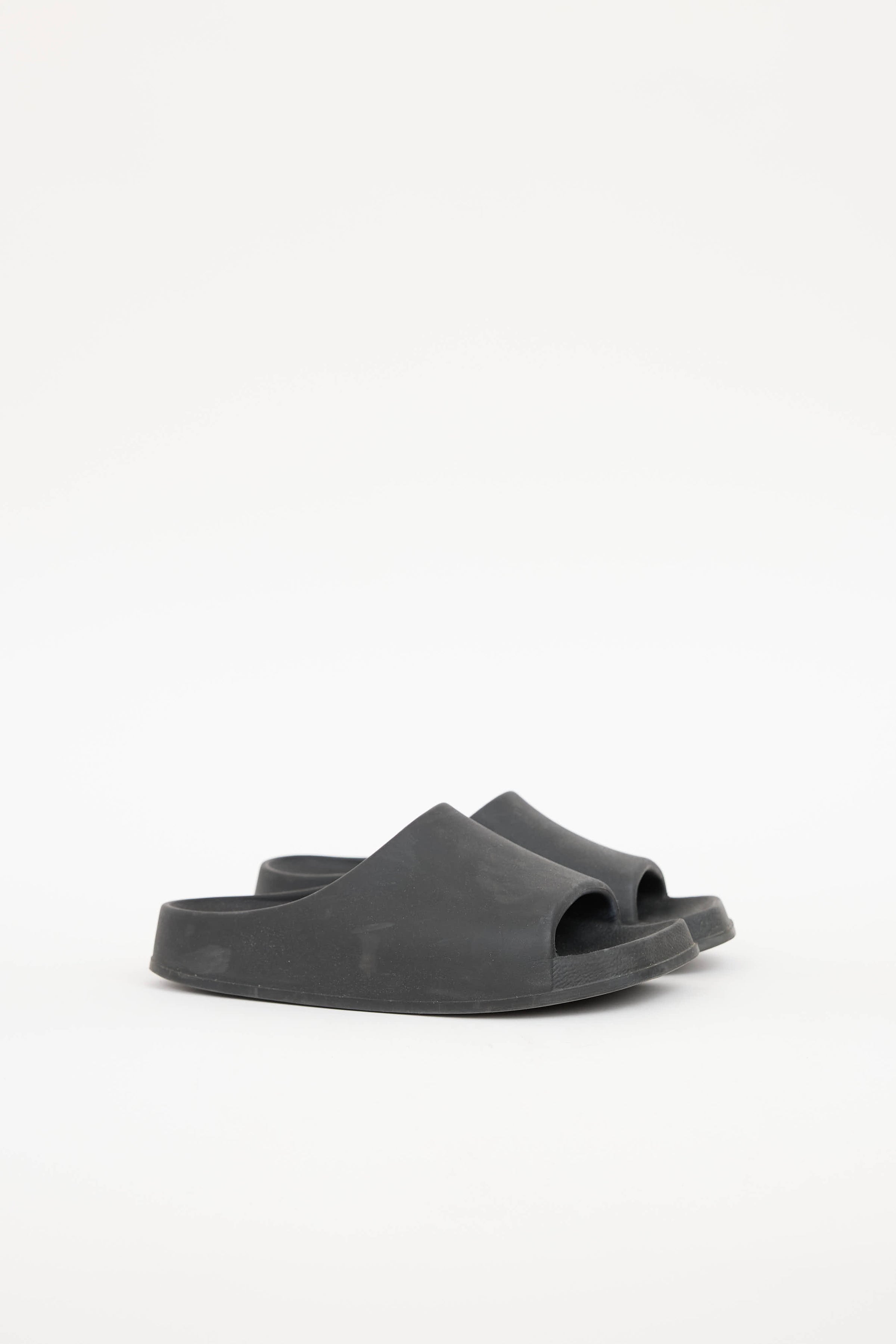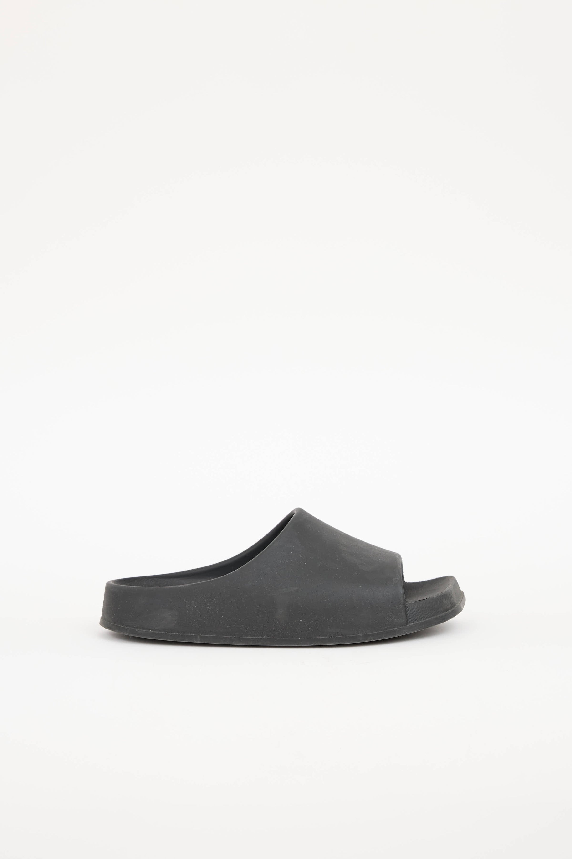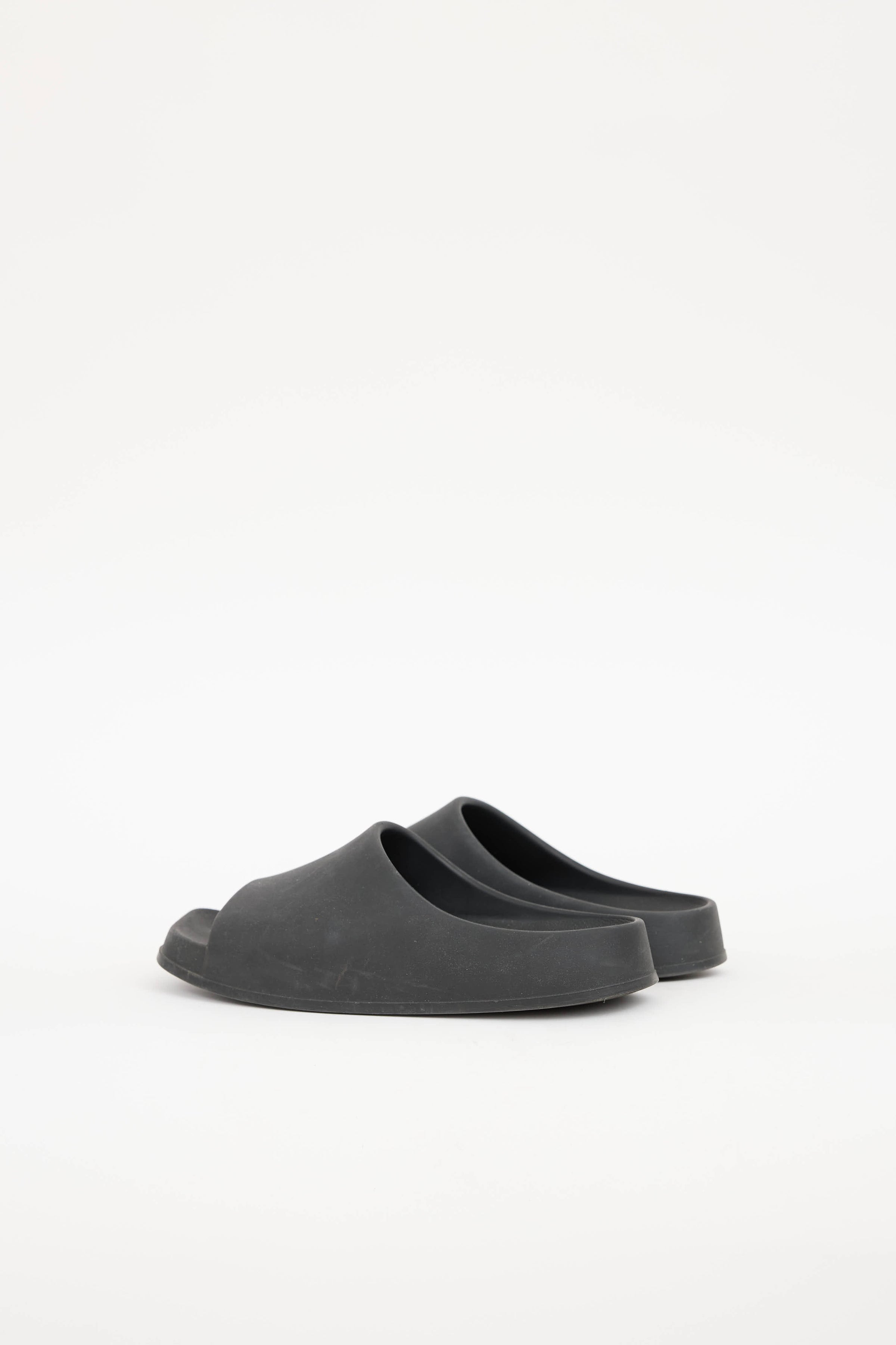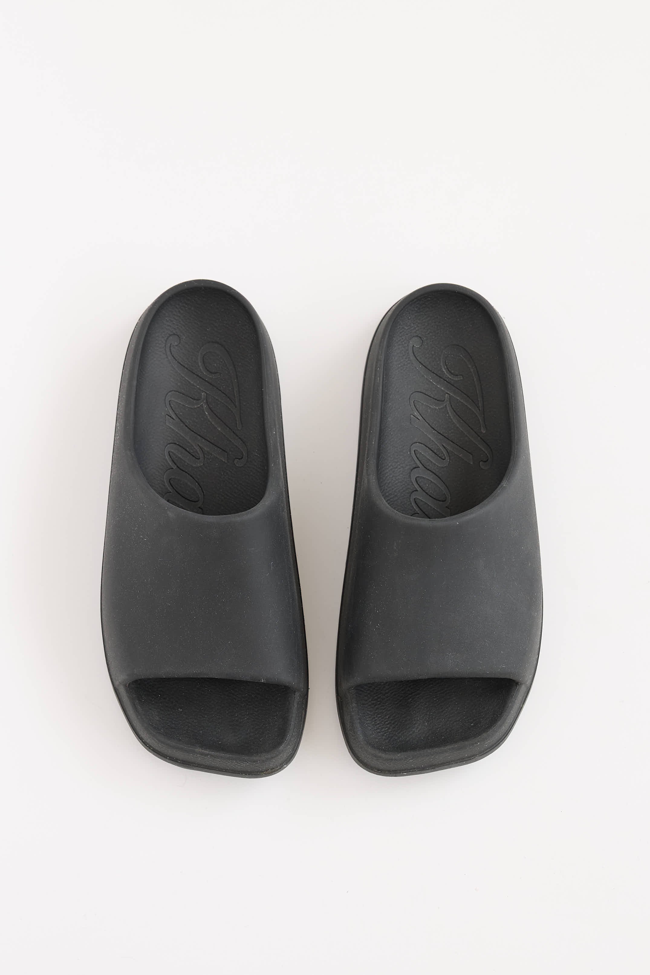 Pre-owned Khaite black Brighton rubber slide featuring square toe, strap at vamp, and debossed logo at insole.