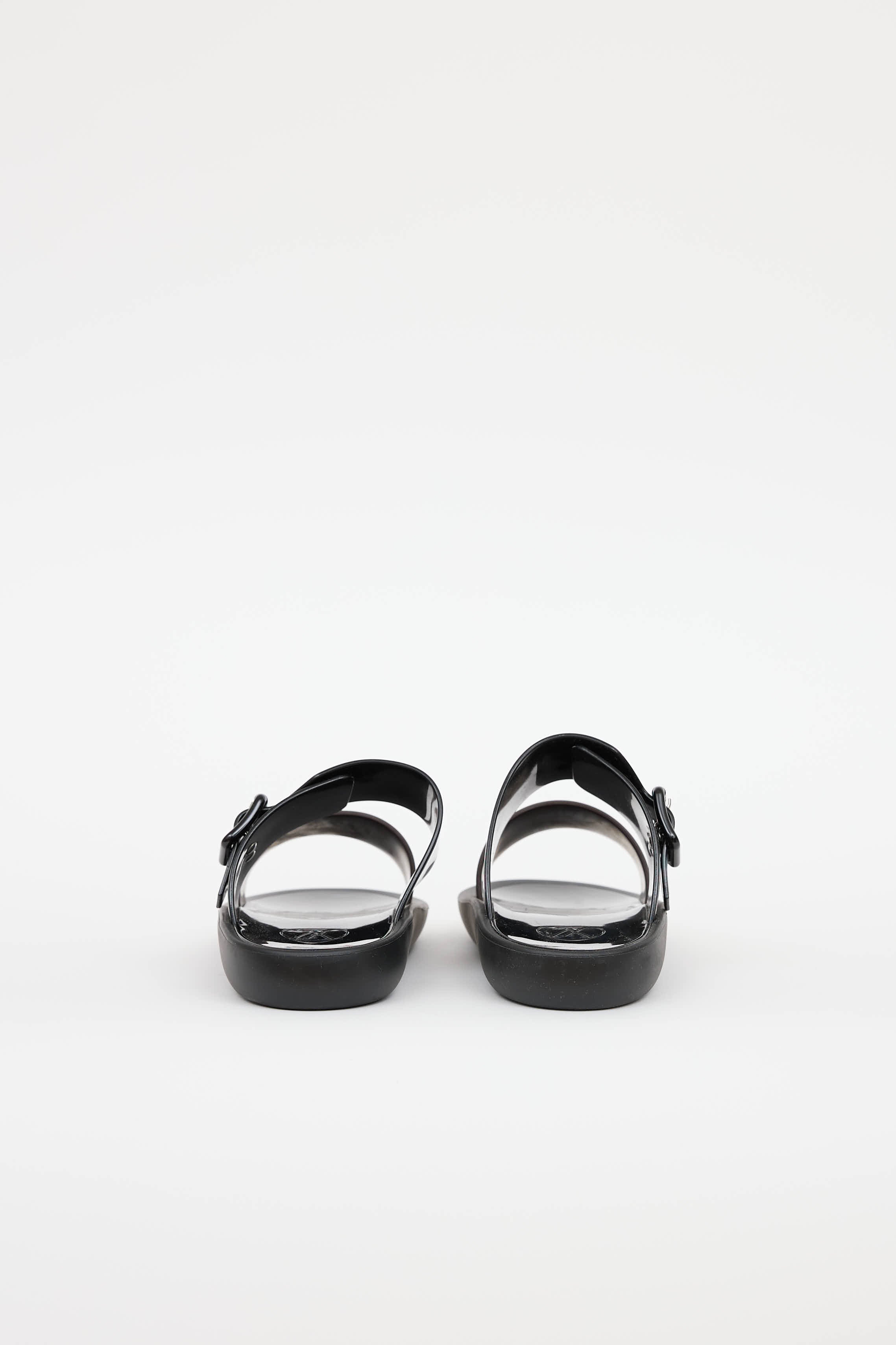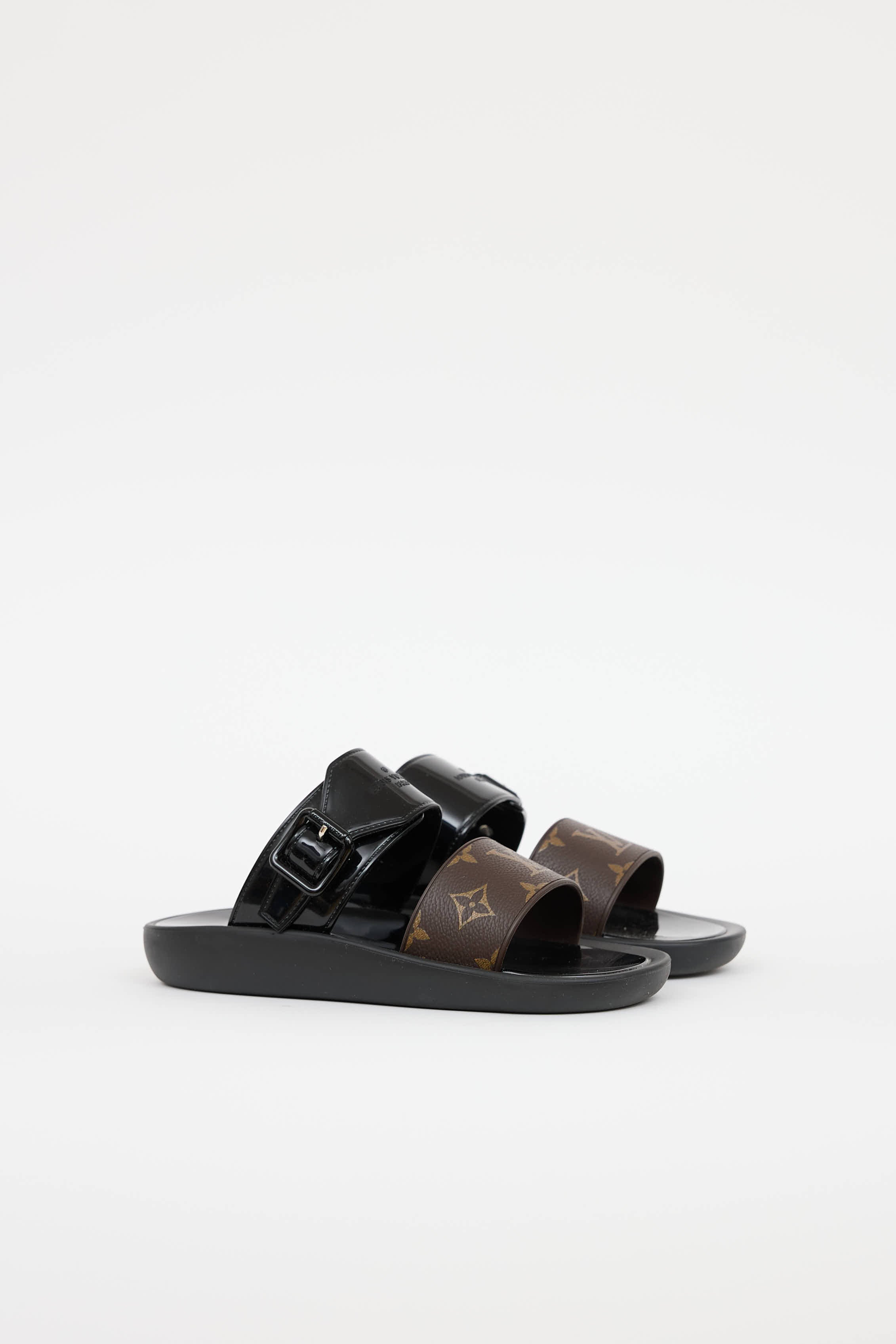 Pre-owned Louis Vuitton black and brown Monogram Sunbath flat slide featuring adjustable black patent buckle crossover strap, brown Monogram canvas strap, embossed logo and black rubber outsoles.