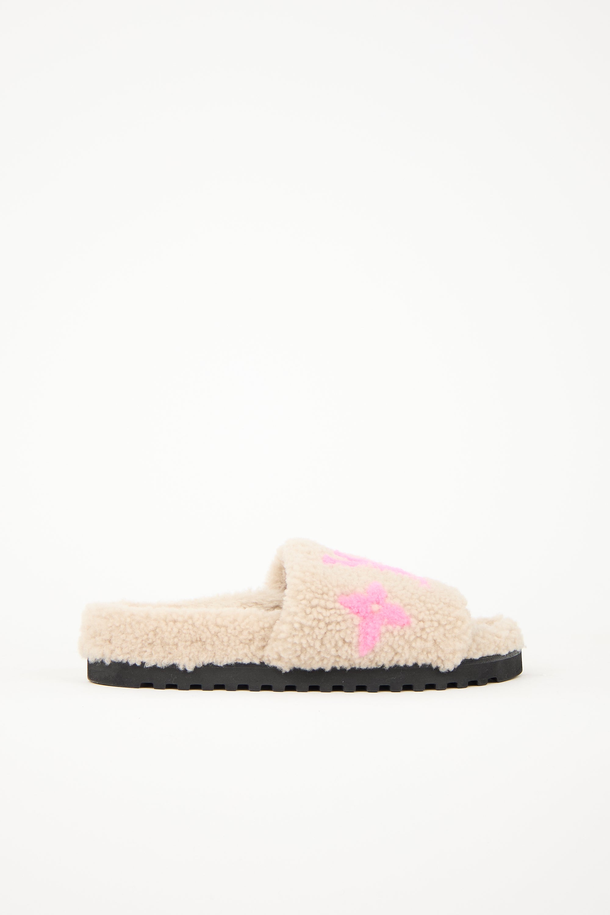 Pre-owned Louis Vuitton beige and pink shearling Bom Dia slides featuring open rounded toe, logo strap, and rubber outsole.