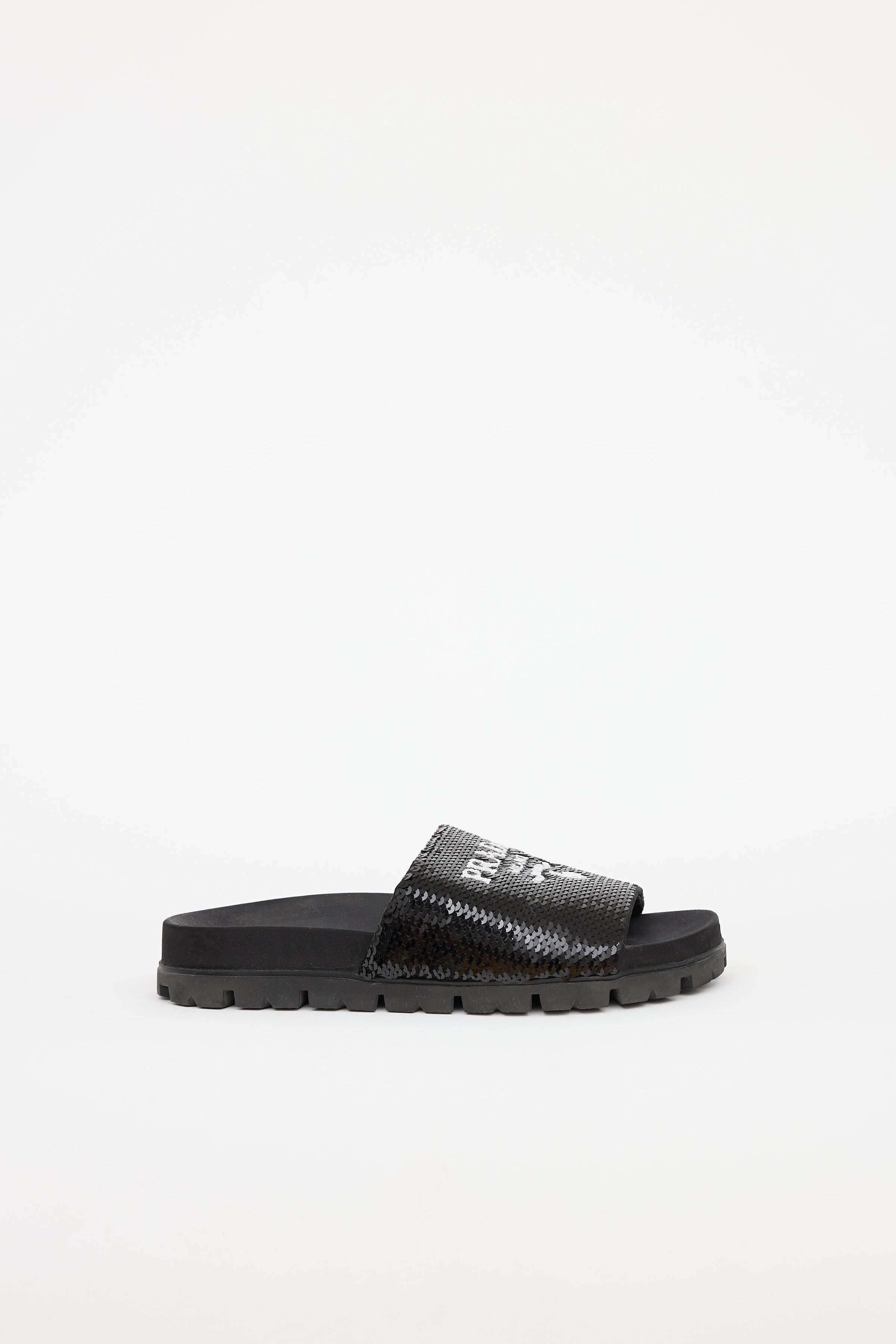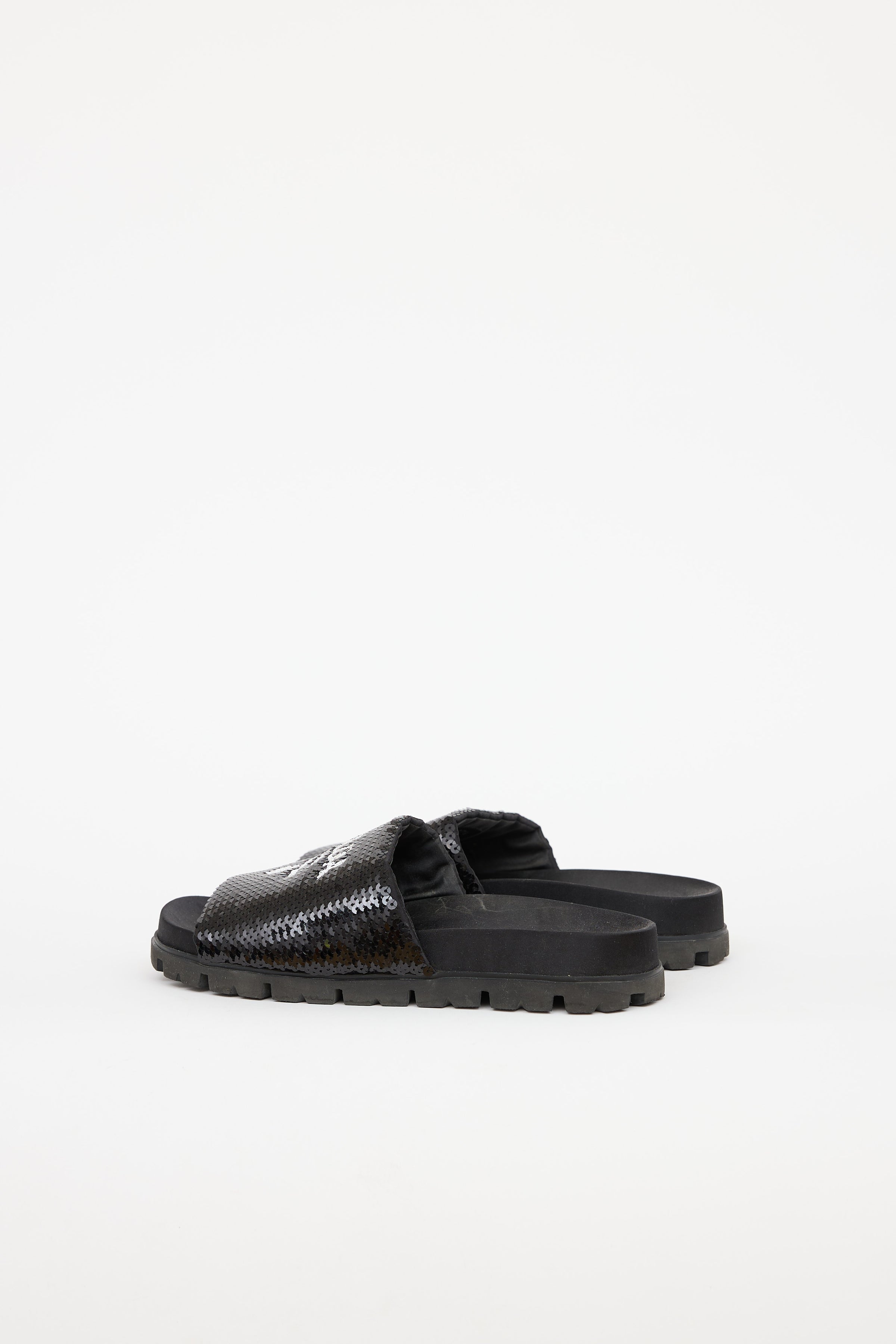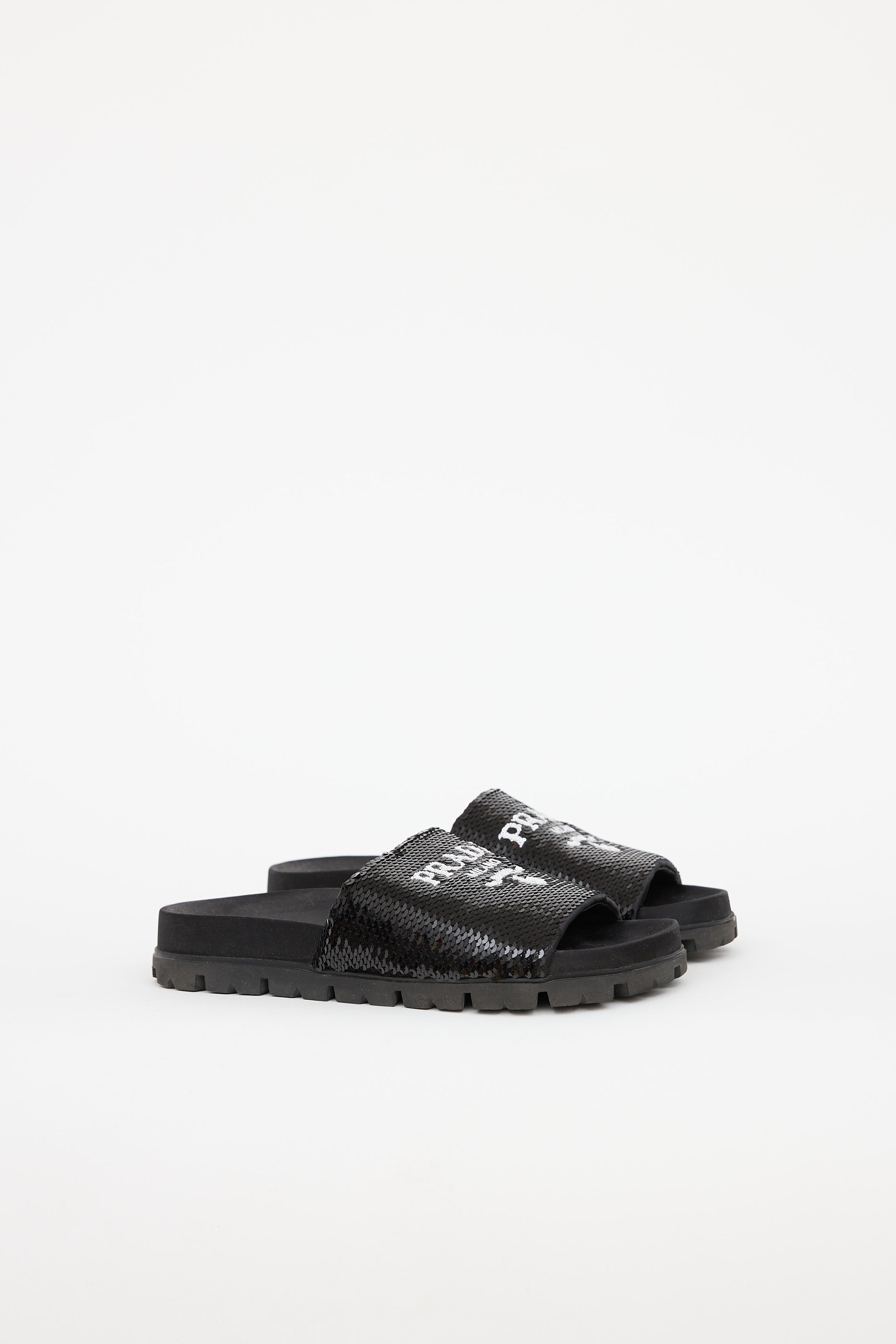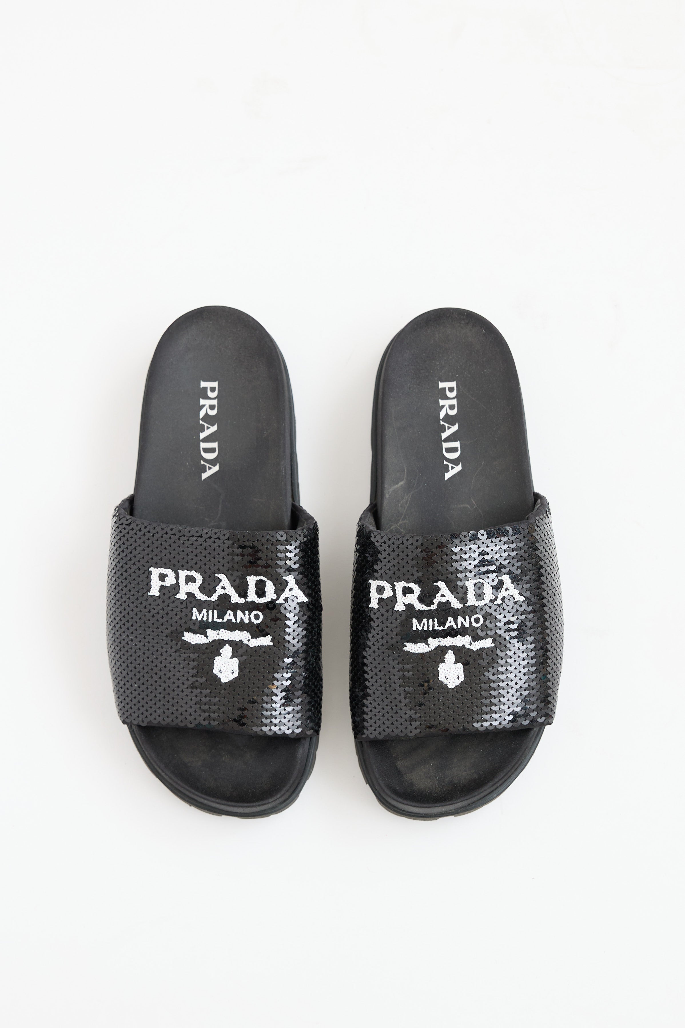 Pre-owned Prada black and white sequin logo slides featuring almond toe, sequin strap with logo at vamp, and treaded sole.