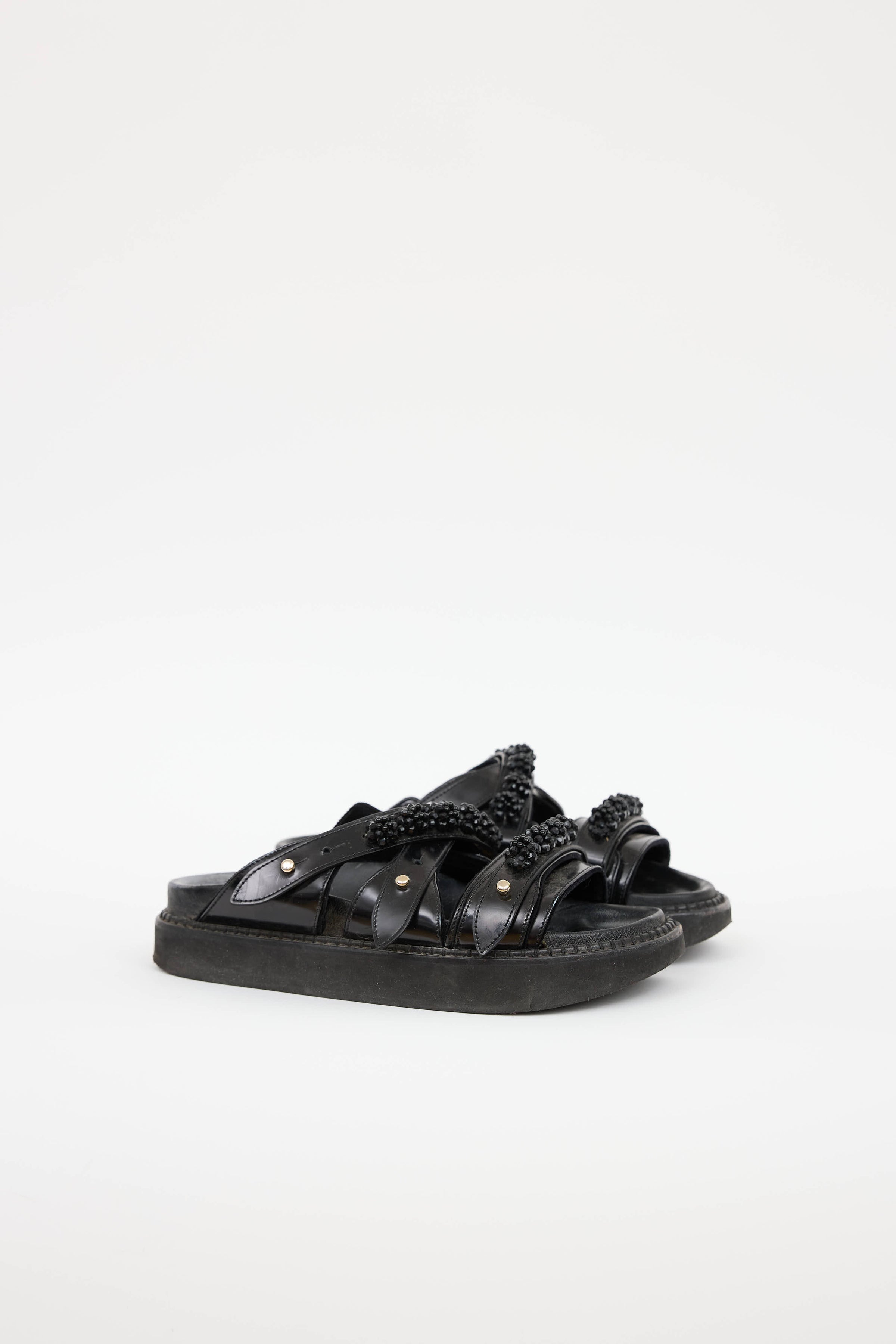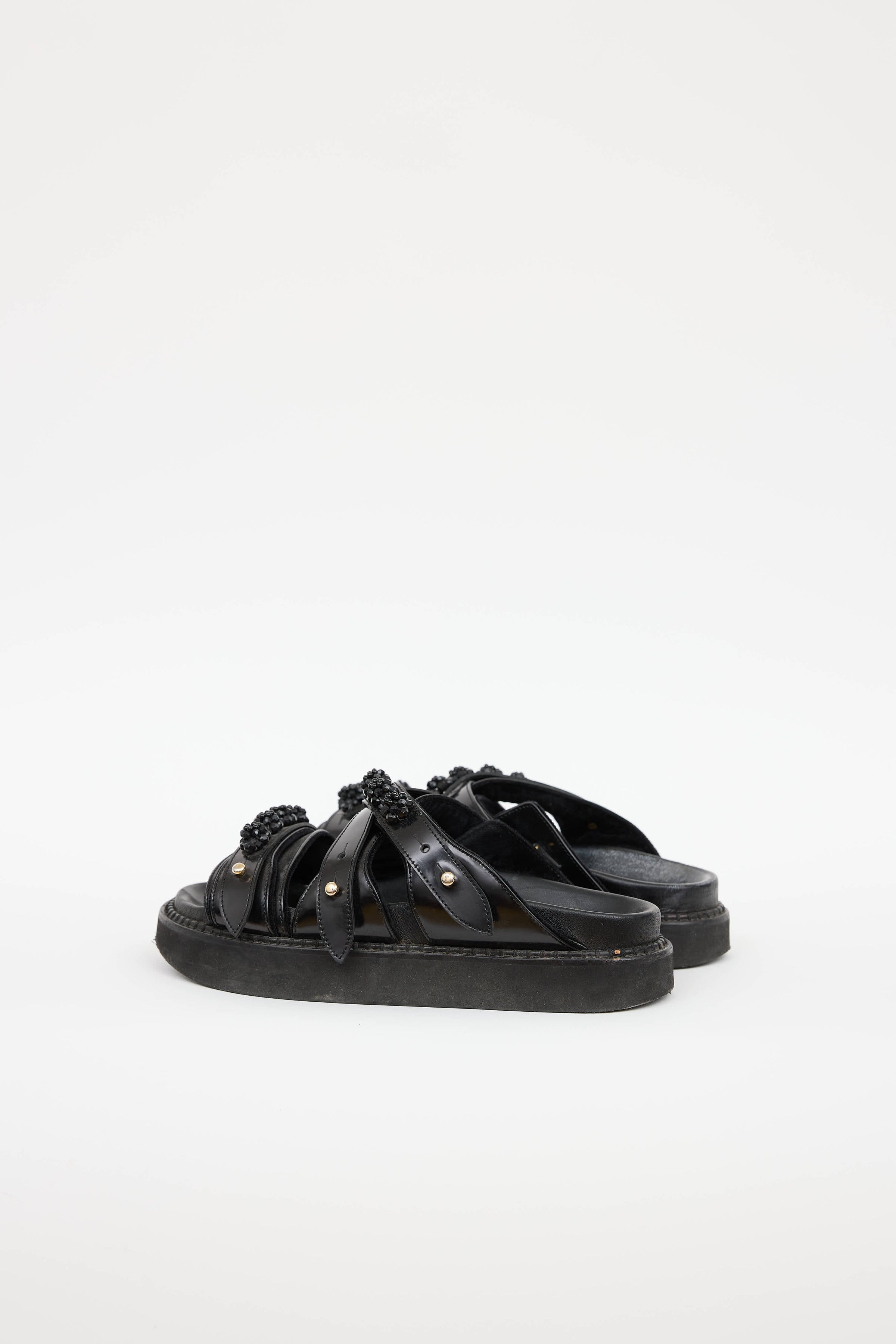 Pre-owned Simone Rocha black slides featuring round open toe, adjustable push pin patent straps at vamp, bead embellishments, and platform midsole.