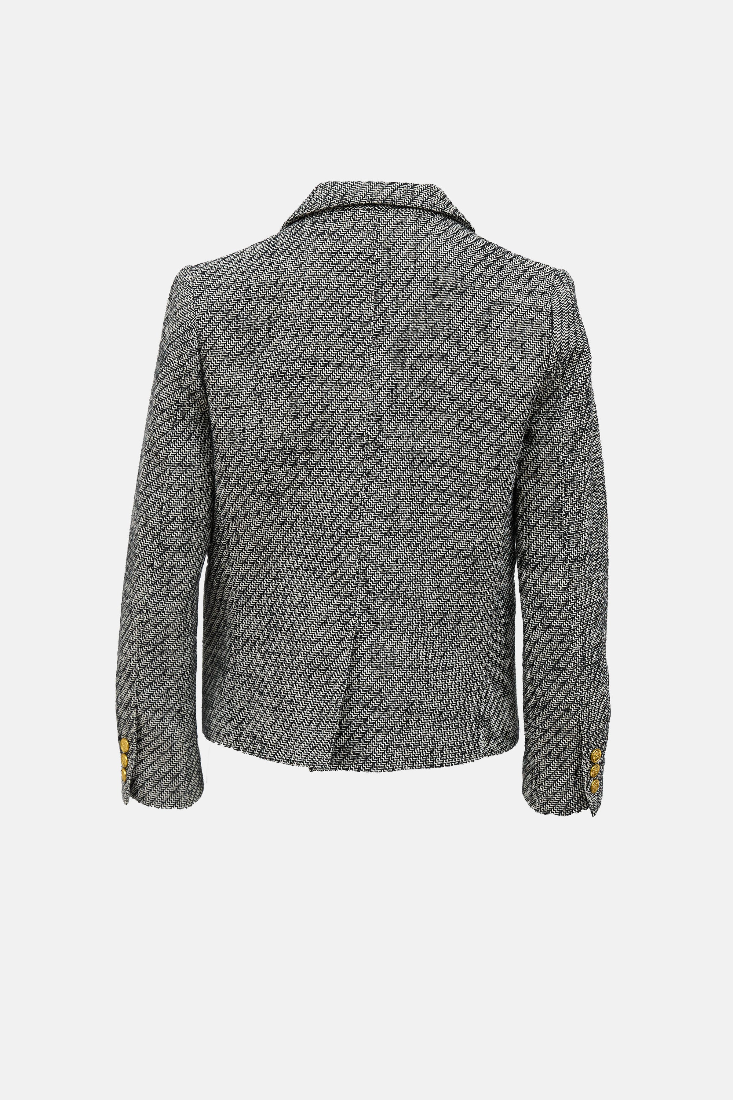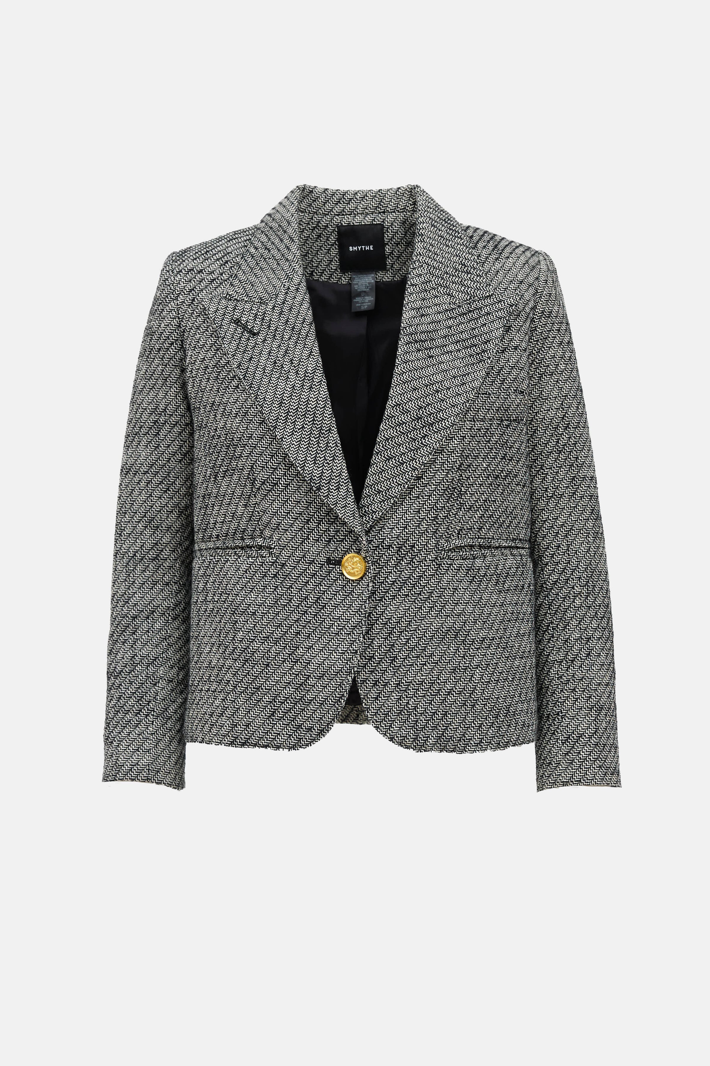 Pre-owned Smythe cotton black and white woven blazer featuring peak lapel collar, singular gold tone button front, welt pocket at chest, buttoned cuffs, and slit at back hem. Lined.