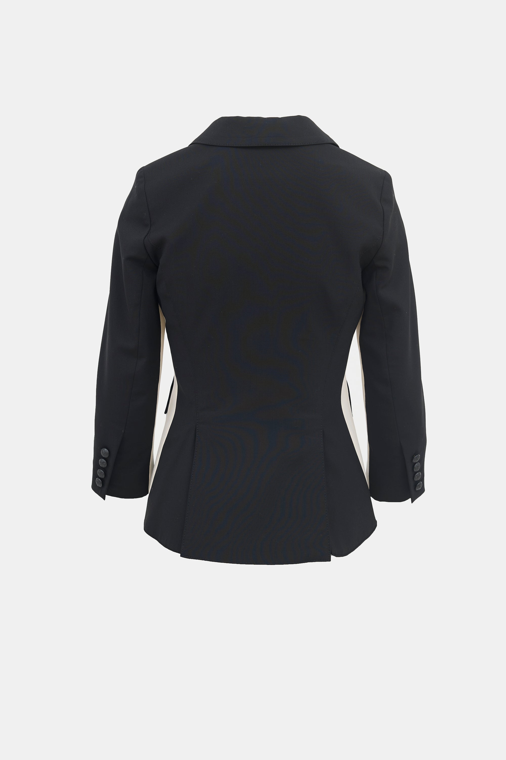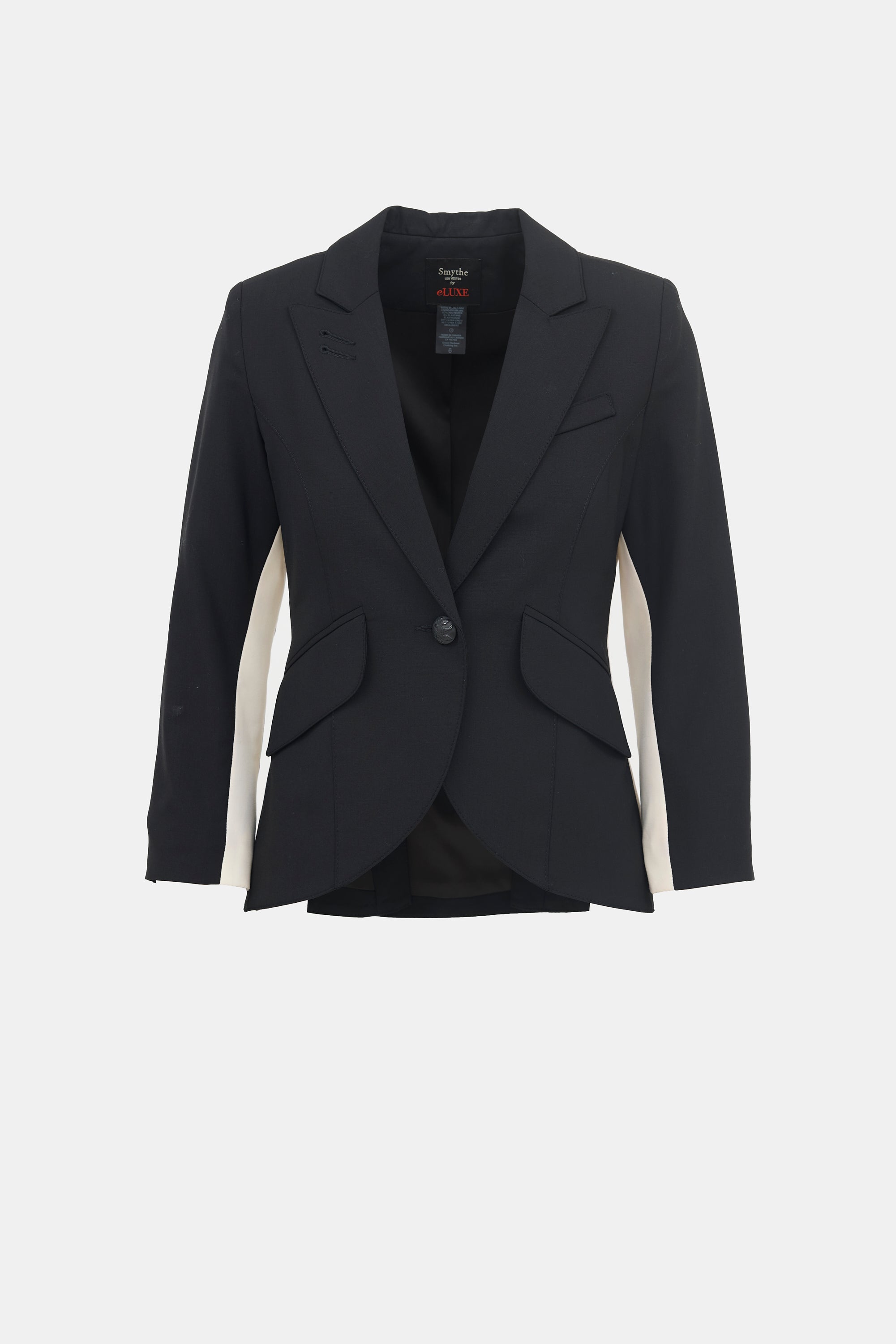 Pre-owned Smythe x Eluxe black One Button blazer featuring a peak lapel, single button closure, tonal embellished buttons, one welt pocket at chest, two flap pockets at hip, dual vented back, white paneled underarms, and buttoned cuffs. Lined.