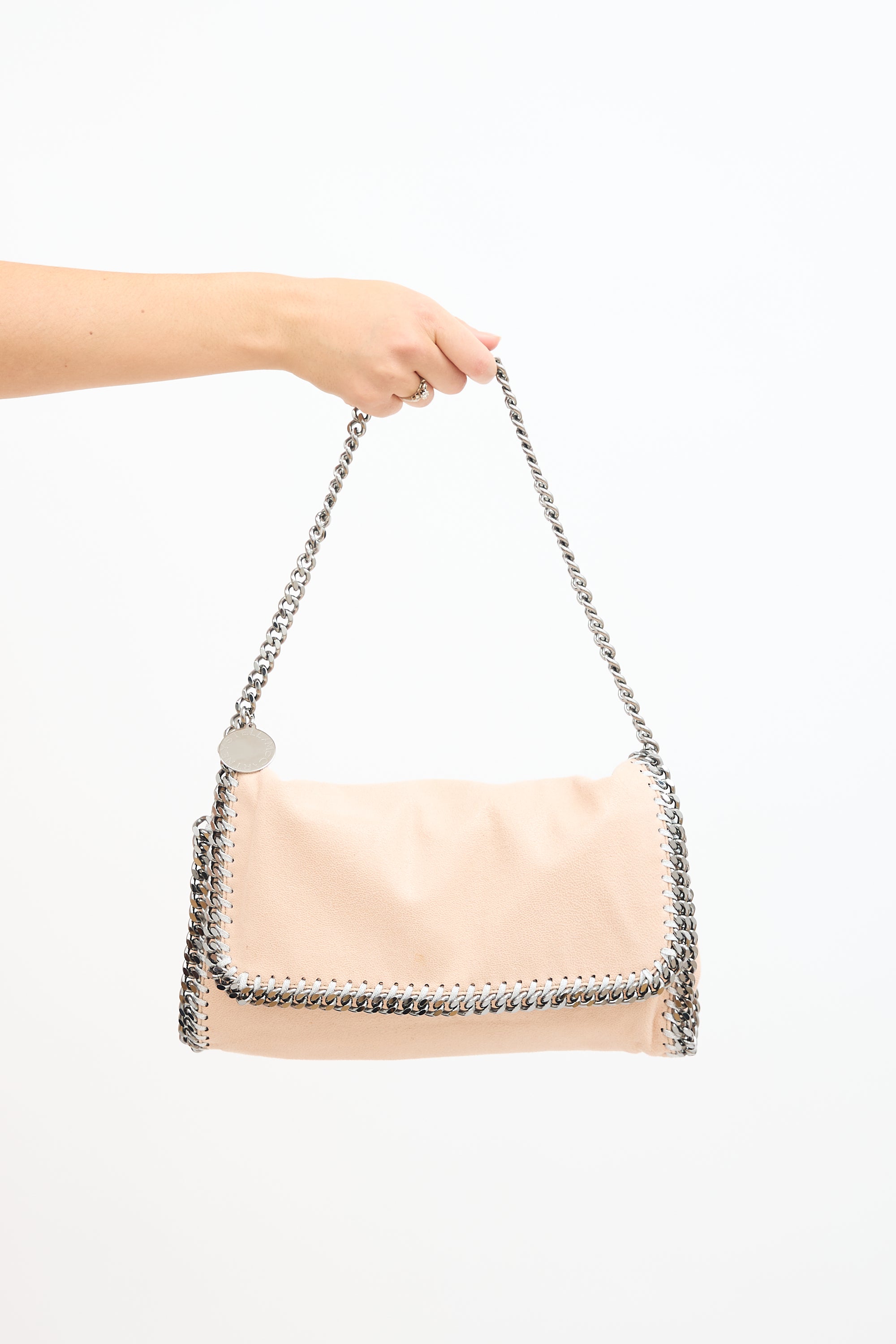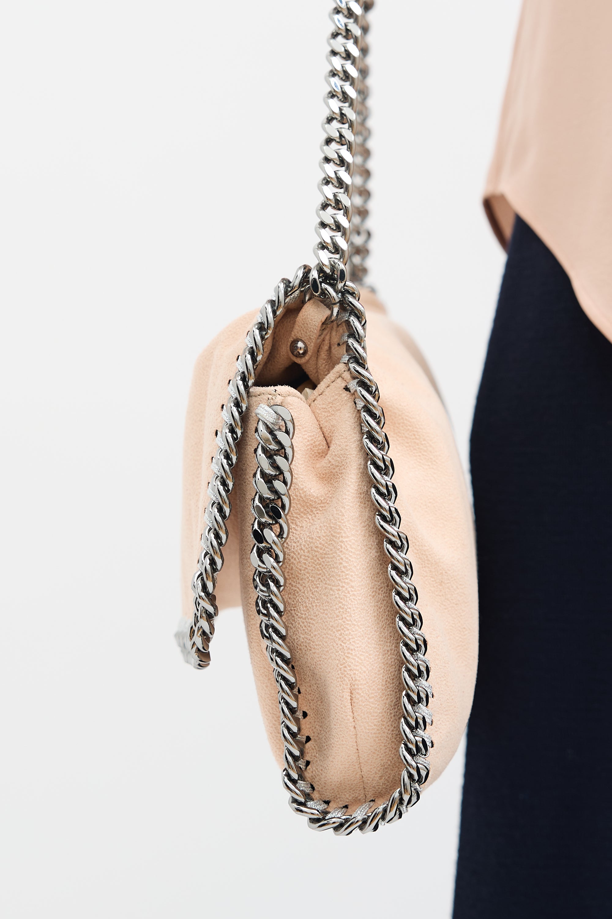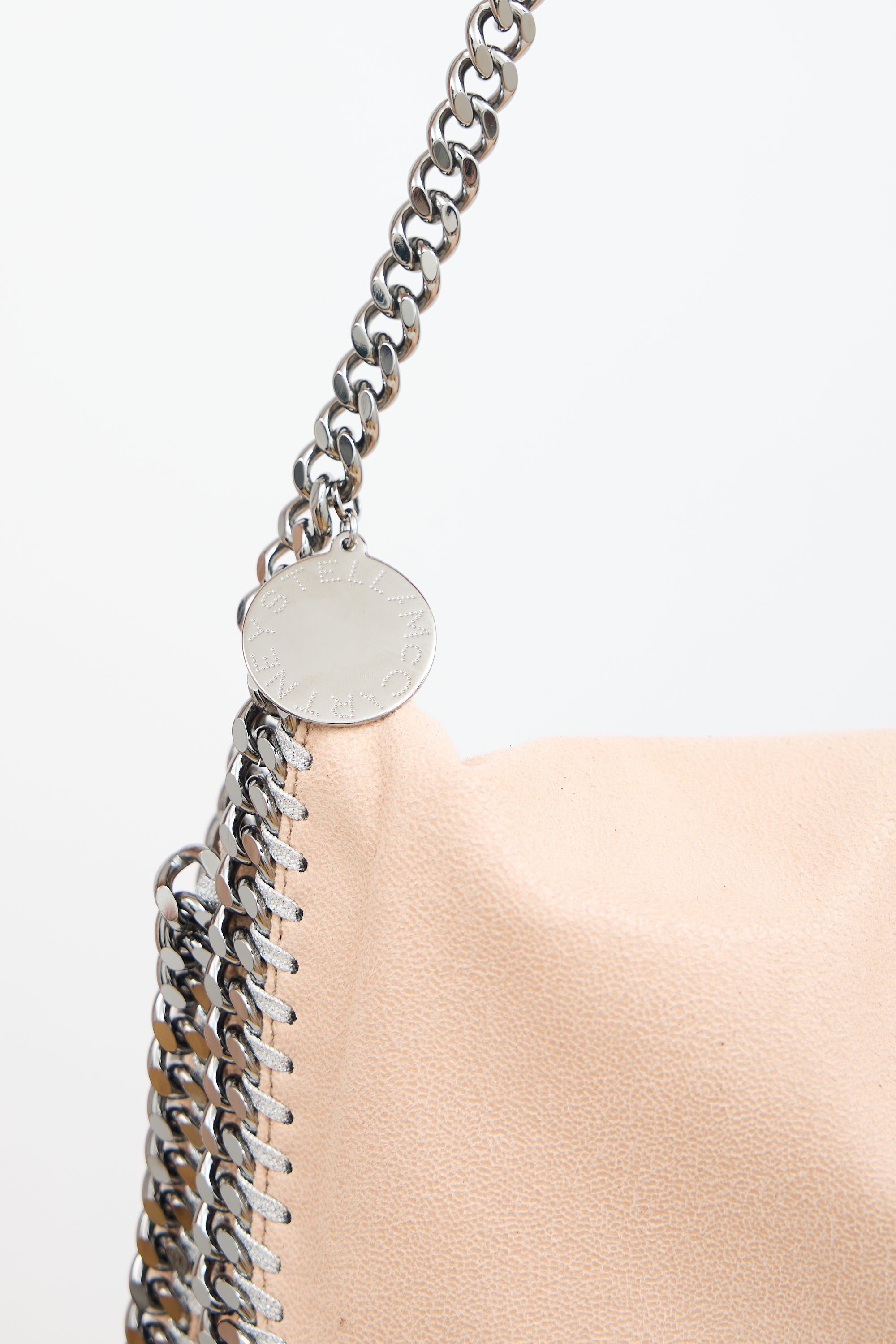 Pre-owned Stella McCartney beige Falabella Flap shoulder bag featuring gunmetal tone and metallic silver braided chain trim, shoulder chain link shoulder strap with engraved logo charm, one main compartment with one slip pocket, and magnetic snap closure. Comes with original dust bag.