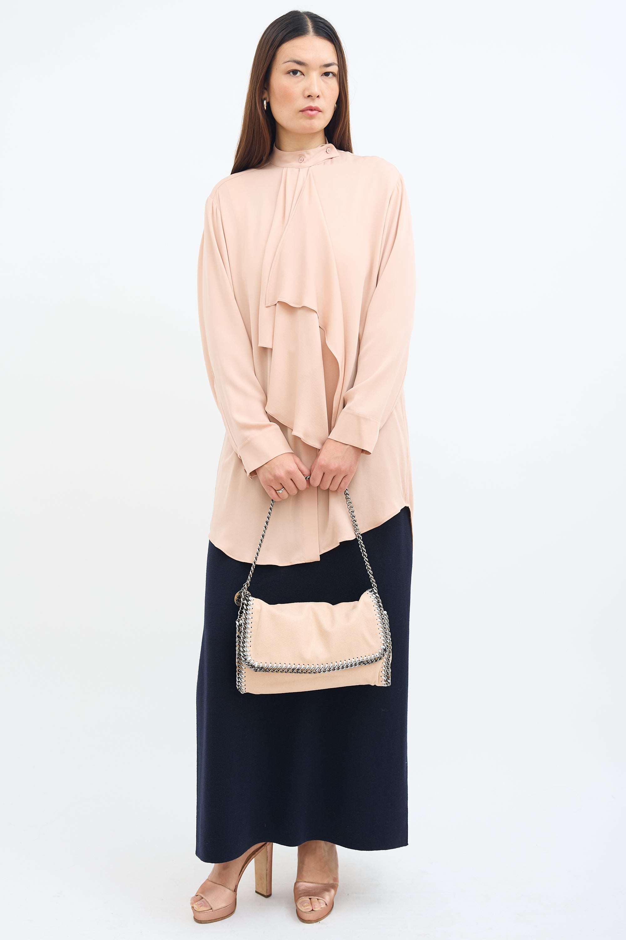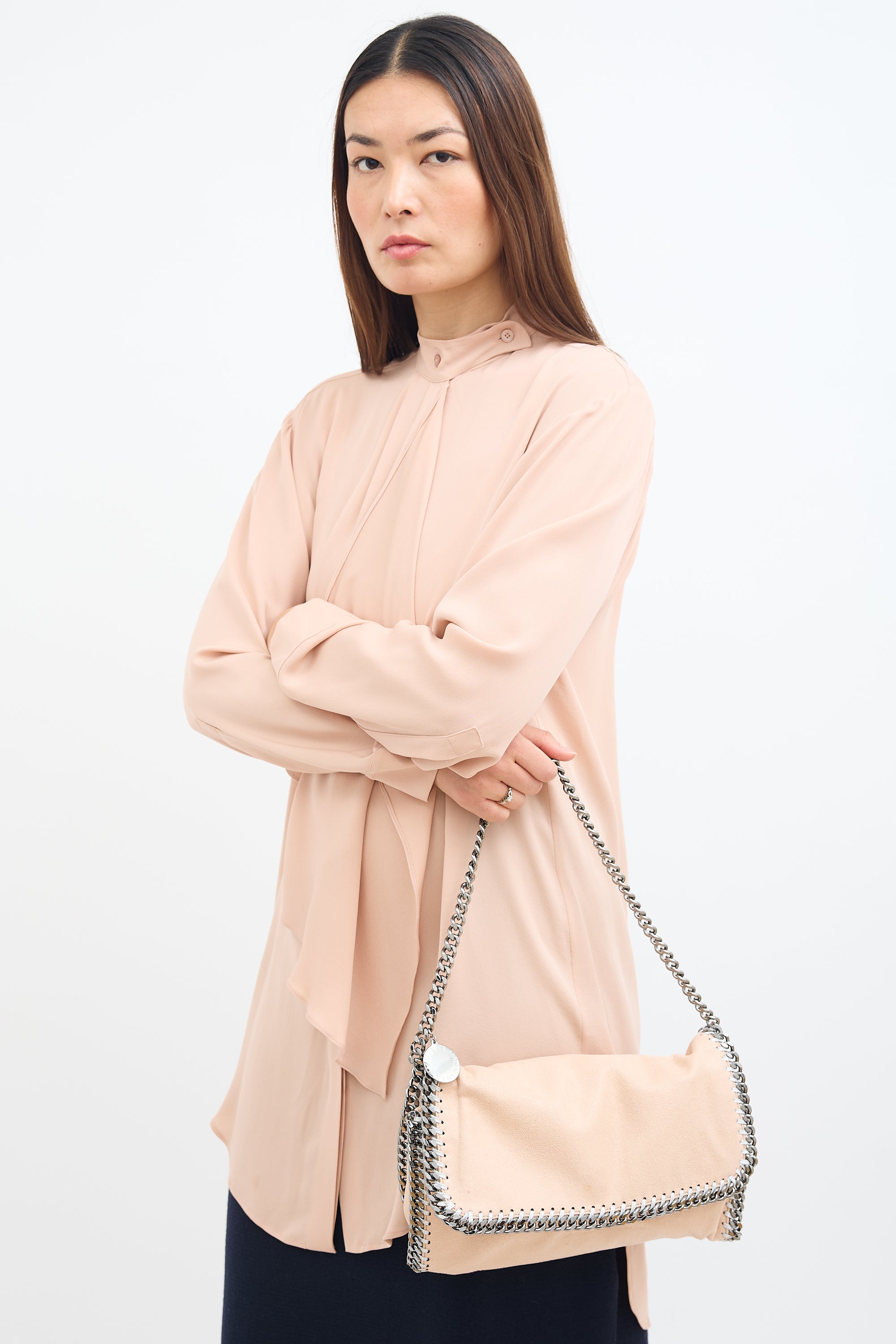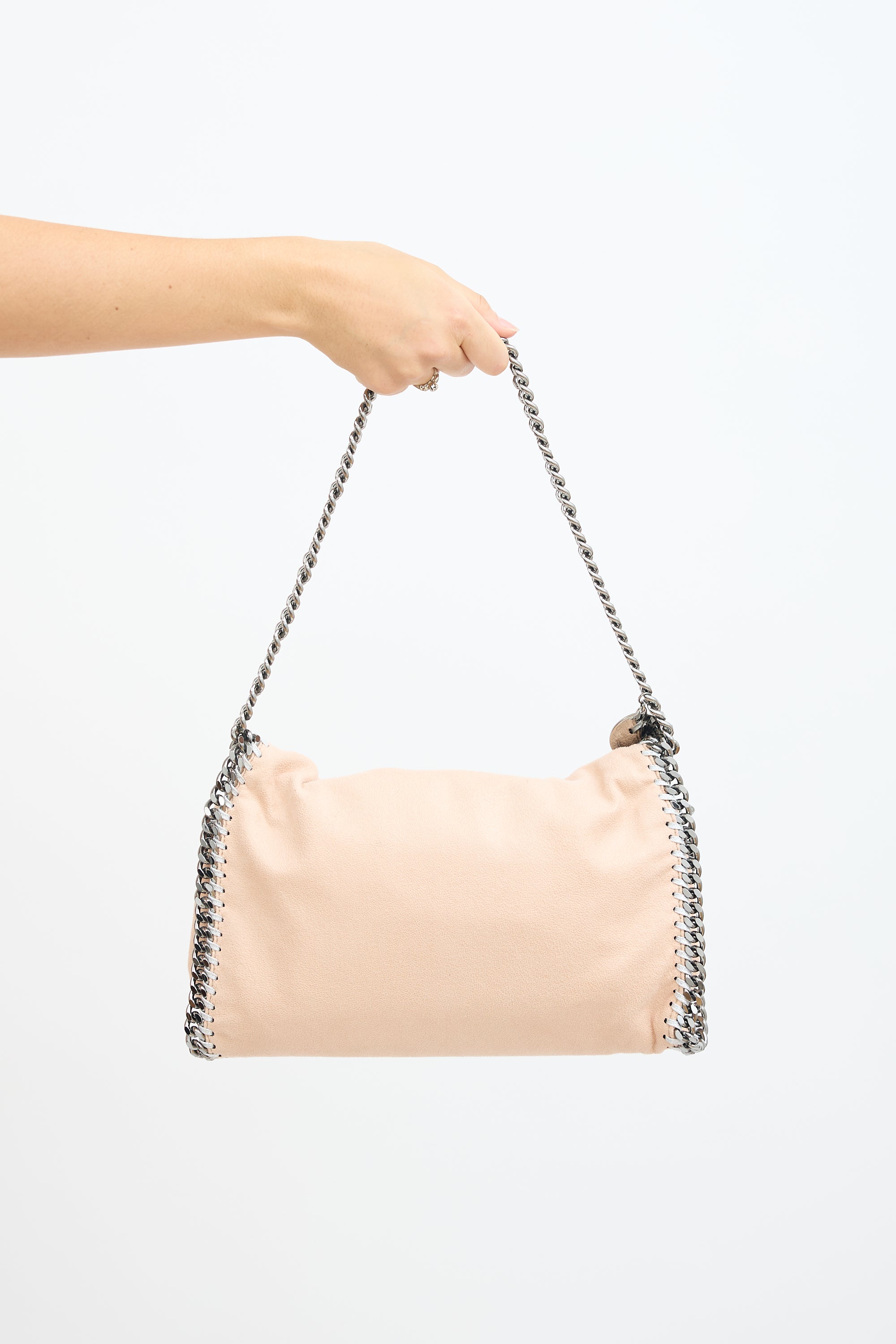 Pre-owned Stella McCartney beige Falabella Flap shoulder bag featuring gunmetal tone and metallic silver braided chain trim, shoulder chain link shoulder strap with engraved logo charm, one main compartment with one slip pocket, and magnetic snap closure. Comes with original dust bag.