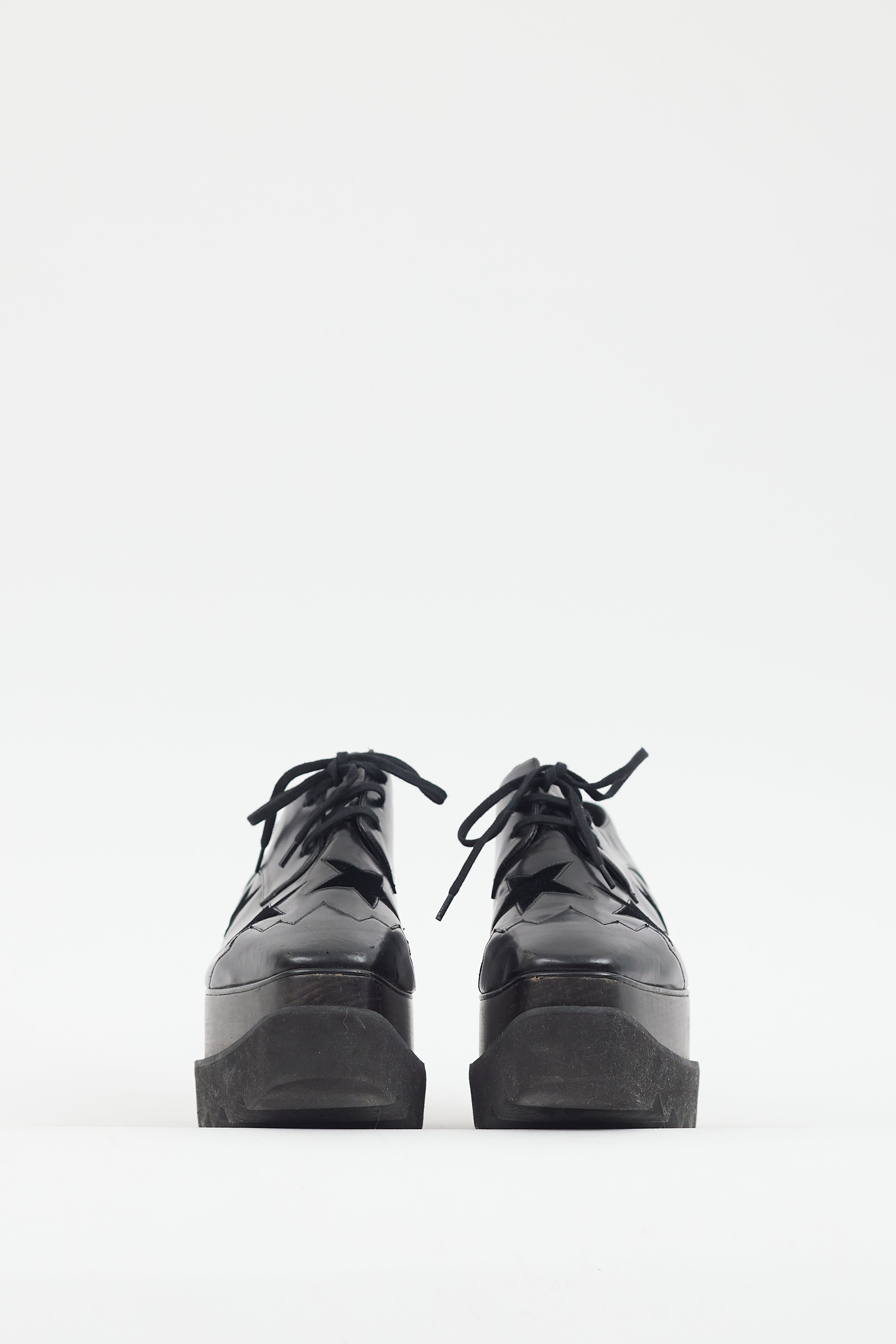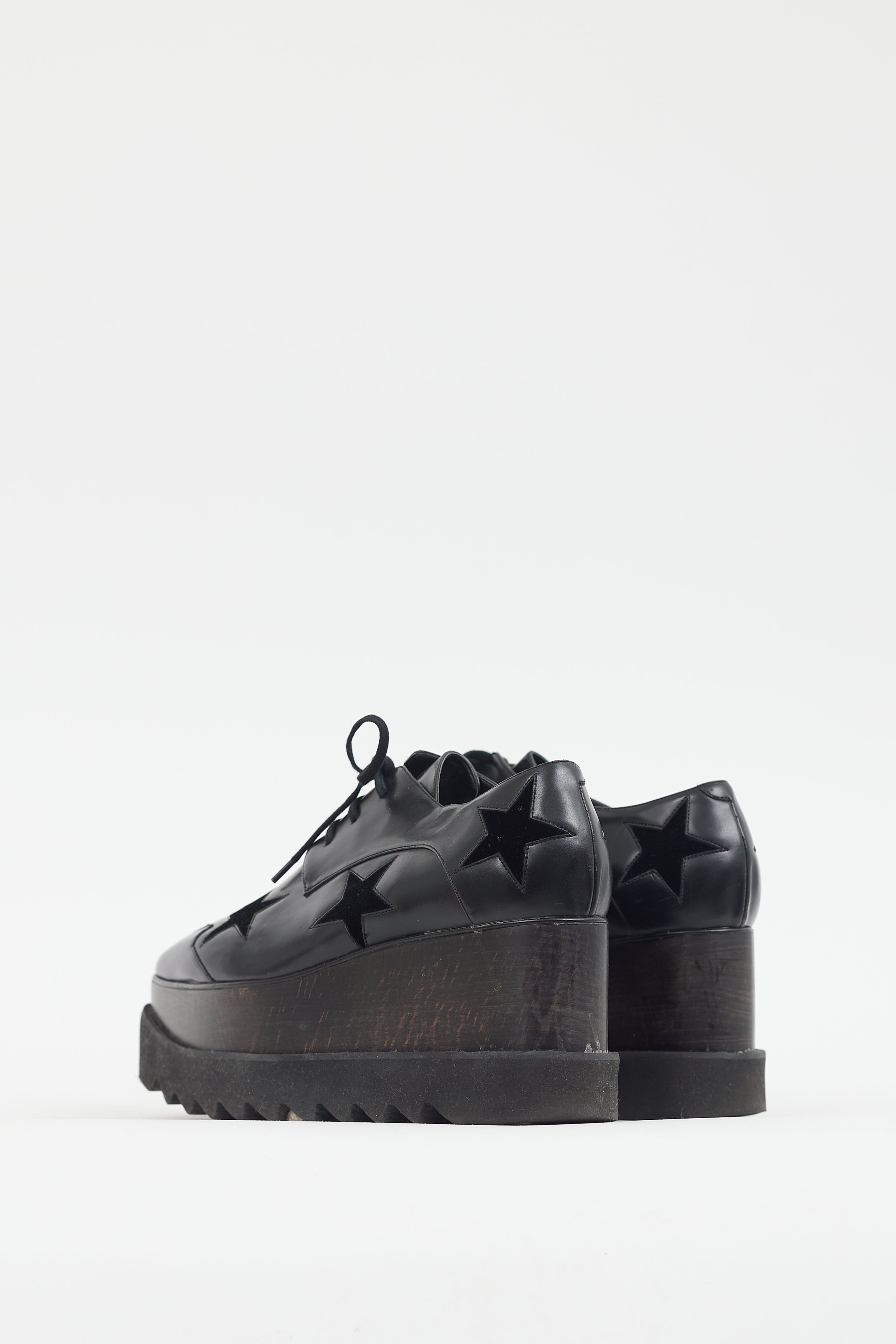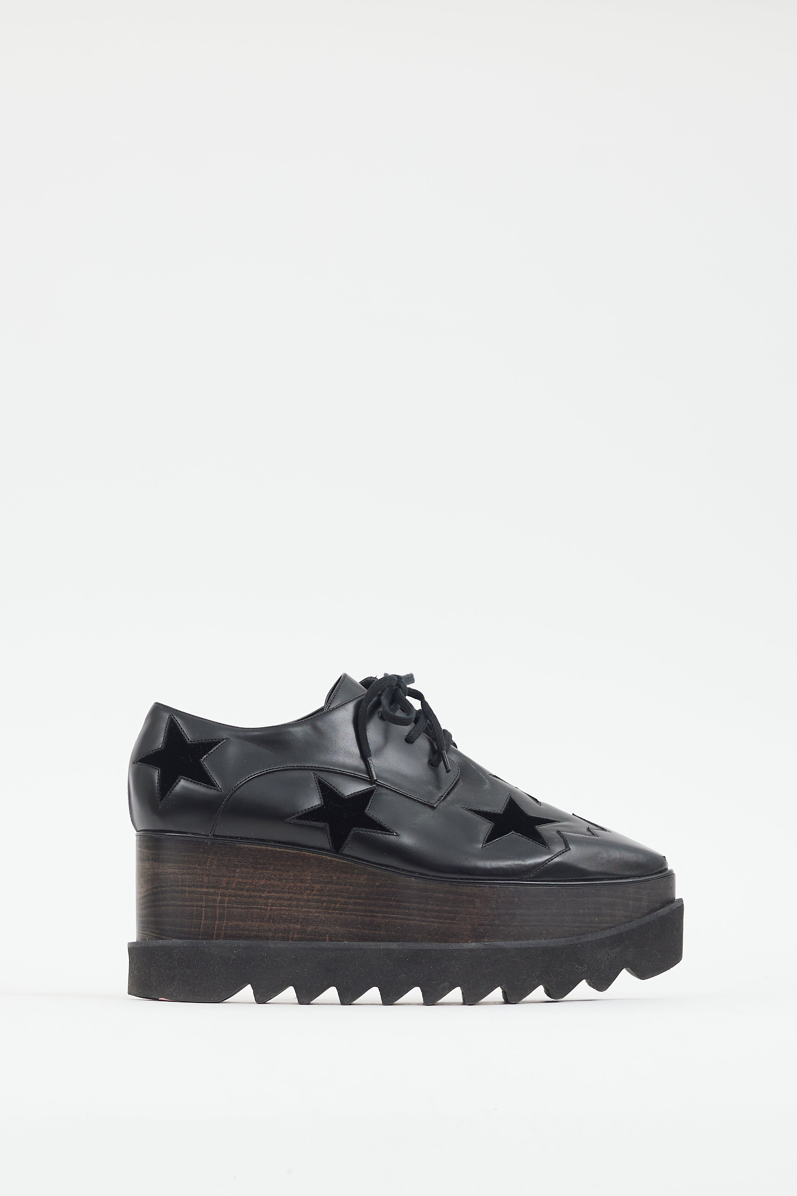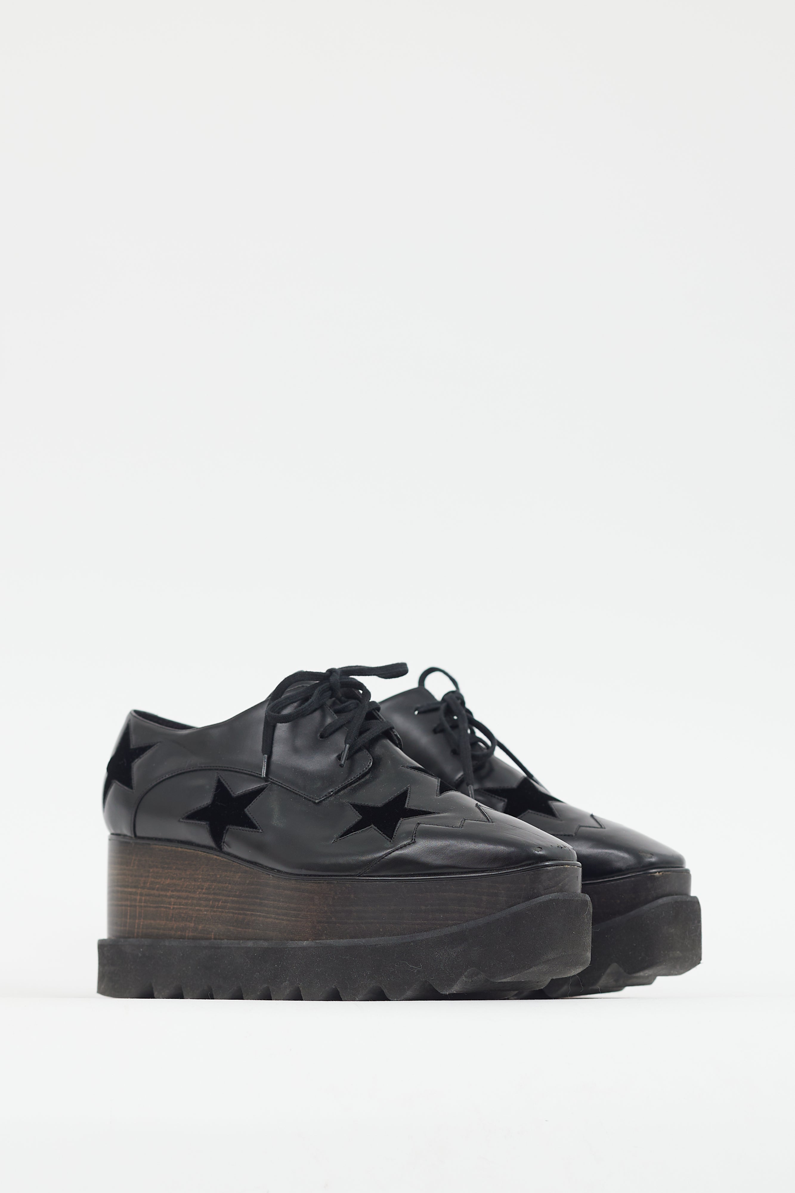 Pre-owned Stella McCartney black leather and suede oxfords featuring square toe, tonal suede star pattern at upper, platform midsole, lace up front, and leather insoles. Comes with original dust bag.