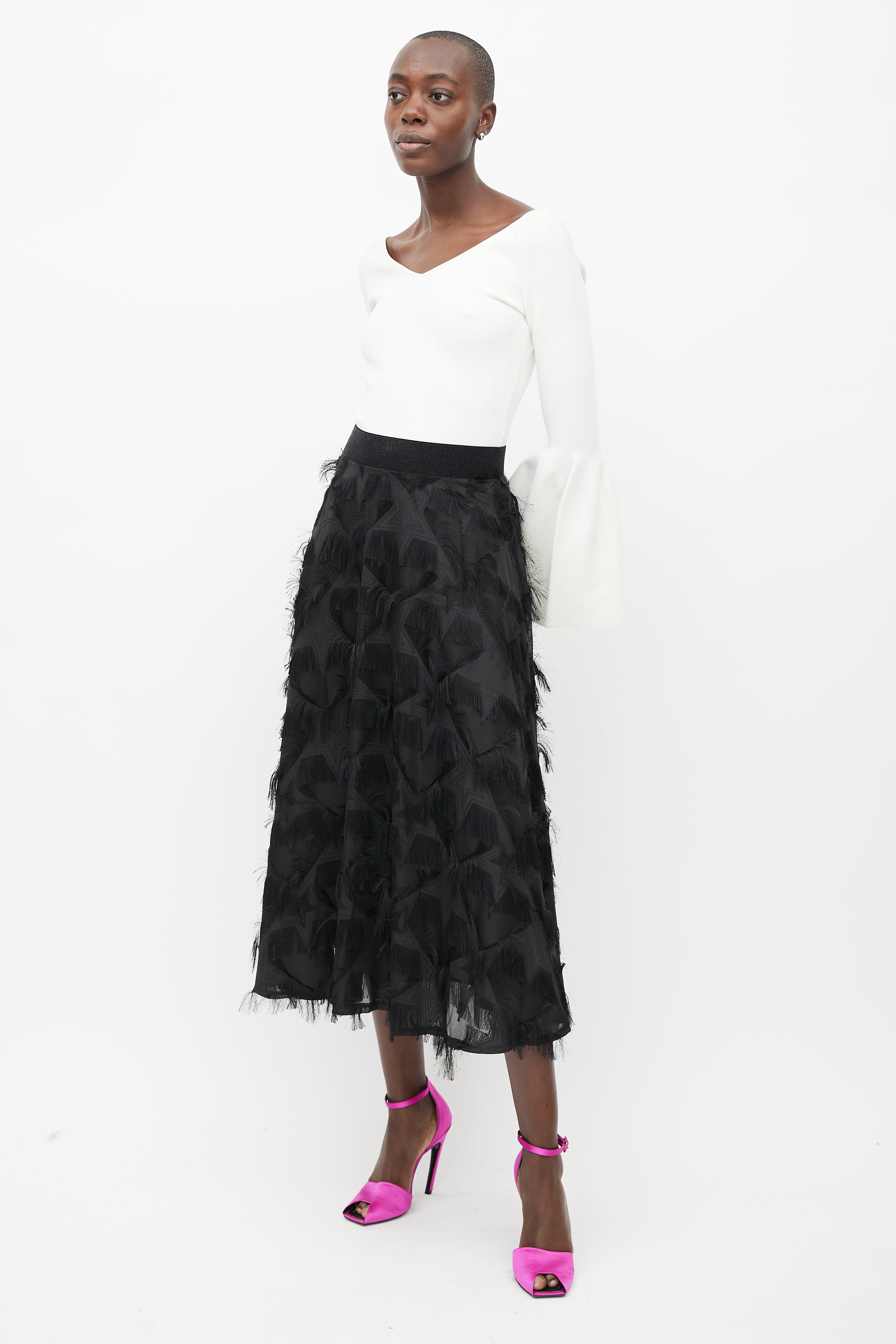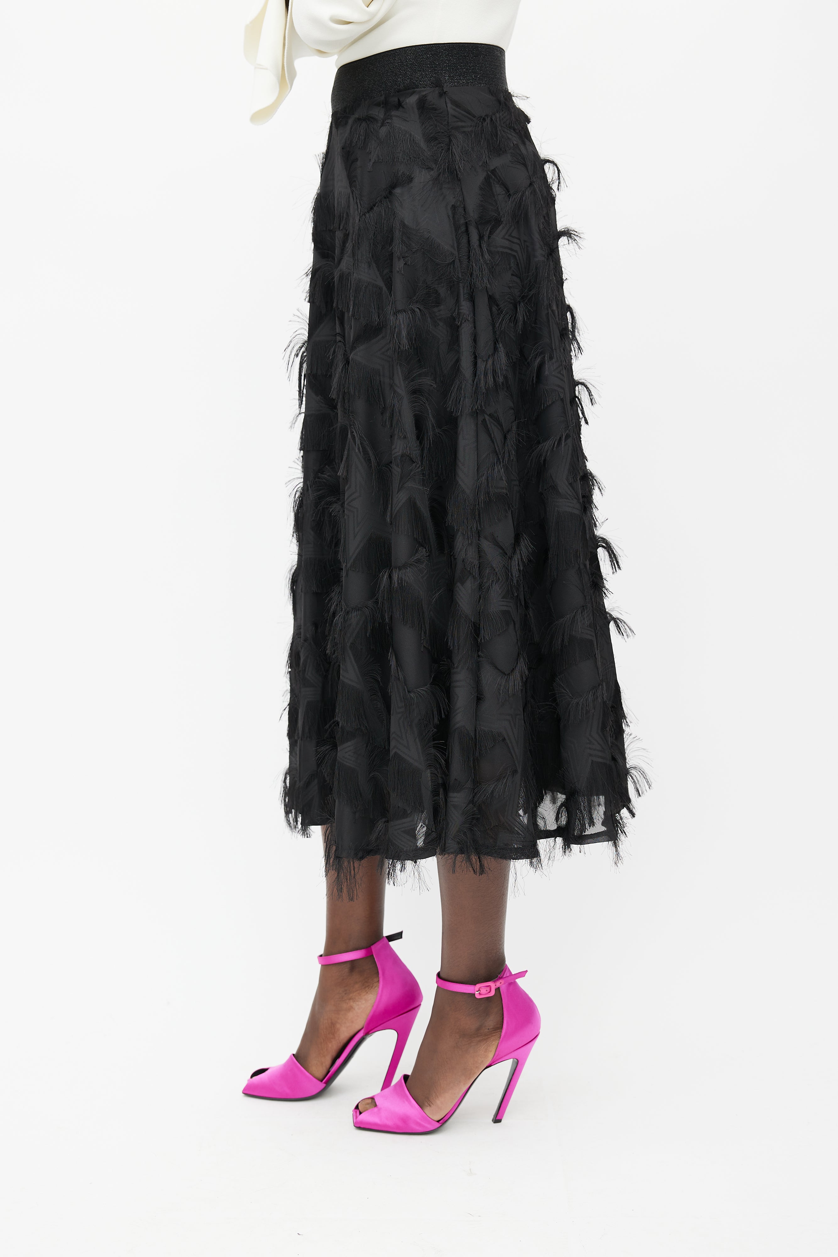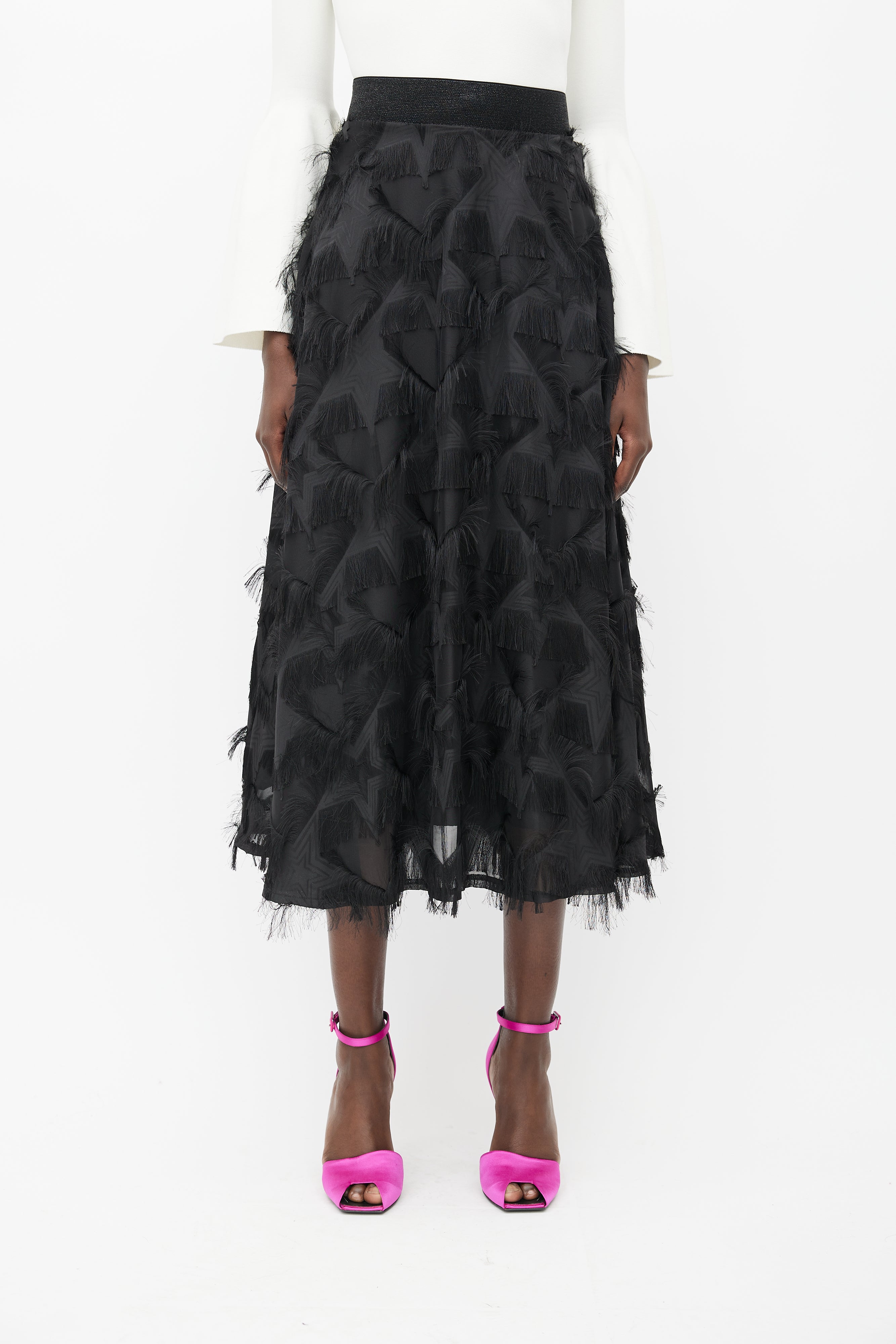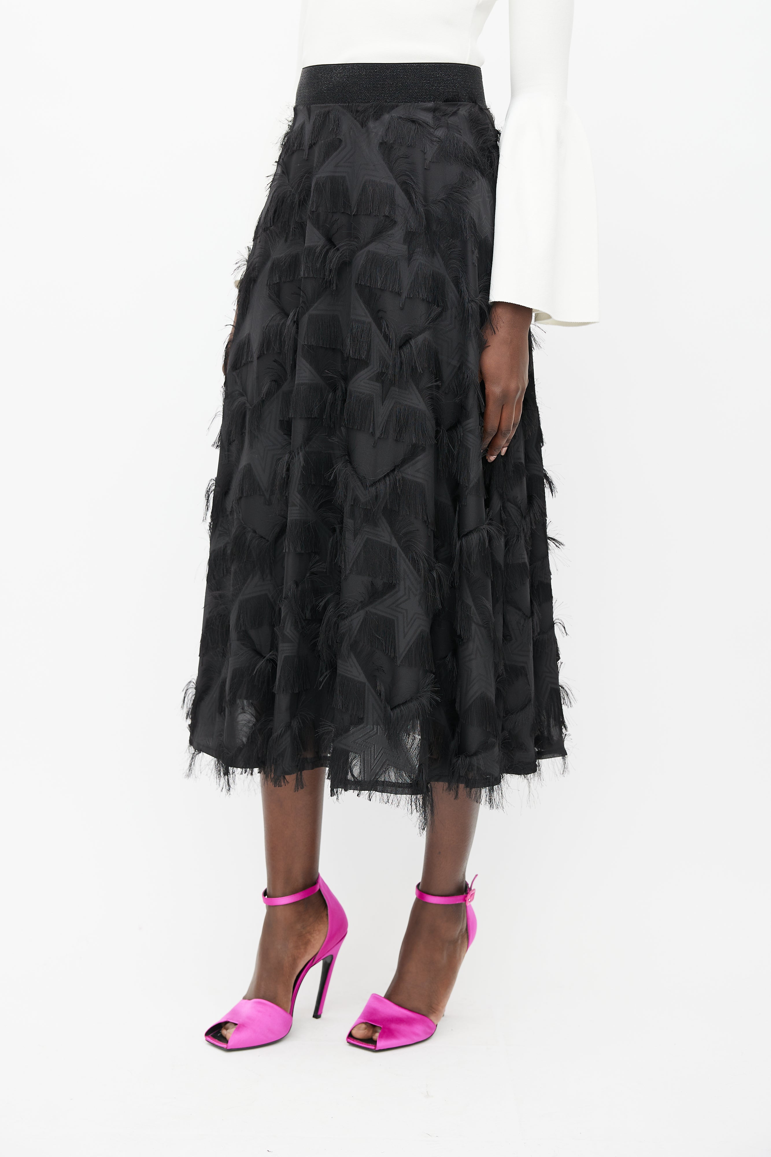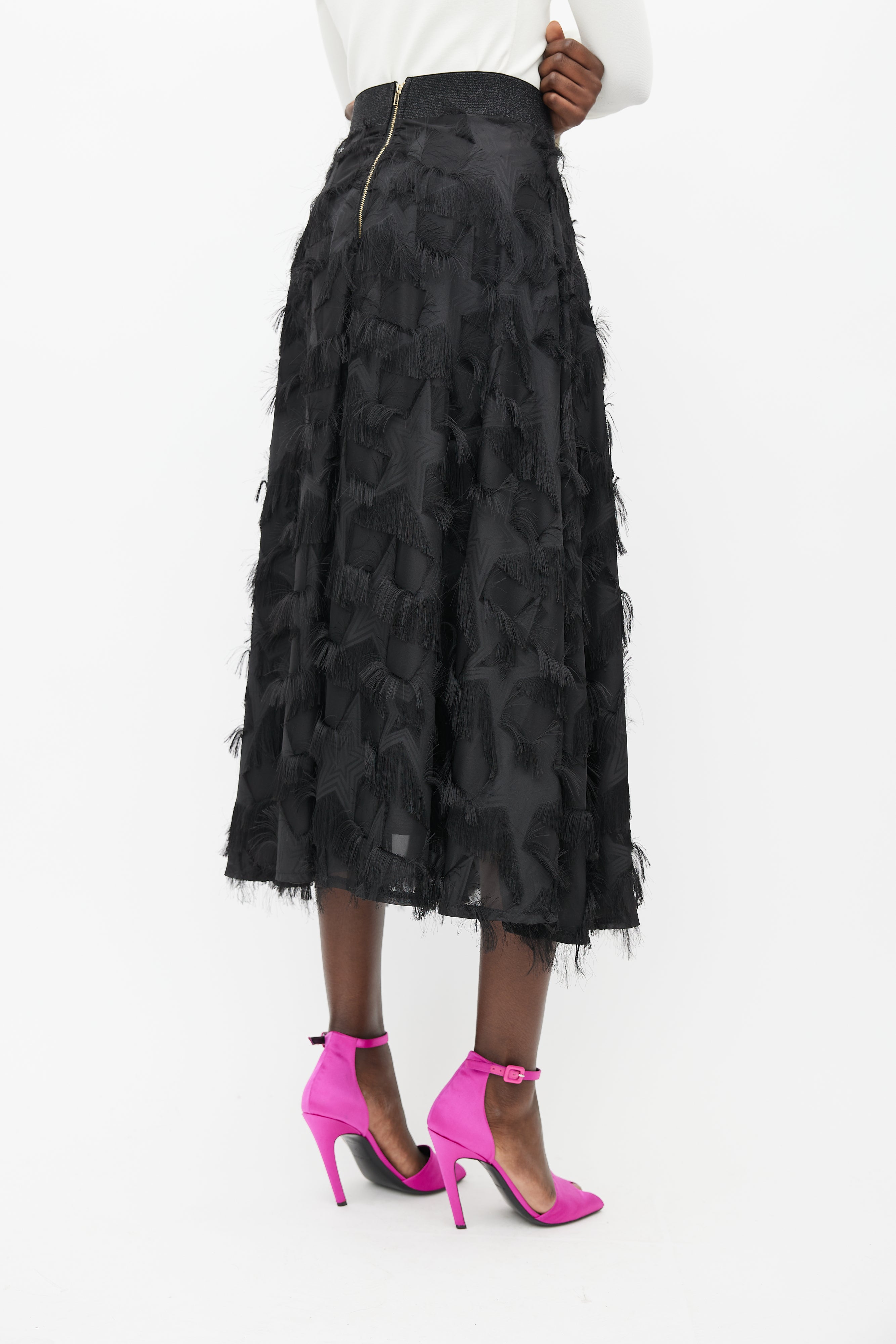 Pre-owned Stella McCartney black skirt featuring an elasticized waist, tonal star pattern throughout, fringe trim, and gold tone zip closure at back. Lined.