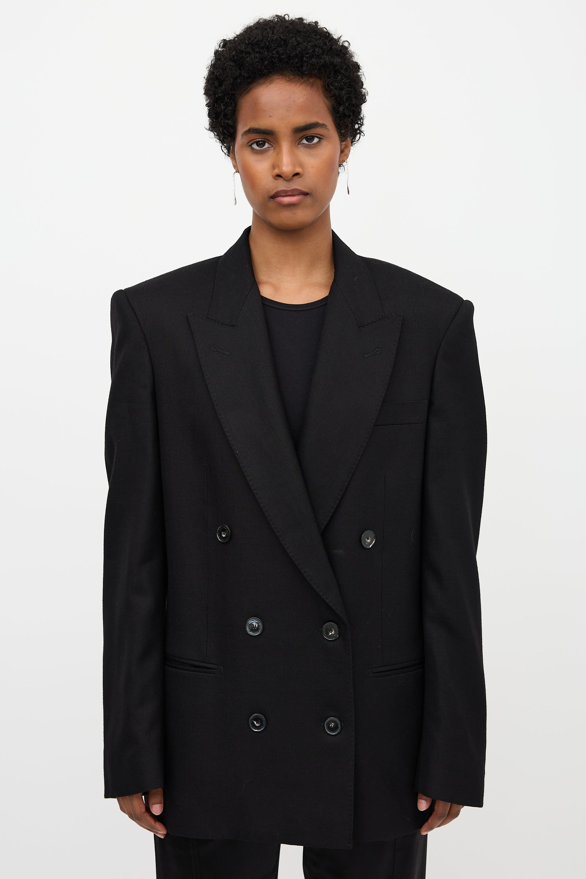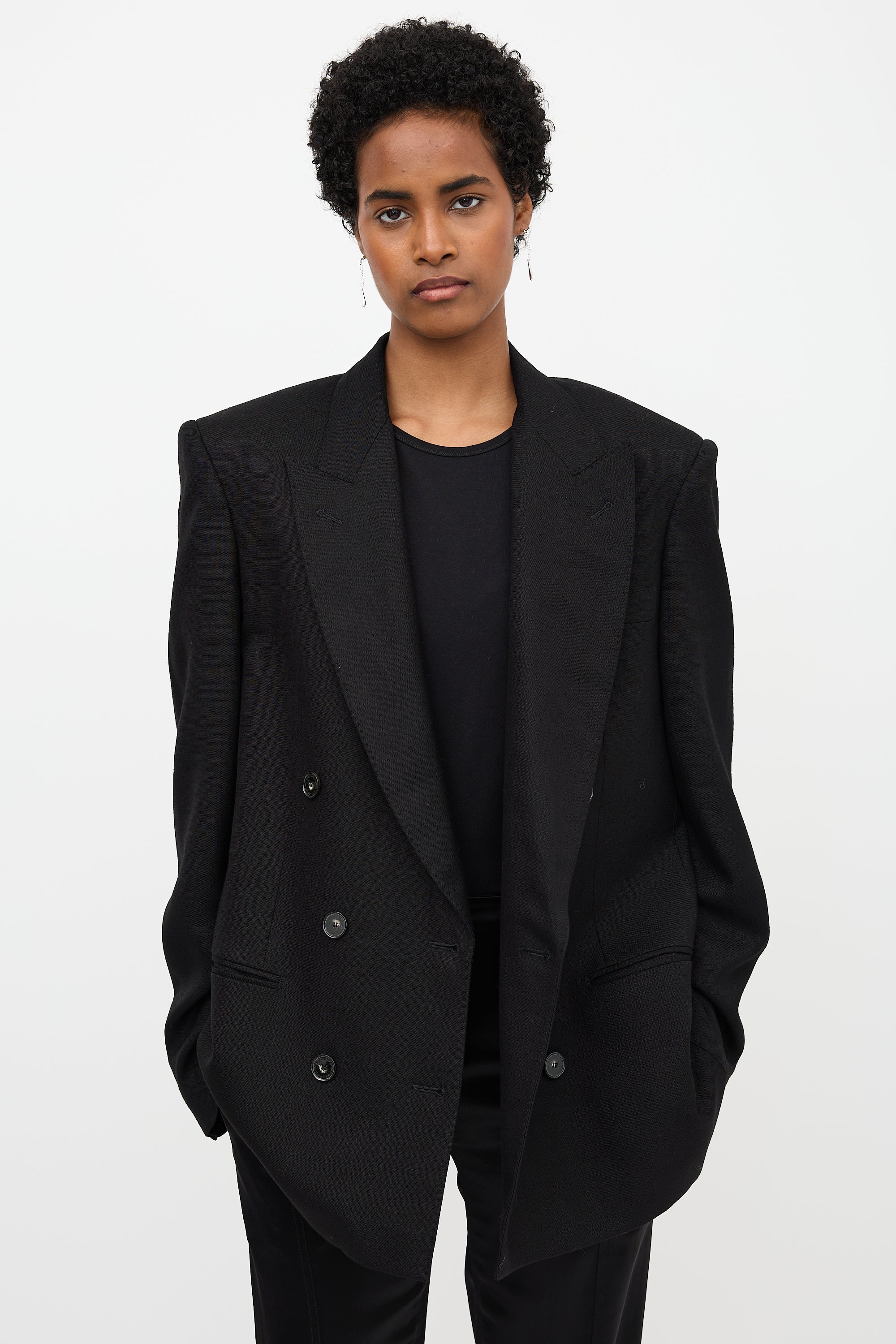 Pre-owned Stella McCartney black blazer featuring a peak lapel, double breasted button up front, three welt pockets at front, padded shoulders, double vented back, and buttoned cuffs. Lined.