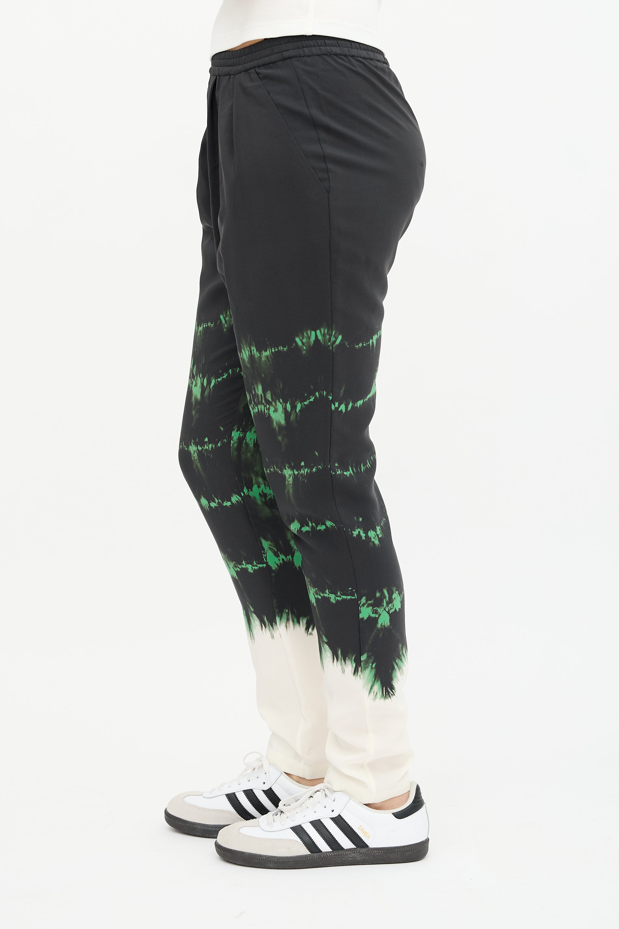 Pre-owned Stella McCartney black silk pants featuring green and white tie dye print, elasticized waistband, pleated front, two pocket styling, and straight leg.