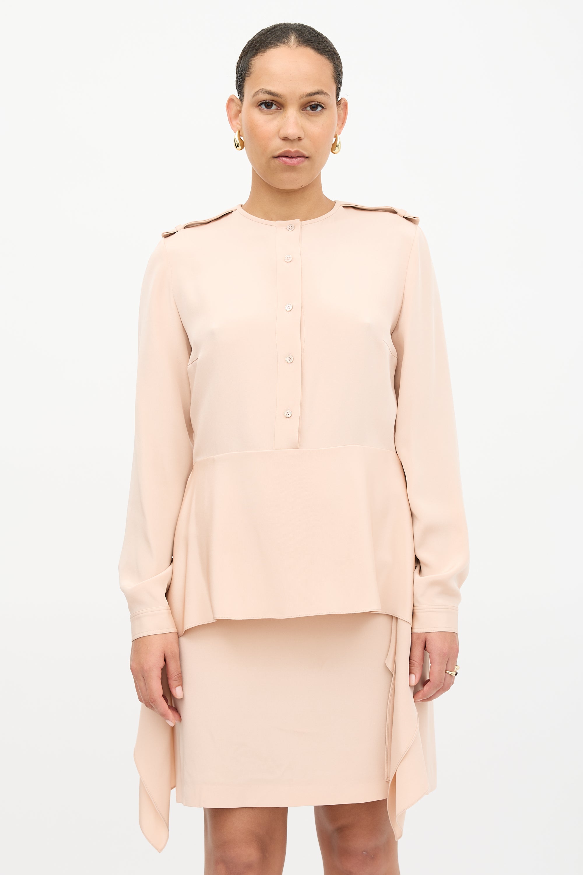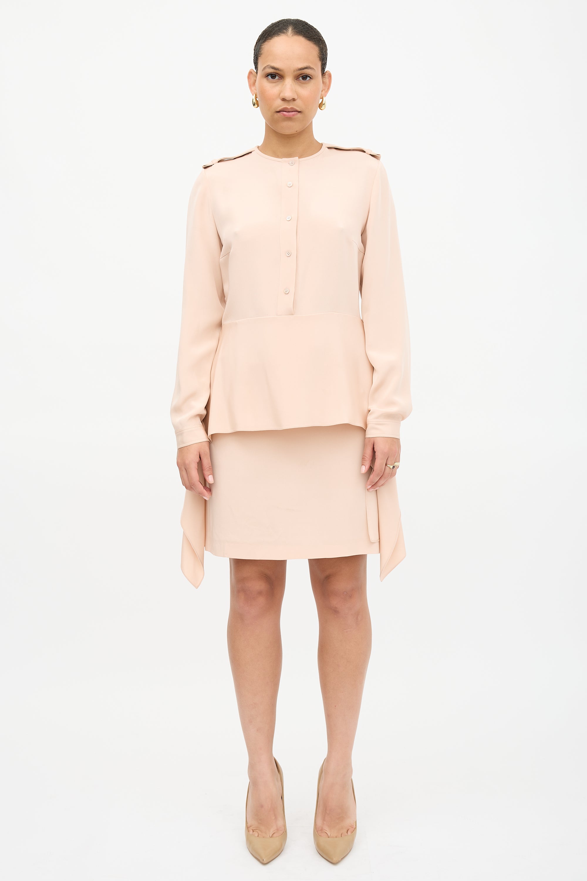 Stella McCartney pink silk dress featuring round neckline, epaulettes, button front, button cuffs, zip closure at side, and asymmetrical drape at waist.