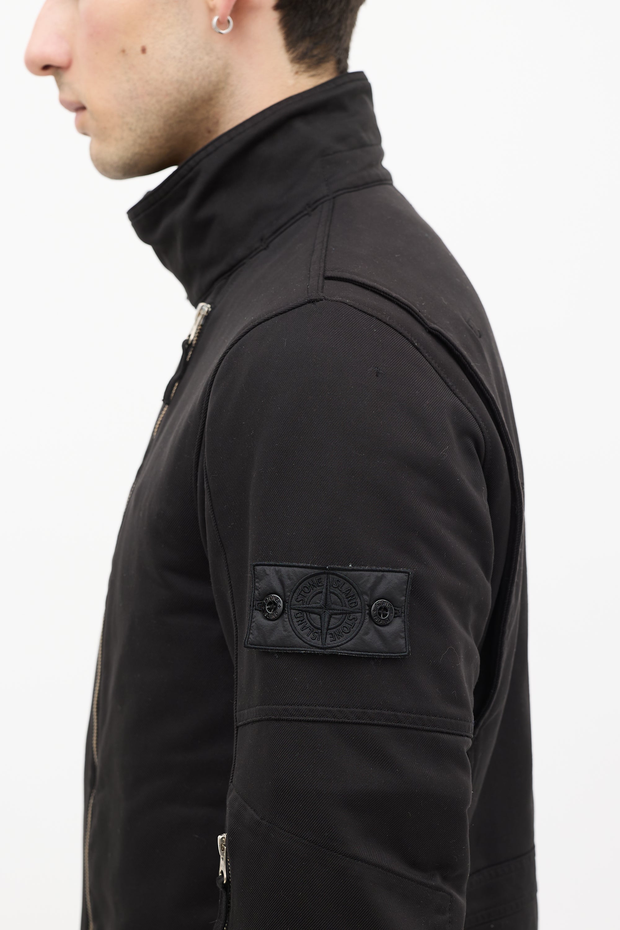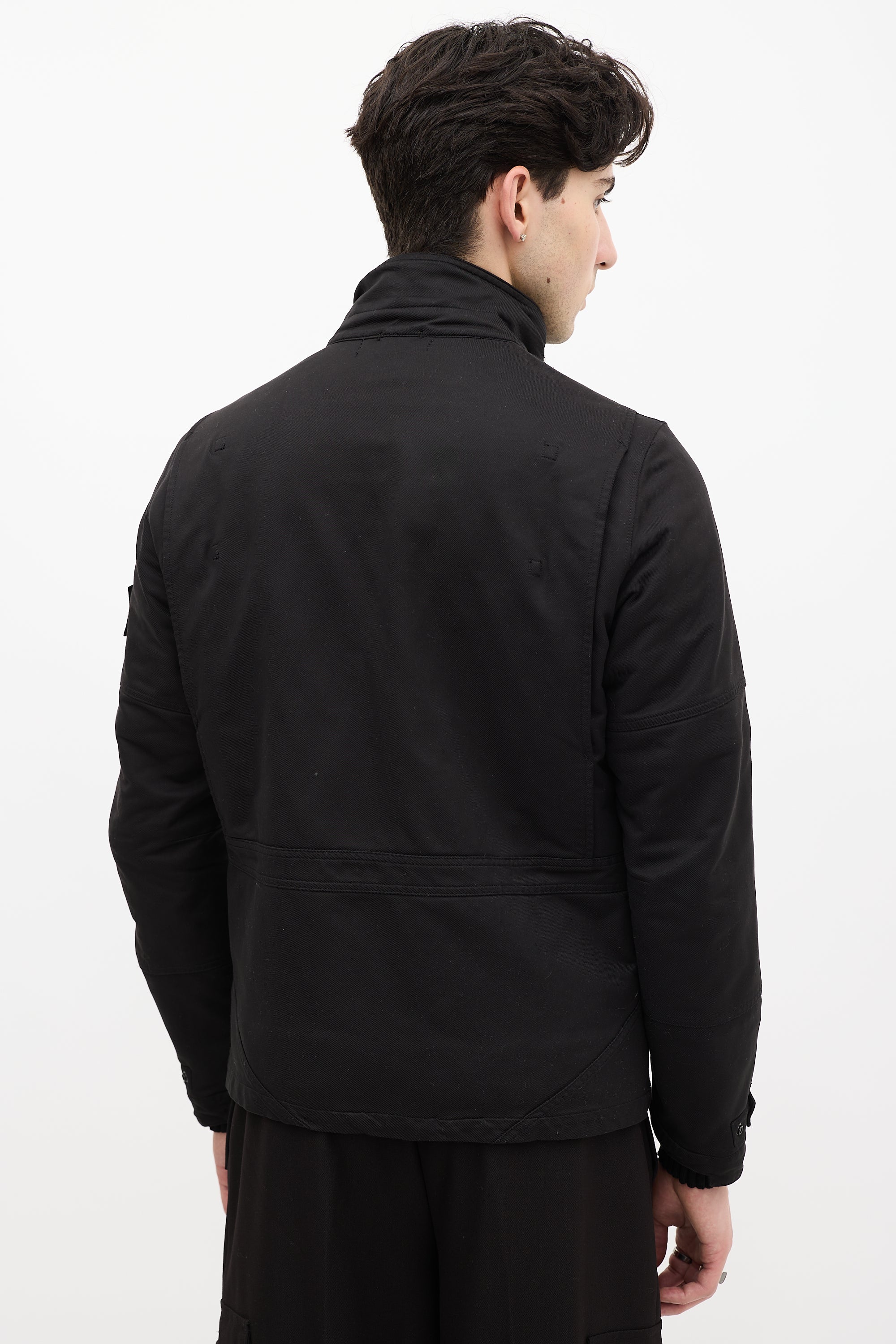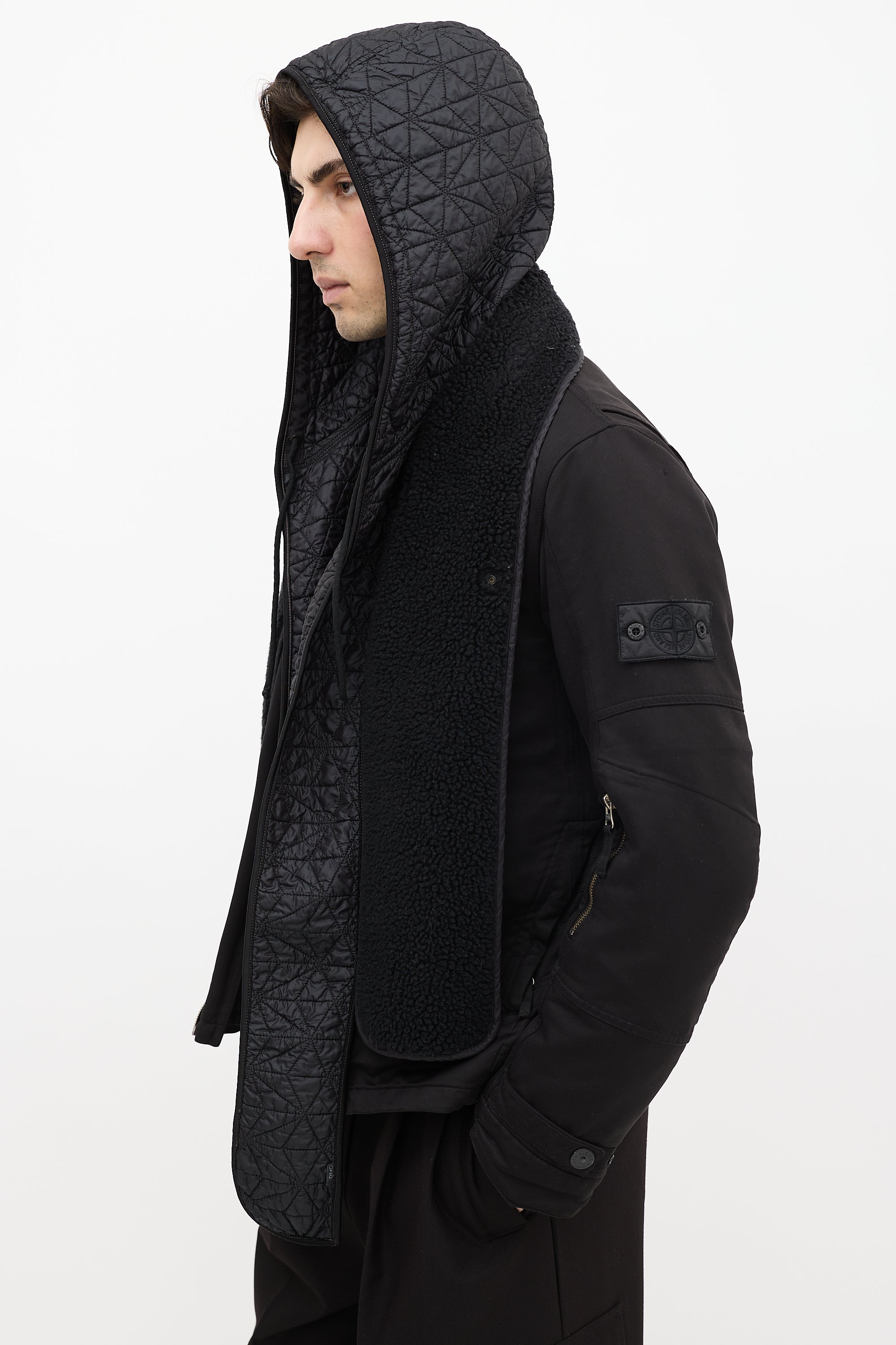Pre-owned Stone Island black canvas David-T jacket featuring gold tone hardware, stand collar with detachable quilted hood and fleece scarf, asymmetrical zip up front, zip pocket at right chest, long front compartment with three slip pockets at left chest, two zip pockets at waist, zip pocket and signature detachable embroidered logo patch at left arm, and long sleeves with snap buttoned cuffs. Lined. Comes with original garment bag.