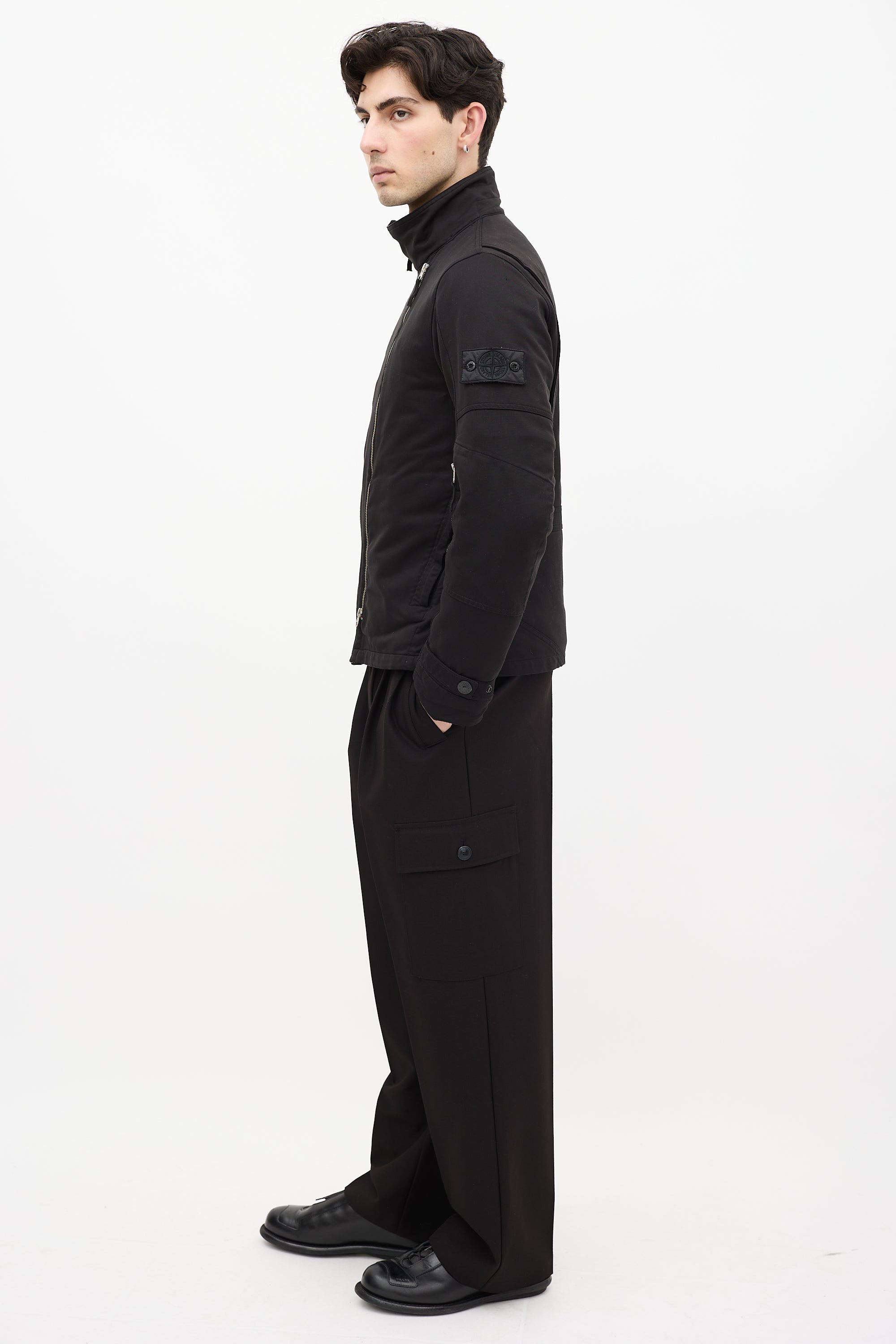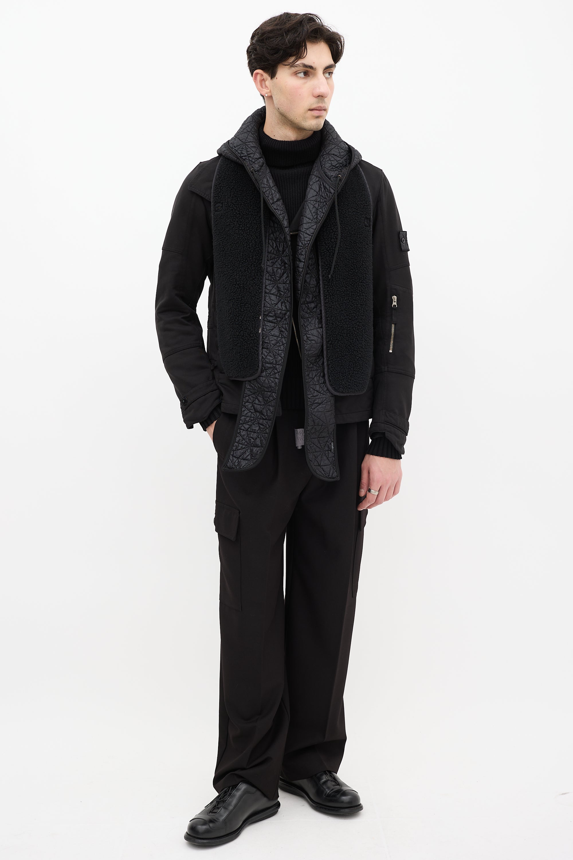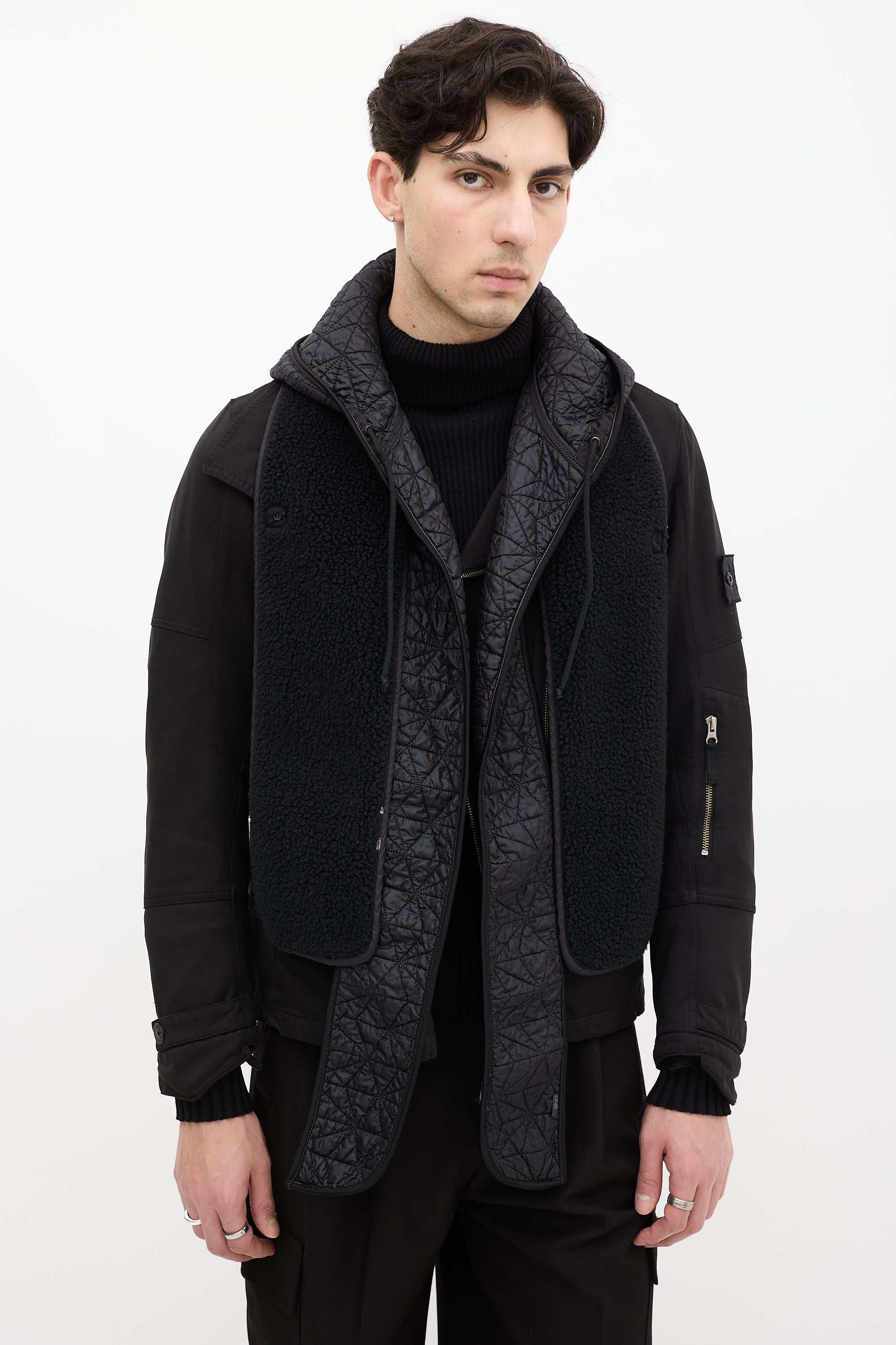 Pre-owned Stone Island black canvas David-T jacket featuring gold tone hardware, stand collar with detachable quilted hood and fleece scarf, asymmetrical zip up front, zip pocket at right chest, long front compartment with three slip pockets at left chest, two zip pockets at waist, zip pocket and signature detachable embroidered logo patch at left arm, and long sleeves with snap buttoned cuffs. Lined. Comes with original garment bag.