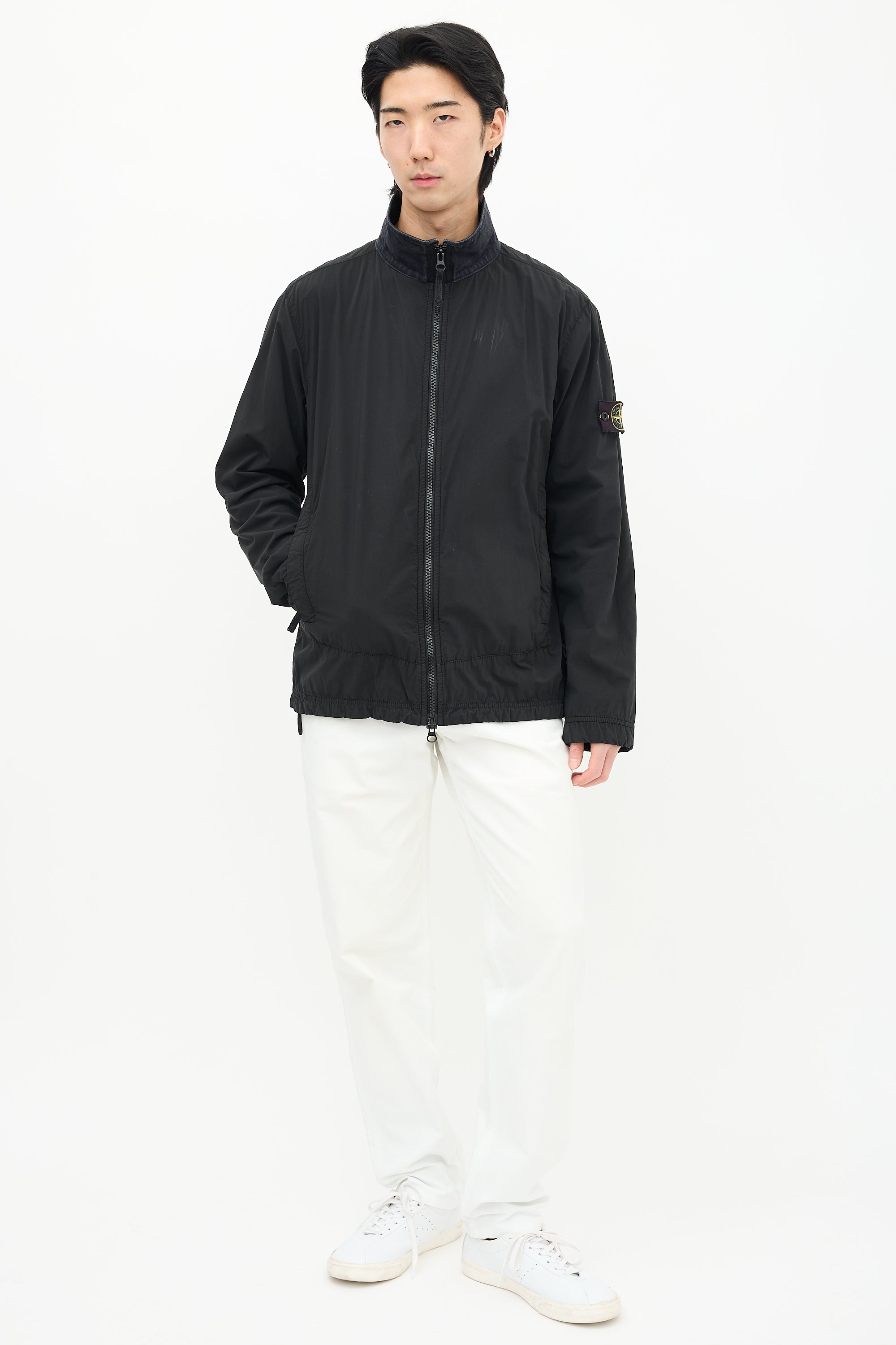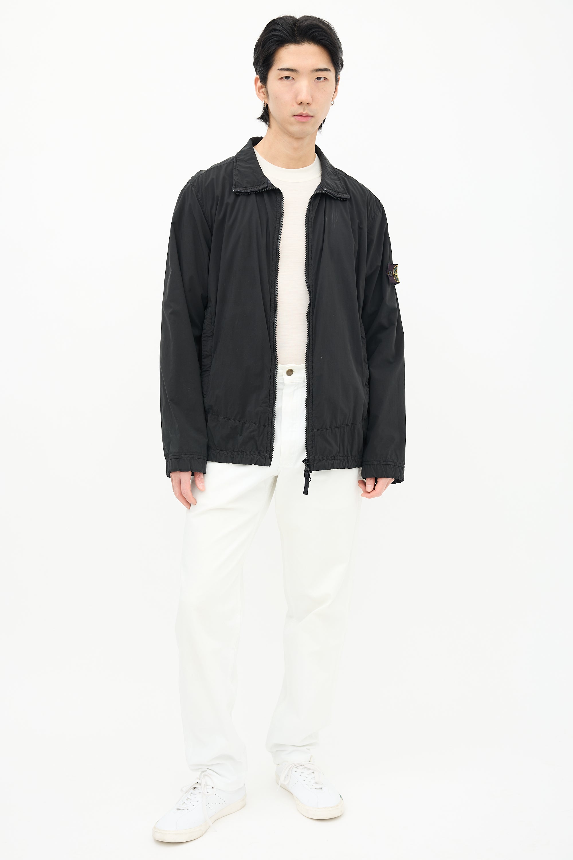 Pre-owned Stone Island black nylon jacket featuring convertible collar, zip up front, signature detachable embroidered logo patch at shoulder, two zip pockets at waist, elasticized button strap at inner cuff, and drawstring hem. Lined.
