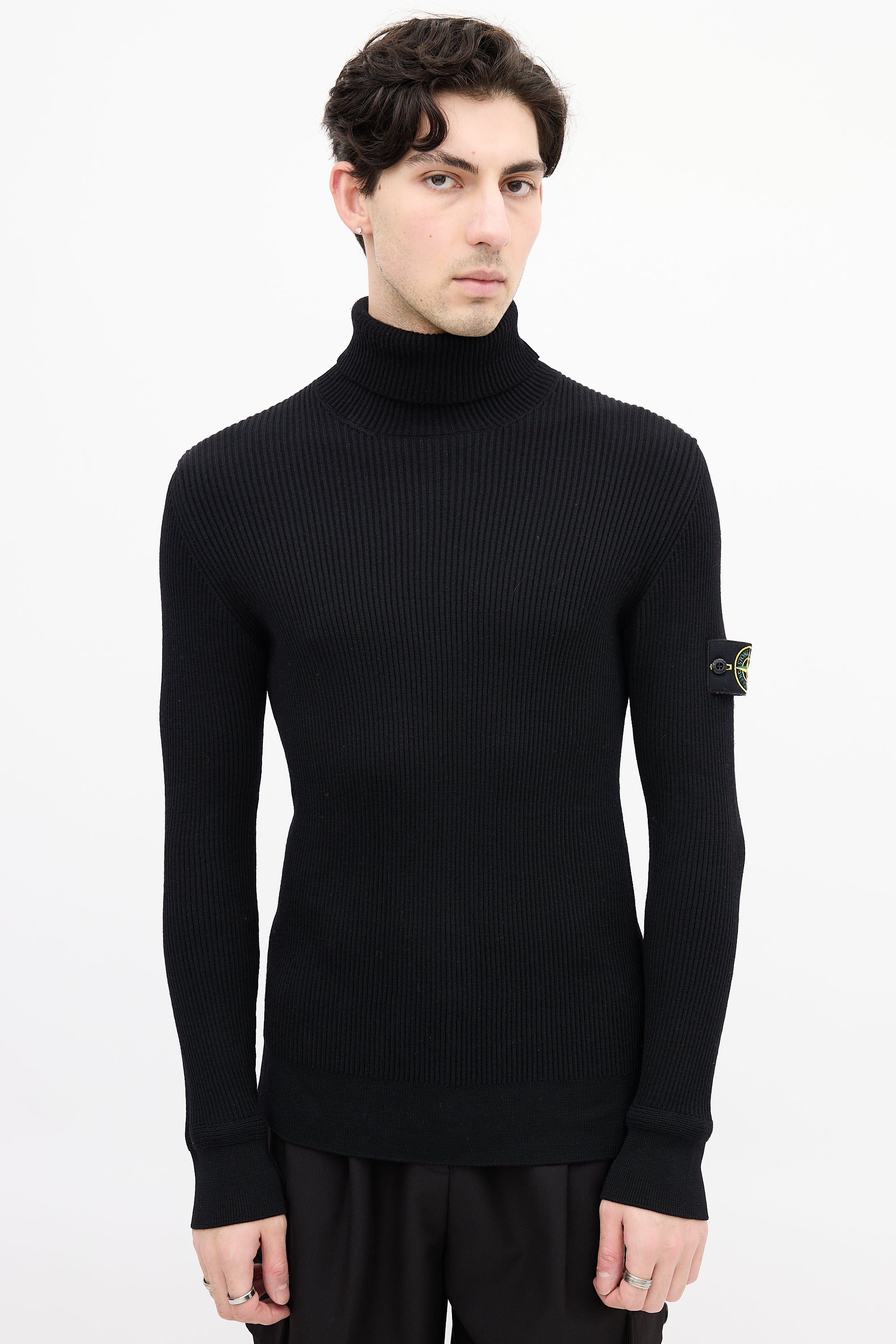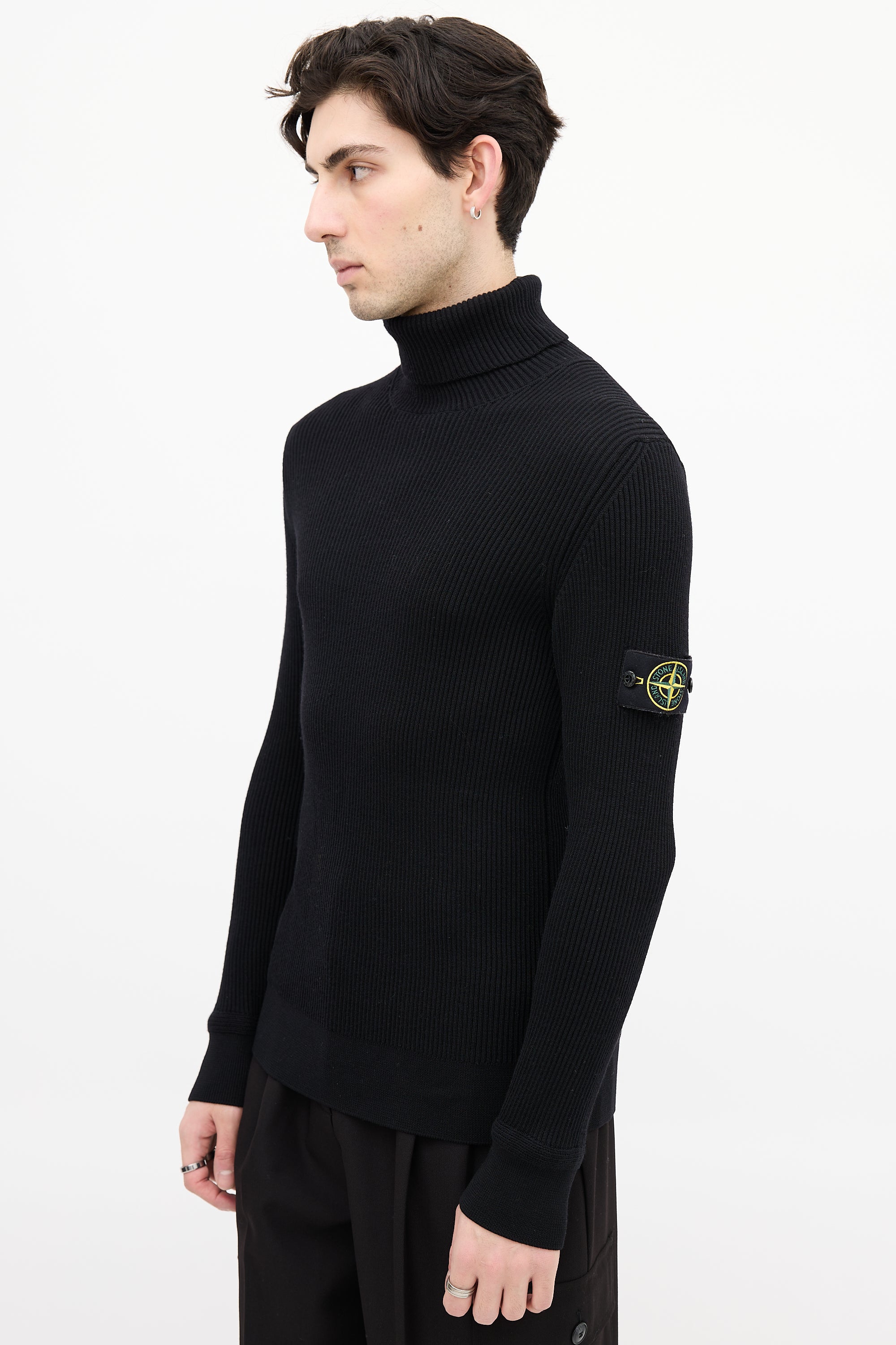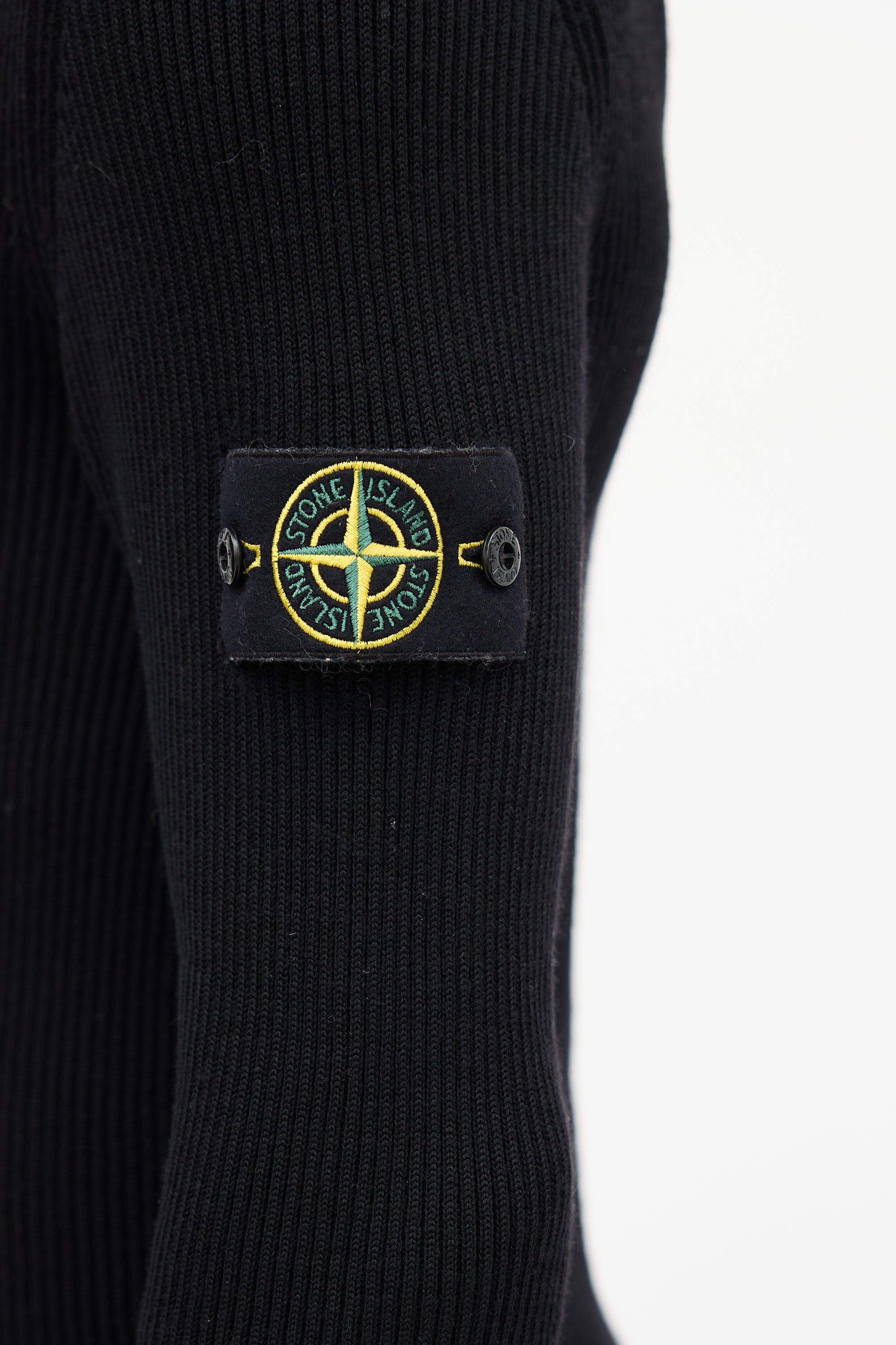 Pre-owned Stone Island black ribbed knit top featuring a turtleneck, signature removable compass motif patch at left arm, and ribbed hem and cuffs.