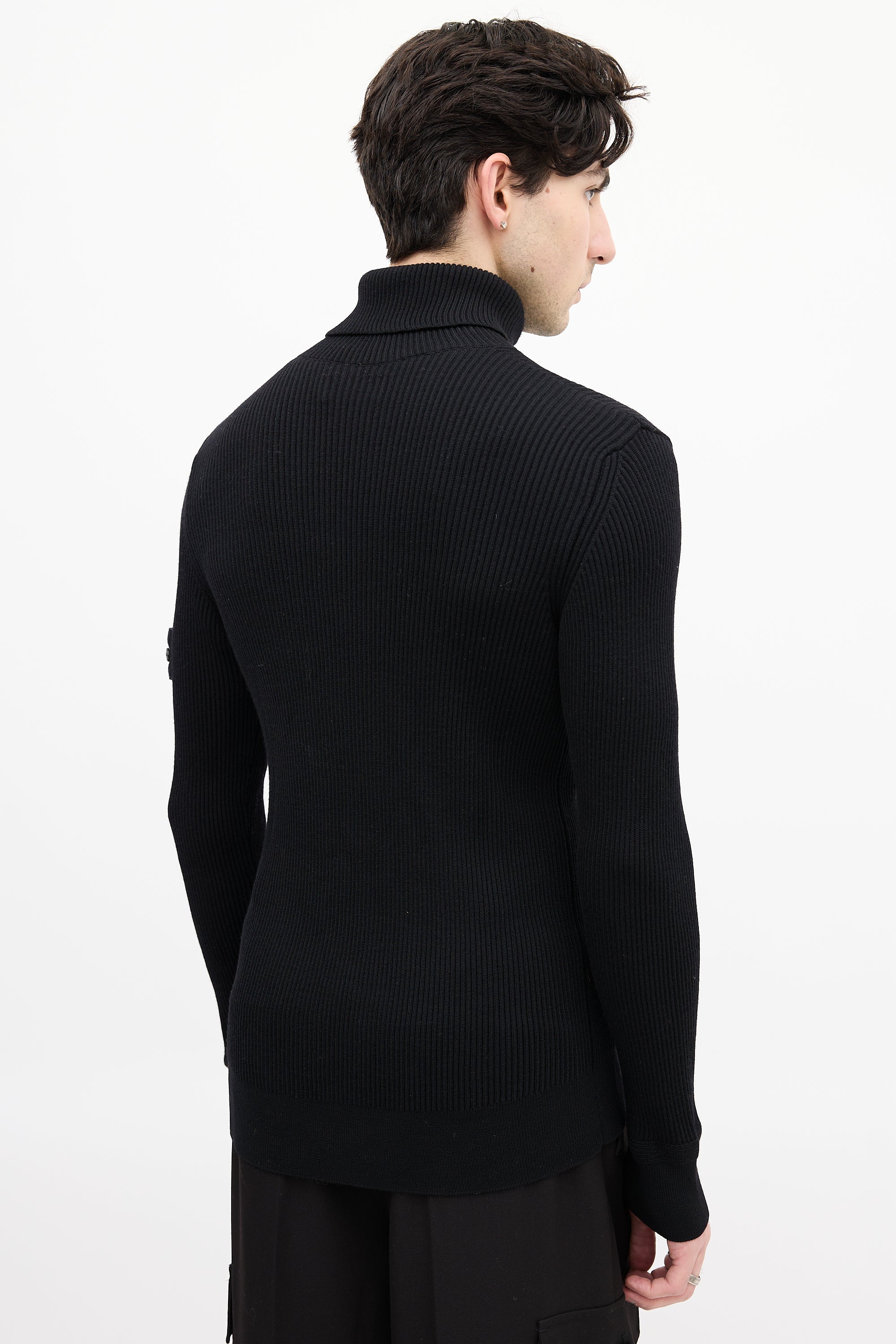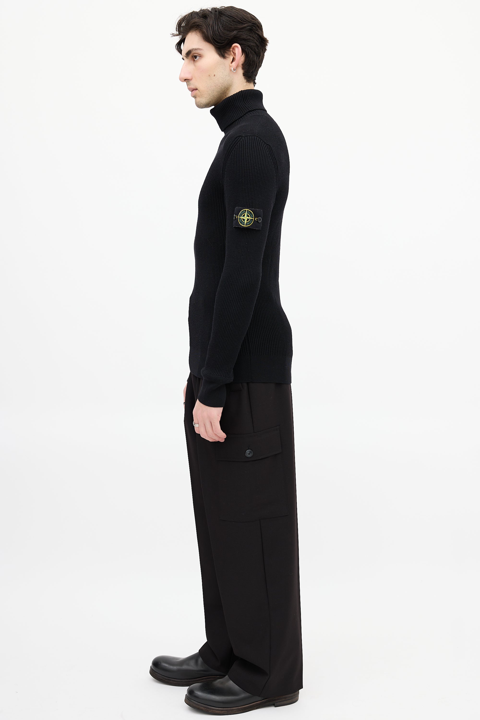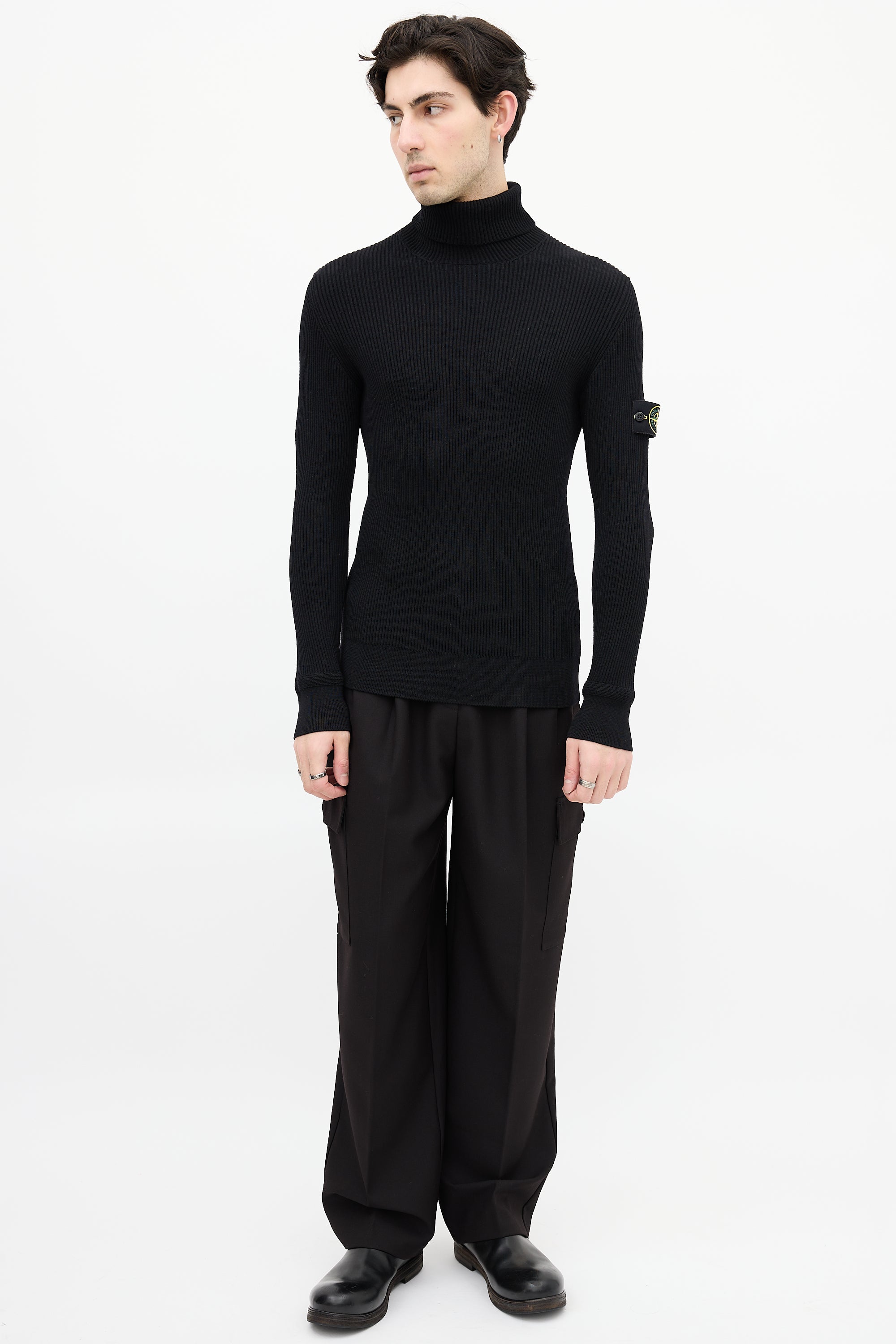 Pre-owned Stone Island black ribbed knit top featuring a turtleneck, signature removable compass motif patch at left arm, and ribbed hem and cuffs.