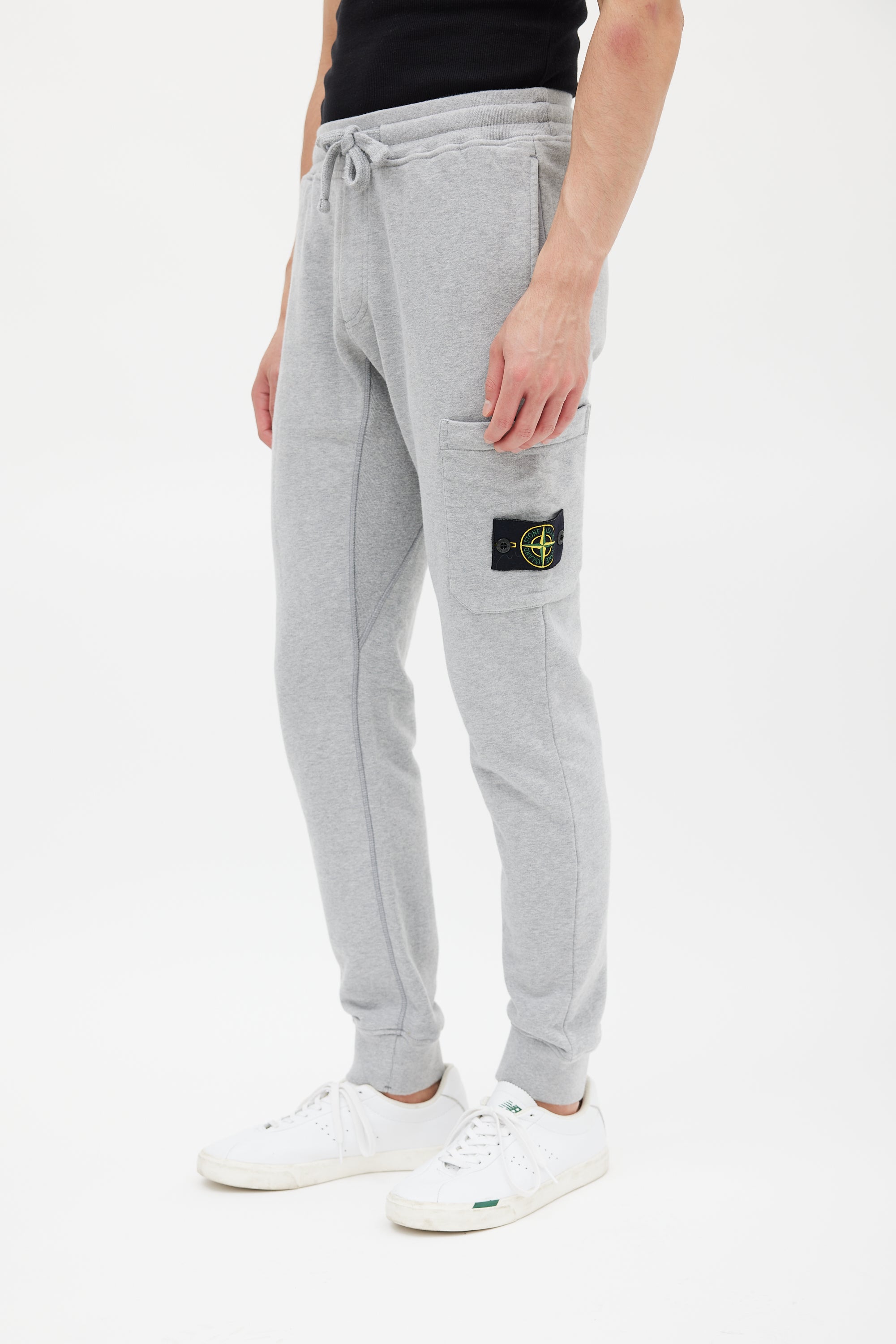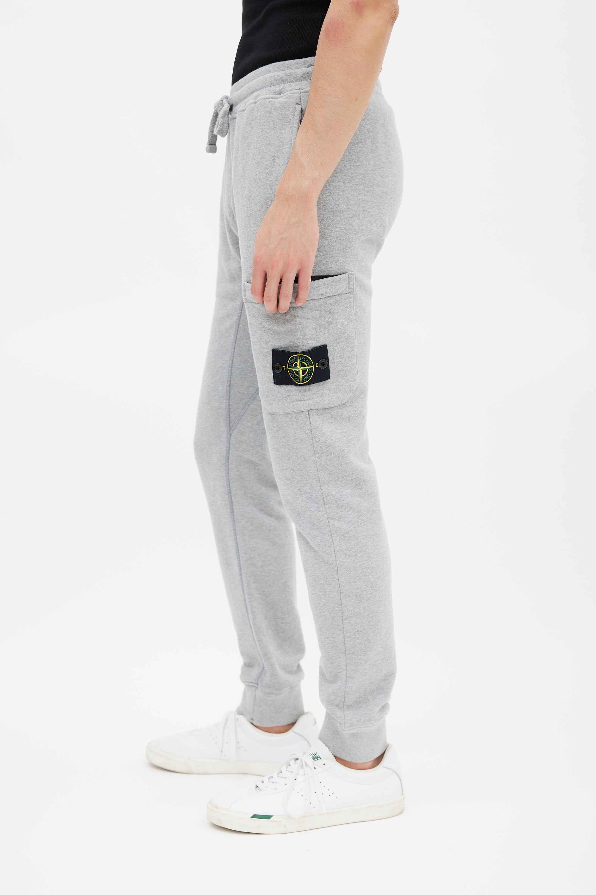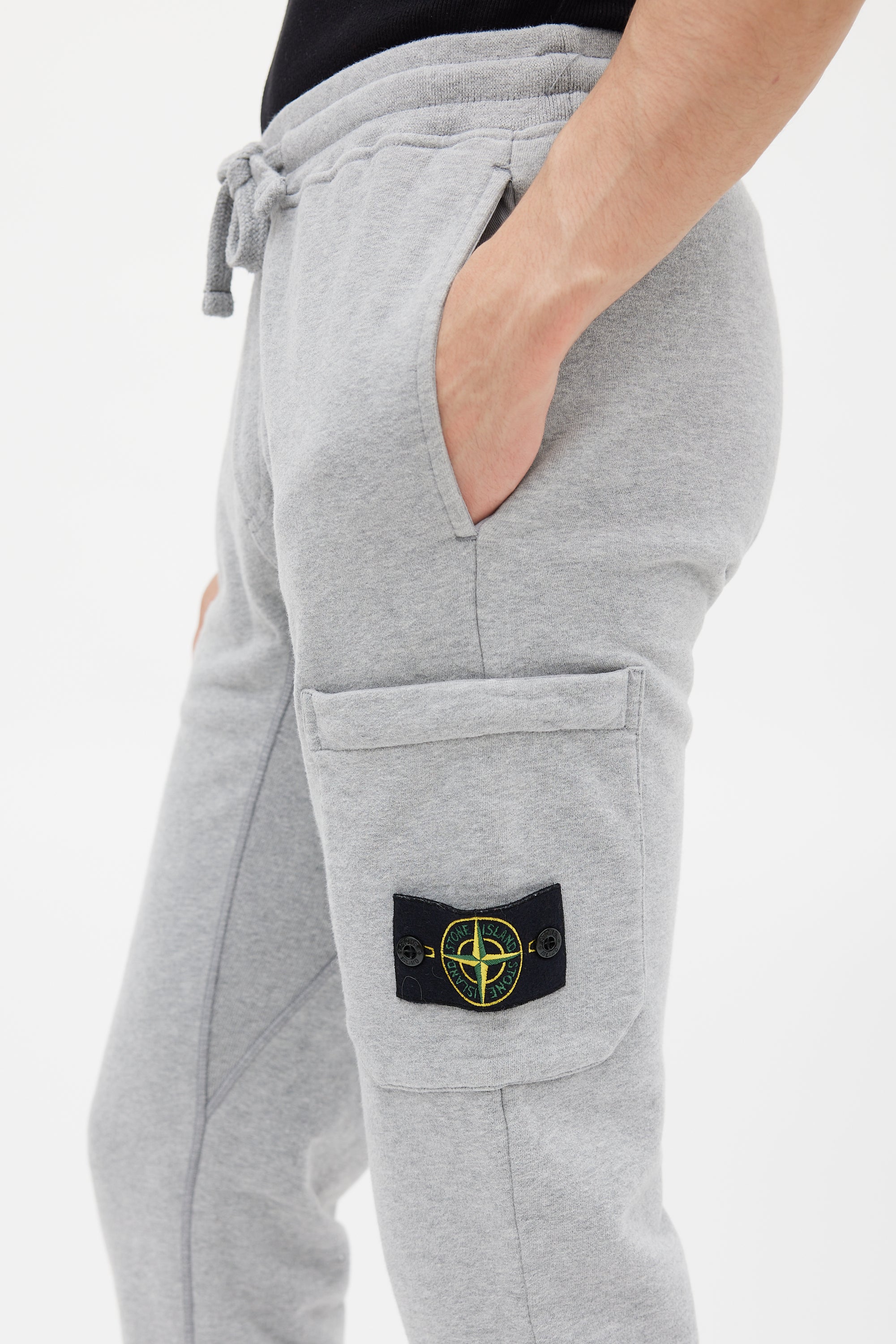 Pre-owned Stone Island grey sweatpants featuring an elasticized drawstring waist, ribbing at seat and cuffs, two in seam pockets, one zip cargo pocket at left leg with detachable signature logo patch, and one zip pocket at back right hip.