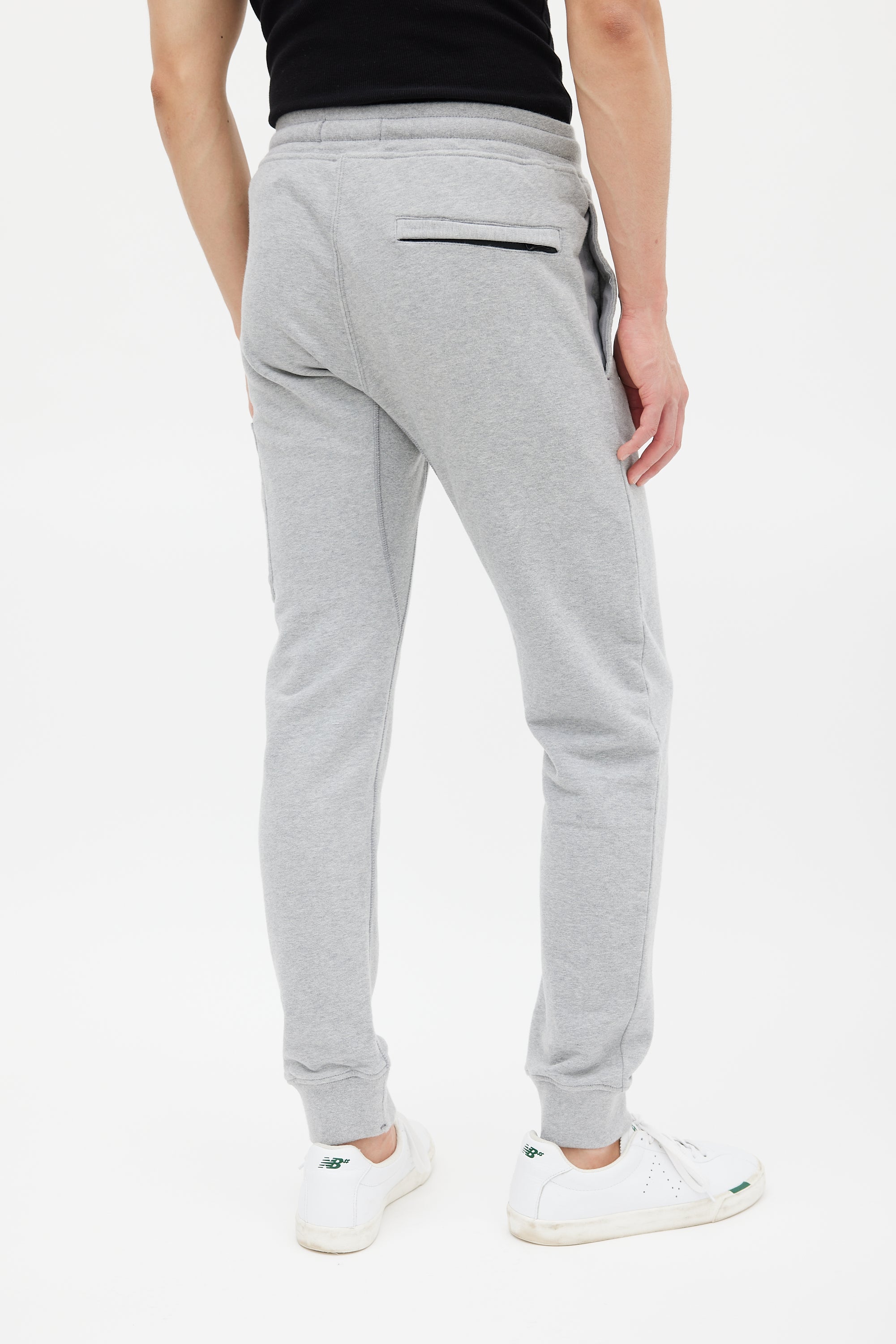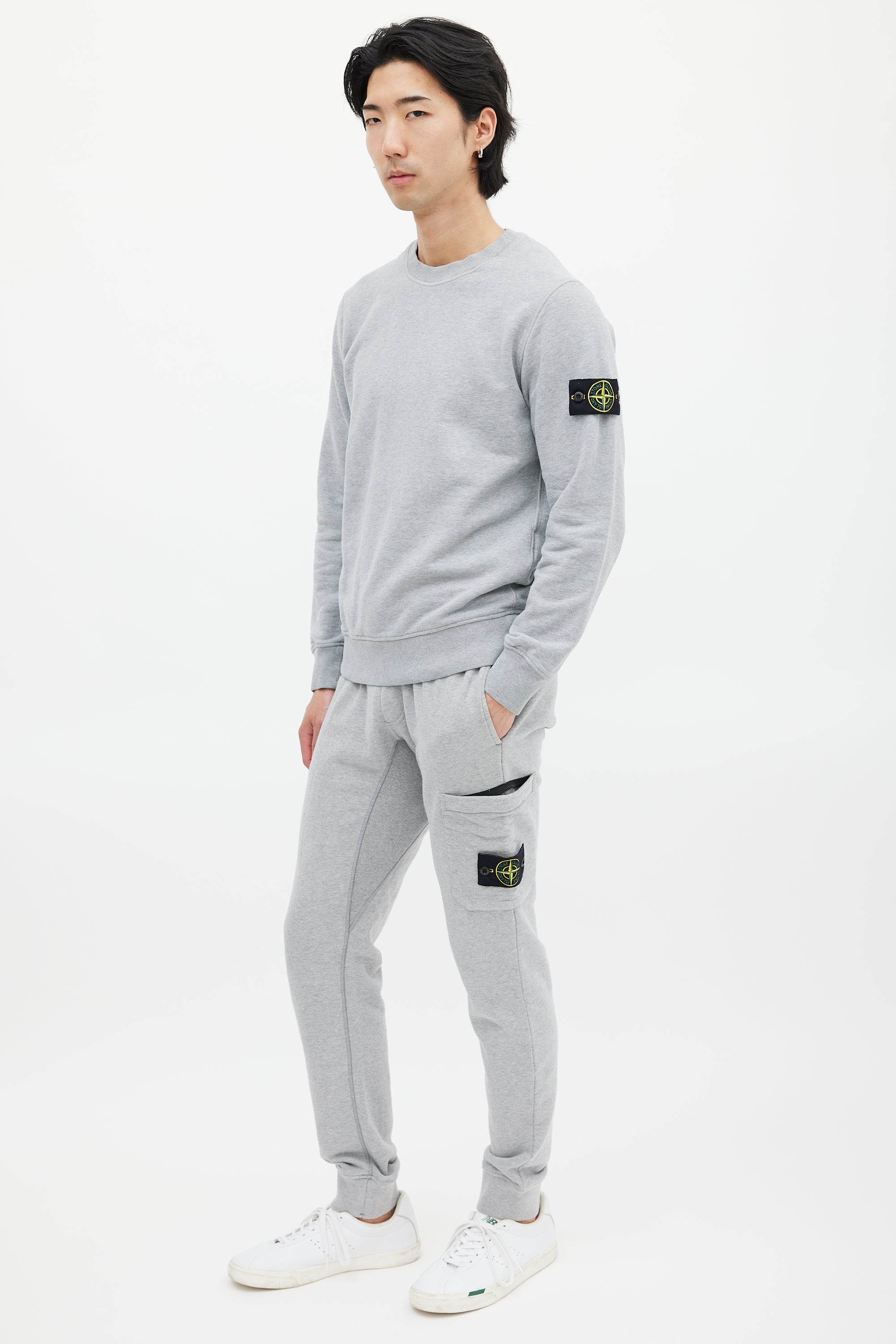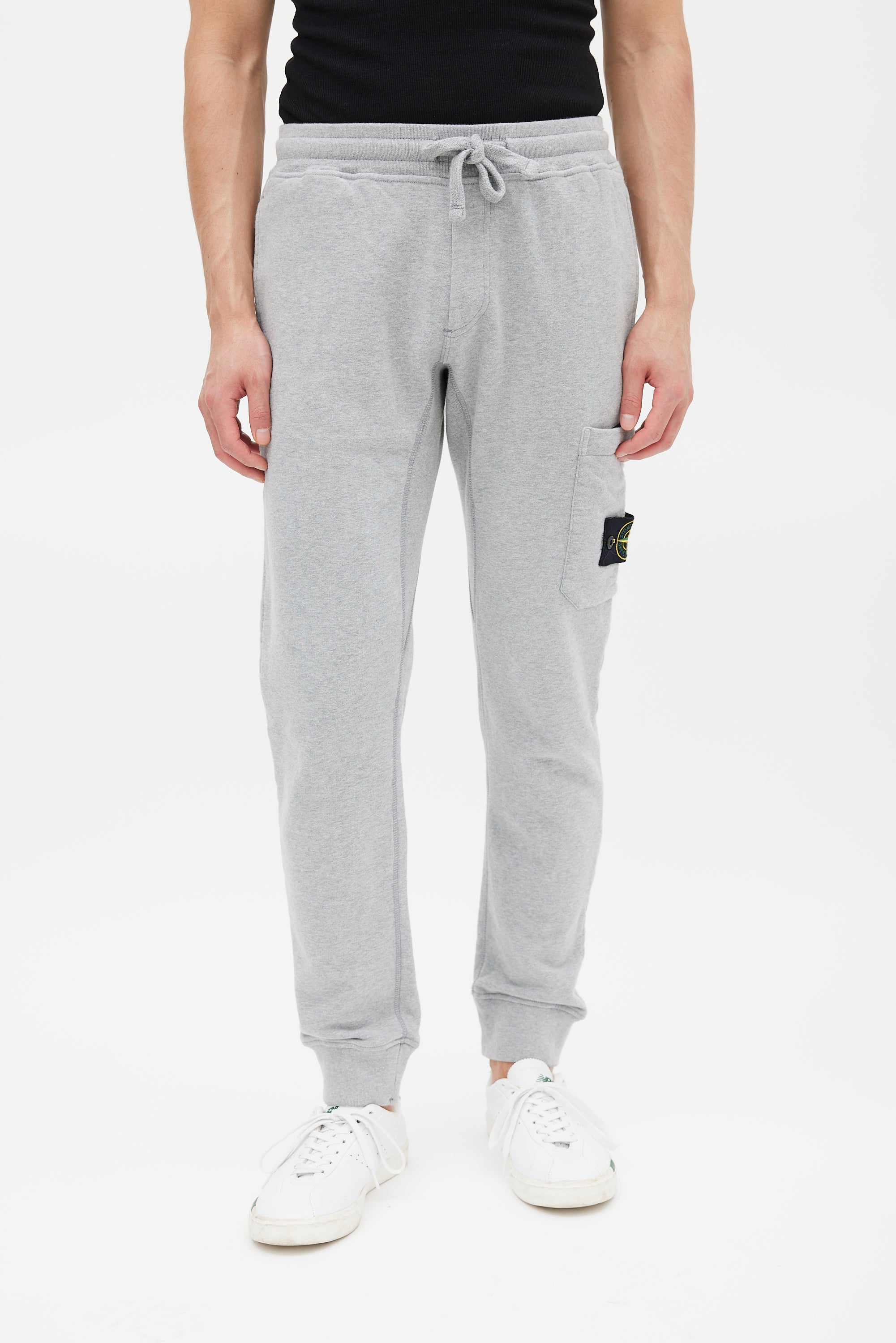 Pre-owned Stone Island grey sweatpants featuring an elasticized drawstring waist, ribbing at seat and cuffs, two in seam pockets, one zip cargo pocket at left leg with detachable signature logo patch, and one zip pocket at back right hip.
